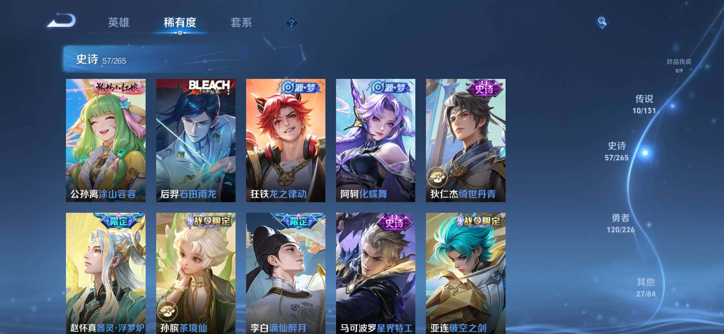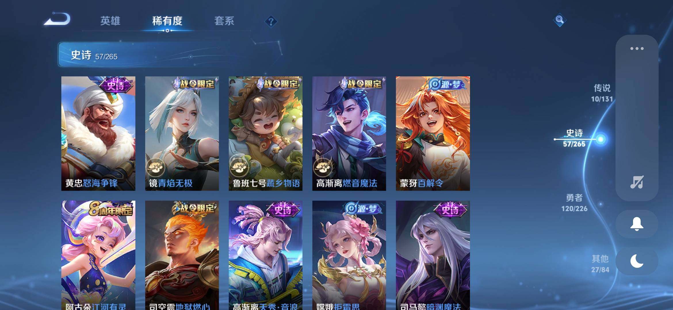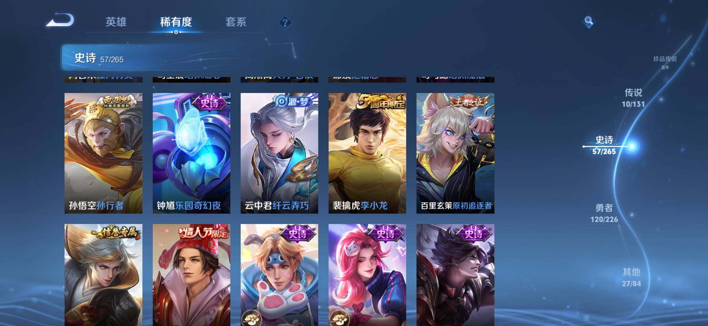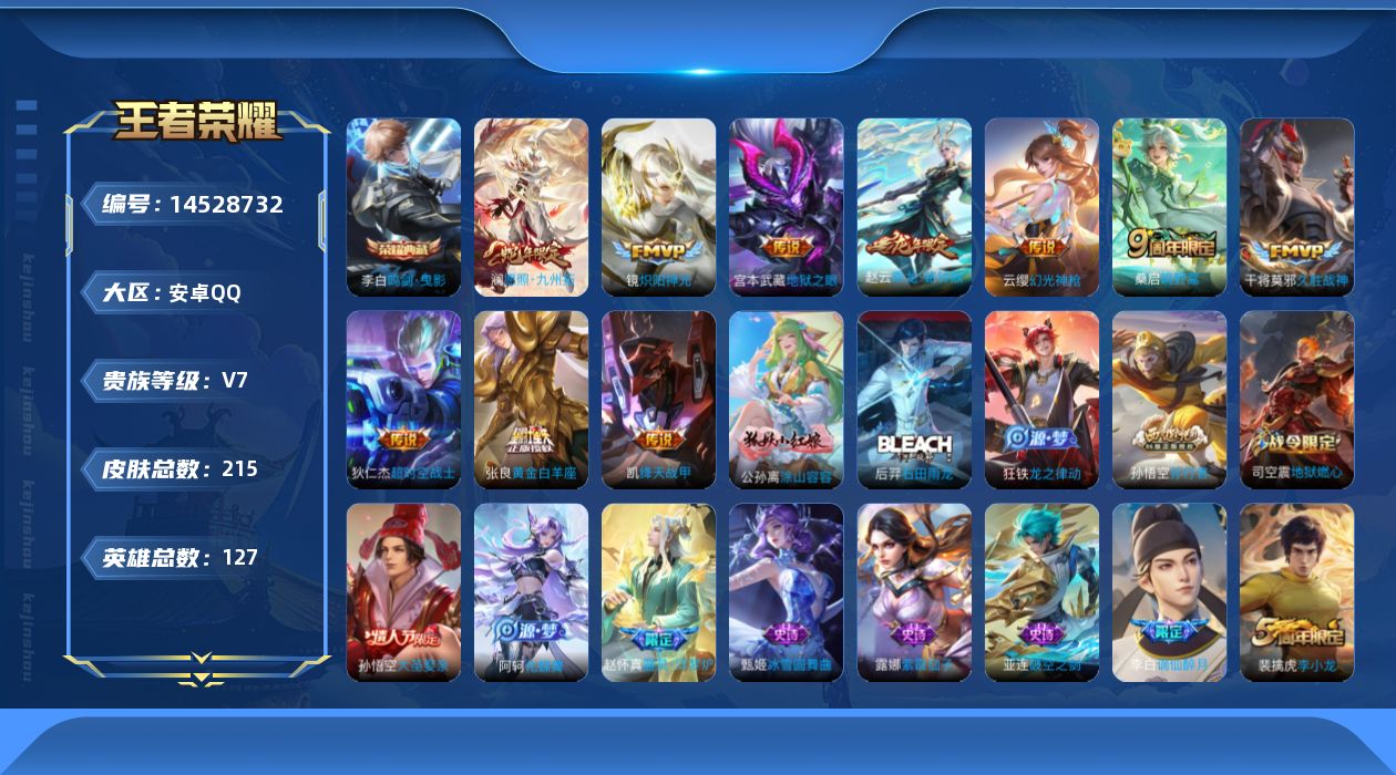 [14528732]安卓q-v7-永恒钻石iii段位-127英雄-215皮肤-1典藏皮肤-10传说-57史诗 【英雄全皮】:空空儿全皮 【荣耀典藏】:李白鸣剑曳影 【传说皮肤】:澜愿照九州拓,云缨幻光神呛,桑启鸣野蒿,赵云乘龙铭钟鼎,铠绛天战甲,镜炽阳神光,张良黄金白羊座,干将莫邪久胜战神,宫本武藏地狱之眼,狄仁杰超时空战士 【限定皮肤】:大乔绒语心约,姜子牙天穹之誓,杨戬破阵退雄兵,李白谪仙醉月,狄仁杰阴阳师,赵云皇家上将,高渐离玩趣恶龙,狄仁杰魔术师,项羽海滩派对,孙悟空大圣娶亲,孙悟空孙行者,李元芳云中旅人,百里玄策原初追逐者,沈梦溪大漠名商,裴擒虎李小龙,裴擒虎擒涛扼浪,云中君纤云弄巧,嫦娥拒霜思,鲁班大师探海日志,桑启海盐诗旅,艾琳流音漫舞,司空震地狱燃心,阿古朵江河有灵,张良古海寻踪,蒙犽百解令,高渐离燃音魔法,妲己灵卜魔法,鬼谷子天穹祈灯,赵云乘龙铭钟鼎,沈梦溪龙舞盛年,鲁班七号蔬乡物语,李元芳蔬乡物语,刘邦剑破天穹,程咬金群星魔术团,镜青焰无极,项羽苍威无极,刘备异域游侠,周瑜熔金海岸 【年限皮肤】:赵云乘龙铭钟鼎 【赛季限定】:张良古海寻踪,李元芳云中旅人,百里玄策原初追逐者,沈梦溪大漠名商,裴擒虎擒涛扼浪,鲁班大师探海日志,桑启海盐诗旅,鬼谷子天穹祈灯,刘邦剑破天穹,姜子牙天穹之誓 【战令限定】:艾琳流音漫舞,司空震地狱燃心,高渐离燃音魔法,妲己灵卜魔法,鲁班七号蔬乡物语,李元芳蔬乡物语,镜青焰无极,项羽苍威无极 【史诗皮肤】:露娜紫霞仙子,赵云皇家上将,赵云未来纪元,貂蝉圣诞恋歌,甄姬冰雪圆舞曲,王昭君偶像歌手,狄仁杰魔术师,宫本武藏鬼剑武藏,孙尚香水果甜心,嬴政暗夜贵公子,嬴政摇滚巨星,妲己女仆咖啡,墨子金属风暴,曹操幽灵船长,吕布末日机甲,张飞乱世虎臣,夏侯惇乘风破浪,小乔缤纷独角兽,兰陵王暗隐猎兽者,诸葛亮黄金分割率,雅典娜冰冠公主,安琪拉心灵骇客,百里守约特工魅影,蔡文姬舞动绿茵,刘禅天才门将,李元芳逐浪之夏,程咬金功夫厨神,白起星夜王子,阿轲节奏热浪,孙策猫狗日记,孙悟空大圣娶亲,狄仁杰鹰眼统帅,百里玄策原初追逐者,裴擒虎李小龙,云中君纤云弄巧,钟馗乐园奇幻夜,孙悟空孙行者,司马懿暗渊魔法,嫦娥拒霜思,高渐离天秀音浪,司空震地狱燃心,阿古朵江河有灵,蒙犽百解令,妲己灵卜魔法,高渐离燃音魔法,鲁班七号蔬乡物语,镜青焰无极,黄忠怒海争锋,亚连破空之剑,马可