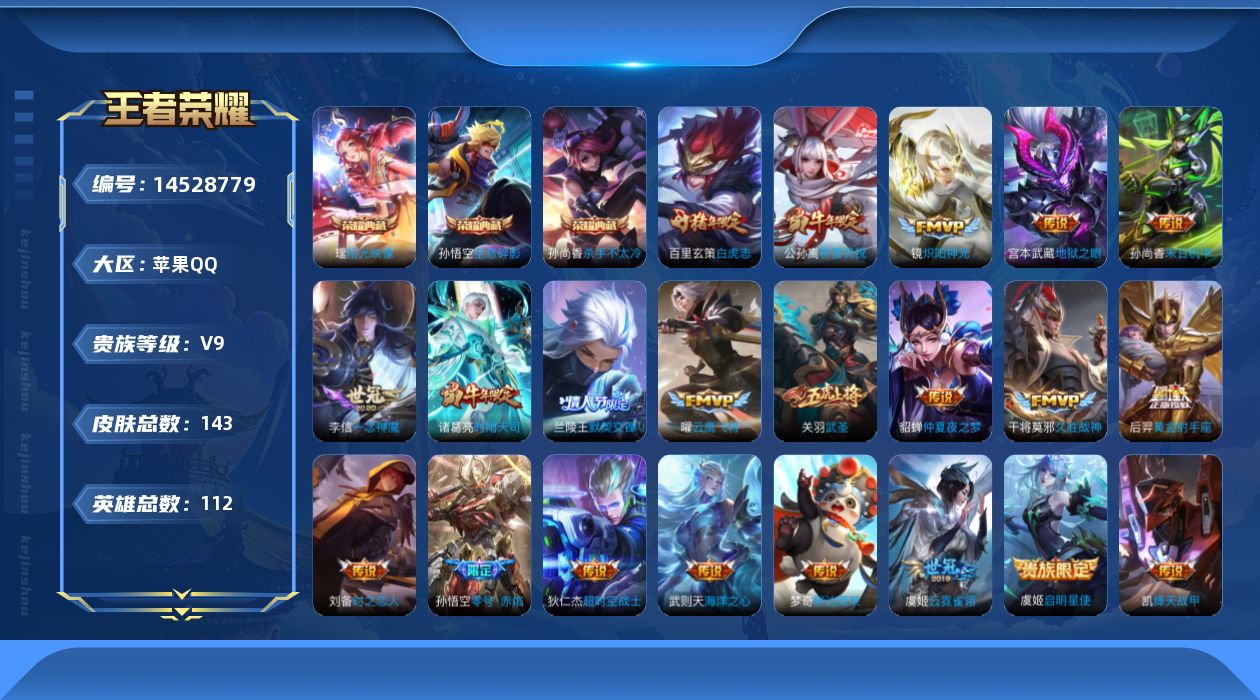[14528779]苹果q-v9-永恒钻石iv段位-112英雄-143皮肤-3典藏皮肤-1典藏英雄-21传说-53史诗 【英雄全皮】:影全皮 【荣耀典藏】:武则天英雄,孙悟空全息碎影,孙尚香杀手不太冷,瑶拾光映像 【传说皮肤】:兰陵王默契交锋,公孙离祈雪灵祝,诸葛亮时雨天司,铠绛天战甲,镜炽阳神光,虞姬启明星使,孙悟空零号赤焰,关羽武圣,曜云鹰飞将,李信一念神魔,刘备时之恋人,干将莫邪久胜战神,虞姬云霓雀翎,百里玄策白虎志,梦奇胖达荣荣,后羿黄金射手座,貂蝉仲夏夜之梦,孙尚香末日机甲,宫本武藏地狱之眼,武则天海洋之心,狄仁杰超时空战士 【限定皮肤】:狄仁杰阴阳师,赵云皇家上将,墨子神迹守卫,高渐离玩趣恶龙,芈月白晶晶,吕布御风骁将,元歌云间偶戏,马可波罗逐梦之星,狄仁杰魔术师,狄仁杰万华元夜,项羽海滩派对,老夫子醍醐杖,老夫子航海奇遇记,关羽武圣,程咬金演武夺筹,兰陵王默契交锋,花木兰默契交锋,亚瑟潮玩骑士王,孙悟空大圣娶亲,孙悟空零号赤焰,牛魔奔雷神使,虞姬霸王别姬,虞姬启明星使,钟馗驱傩正仪,雅典娜单词大作战,鬼谷子原初探秘者,诸葛亮时雨天司,苏烈千军破阵,百里玄策白虎志,百里守约朱雀志,公孙离祈雪灵祝,裴擒虎李小龙,云中君纤云弄巧,蒙犽狂想玩偶喵 【年限皮肤】:百里玄策白虎志,百里守约朱雀志,公孙离祈雪灵祝,吕布御风骁将,牛魔奔雷神使,诸葛亮时雨天司,关羽武圣 【赛季限定】:狄仁杰万华元夜,老夫子醍醐杖,程咬金演武夺筹,钟馗驱傩正仪,鬼谷子原初探秘者,苏烈千军破阵 【战令限定】:墨子神迹守卫,元歌云间偶戏,老夫子航海奇遇记,亚瑟潮玩骑士王,雅典娜单词大作战,蒙犽狂想玩偶喵 【史诗皮肤】:鲁班七号电玩小子,露娜紫霞仙子,赵云皇家上将,甄姬冰雪圆舞曲,王昭君偶像歌手,狄仁杰魔术师,宫本武藏鬼剑武藏,孙尚香水果甜心,嬴政暗夜贵公子,妲己魅力维加斯,墨子金属风暴,吕布圣诞狂欢,曹操幽灵船长,李白千年之狐,张飞乱世虎臣,韩信白龙吟,虞姬霸王别姬,花木兰水晶猎龙者,小乔缤纷独角兽,兰陵王暗隐猎兽者,诸葛亮黄金分割率,马可波罗逐梦之星,亚瑟心灵战警,雅典娜冰冠公主,安琪拉心灵骇客,百里守约特工魅影,铠曙光守护者,蔡文姬舞动绿茵,刘禅天才门将,李元芳逐浪之夏,程咬金功夫厨神,白起星夜王子,阿轲节奏热浪,孙策猫狗日记,百里守约朱雀志,孙悟空大圣娶亲,狄仁杰鹰眼统帅,公孙离无限星赏官,娜可露露晚萤
