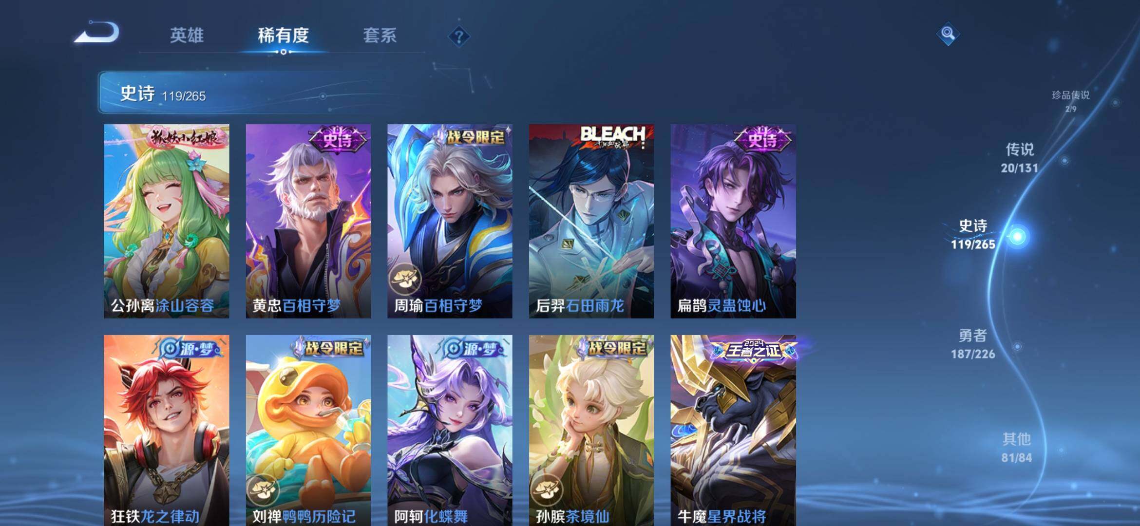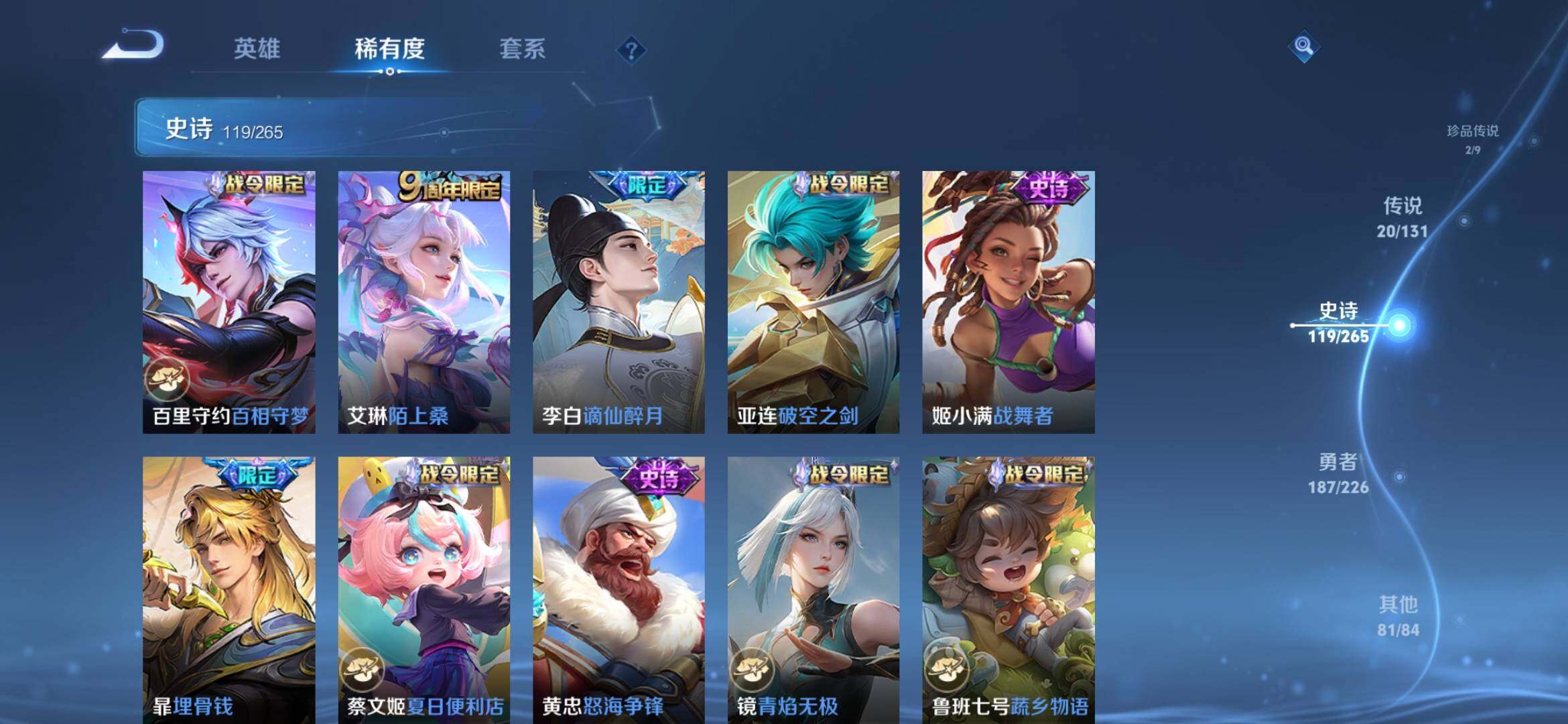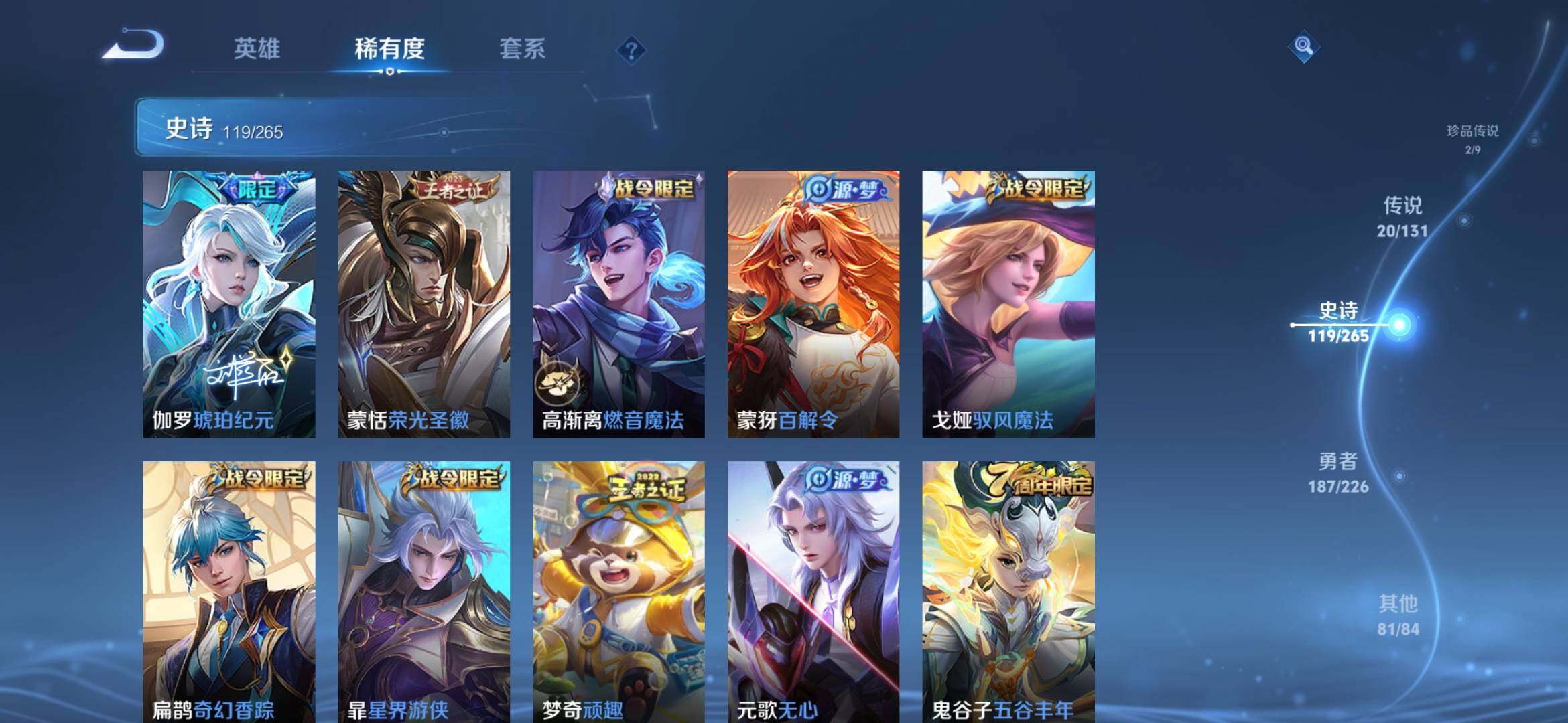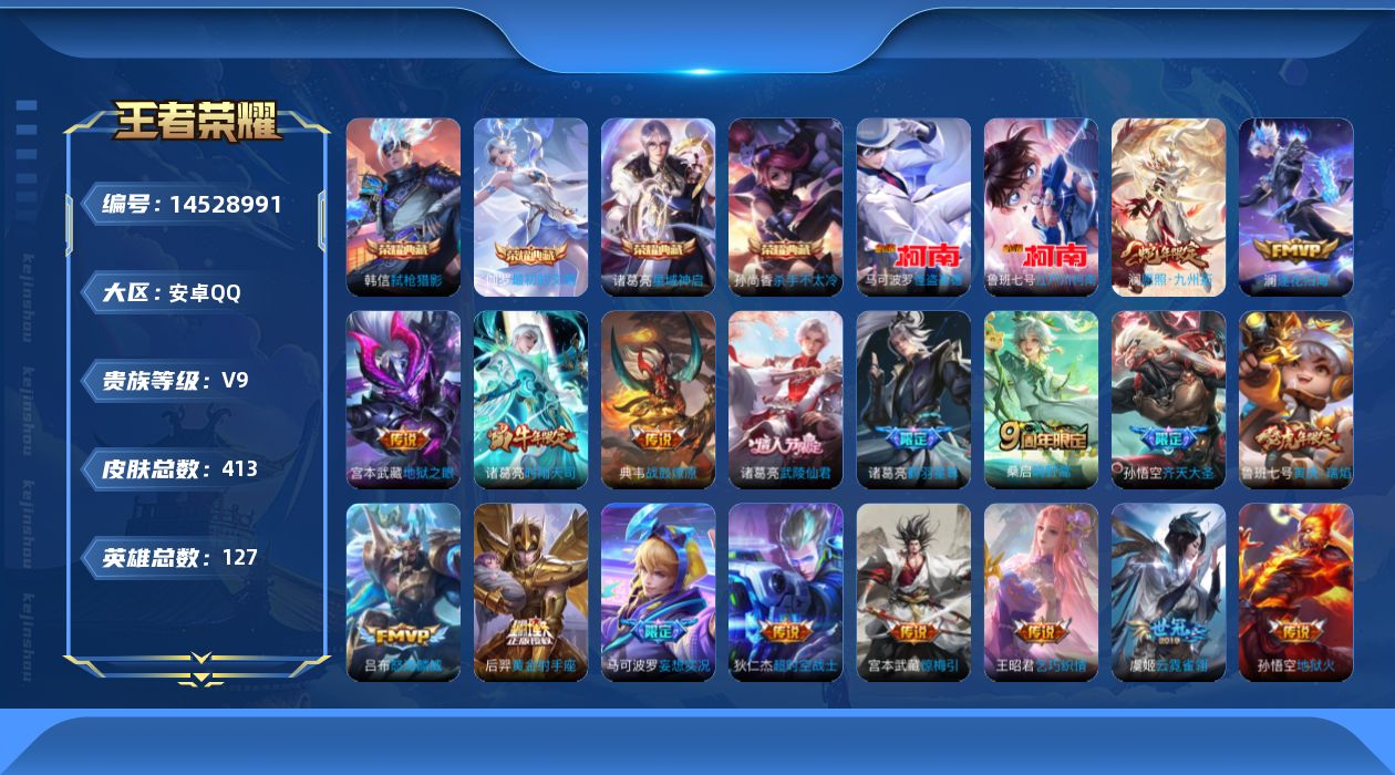 [14528991]安卓q-v9-最强王者段位-127英雄-413皮肤-4典藏皮肤-2珍品传说-20传说-119史诗 【英雄全皮】:孙权全皮,钟馗全皮,鬼谷子全皮,狂铁全皮,蒙恬全皮,戈娅全皮,空空儿全皮,影全皮 【荣耀典藏】:孙尚香杀手不太冷,诸葛亮星域神启,韩信弑呛猎影,伽罗最初的交响 【珍品传说】:马可波罗怪盗基德,鲁班七号江户川柯南 【传说皮肤】:澜愿照九州拓,桑启鸣野蒿,典韦战鼓燎原,澜逐花归海,宫本武藏惊梅引,马可波罗妄想实况,诸葛亮鹤羽星尊,孙悟空齐天大圣,吕布怒海麟威,鲁班七号寅虎瑞焰,王昭君乞巧织情,诸葛亮时雨天司,铠绛天战甲,虞姬启明星使,虞姬云霓雀翎,后羿黄金射手座,诸葛亮武陵仙君,宫本武藏地狱之眼,孙悟空地狱火,狄仁杰超时空战士 【限定皮肤】:白起狰,暃埋骨钱,蔡文姬夏日便利店,大乔绒语心约,虞姬夏日便利店,姜子牙天穹之誓,李白谪仙醉月,狄仁杰阴阳师,赵云皇家上将,赵云百木心呛,墨子神迹守卫,嬴政优雅恋人,孙尚香蔷薇恋人,鲁班七号狮舞东方,鲁班七号寅虎瑞焰,庄周高山流水,钟无艳超时空战士,扁鹊奇幻香踪,白起夜都怪侠,芈月幻夜卜梦,元歌云间偶戏,元歌无心,夏侯惇朔风刀,甄姬游园惊梦,甄姬落雪兰心,曹操烛龙,典韦穷奇,典韦蓝屏警告,马可波罗妄想实况,狄仁杰魔术师,狄仁杰万华元夜,达摩星际陆战队,达摩沙漠行僧,项羽海滩派对,老夫子醍醐杖,老夫子航海奇遇记,程咬金演武夺筹,韩信逐梦之影,王昭君午后时光,兰陵王金庭之子,孙悟空至尊宝,孙悟空大圣娶亲,孙悟空孙行者,孙悟空齐天大圣,牛魔御旌,后羿辉光之辰,李元芳银河之约,李元芳云中旅人,虞姬启明星使,钟馗神迹守卫,钟馗驱傩正仪,杨戬潮玩骑兵,女娲朔望之晖,雅典娜黎明之约,蔡文姬繁星吟游,太乙真人饕餮,鬼谷子原初探秘者,鬼谷子五谷丰年,诸葛亮武陵仙君,诸葛亮时雨天司,诸葛亮鹤羽星尊,黄忠火炮绅士,铠青龙志,苏烈千军破阵,百里玄策原初追逐者,弈星混沌棋,梦奇顽趣,公孙离玉兔公主,沈梦溪星空之诺,沈梦溪大漠名商,明世隐疑决卦,明世隐吟游魔法,裴擒虎天狼狩猎者,裴擒虎李小龙,裴擒虎擒涛扼浪,狂铁御狮,狂铁电玩高手,米莱狄御霄,米莱狄胡桃异想国,云中君纤云弄巧,伽罗天狼溯光者,盾山御銮,猪八戒西部大镖客,上官婉儿梁祝,嫦娥拒霜思,嫦娥暖冬兔眠,西施玲珑珍味,鲁班大师探海日志,桑启海盐诗旅,暃星界游侠,戈娅驭风魔法,艾琳女武神,张良古