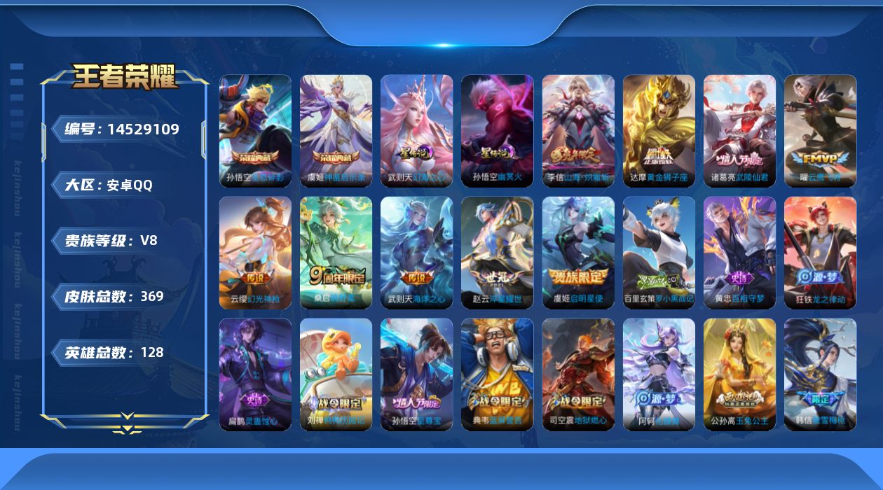 [14529109]安卓q-v8-最强王者段位-128英雄-369皮肤-2典藏皮肤-1典藏英雄-10传说-111史诗 【英雄全皮】:刘禅全皮,达摩全皮,刘邦全皮,哪吒全皮,雅典娜全皮,蒙恬全皮,阿古朵全皮,戈娅全皮,影全皮 【荣耀典藏】:武则天英雄,孙悟空全息碎影,虞姬神鉴启示录 【传说皮肤】:后羿神树通天,云缨幻光神呛,桑启鸣野蒿,李信山海炽霜斩,赵云淬星耀世,虞姬启明星使,曜云鹰飞将,达摩黄金狮子座,诸葛亮武陵仙君,武则天海洋之心 【限定皮肤】:蔡文姬夏日便利店,大乔绒语心约,虞姬夏日便利店,姜子牙天穹之誓,杨戬破阵退雄兵,李白谪仙醉月,狄仁杰阴阳师,赵云皇家上将,赵云引擎之心,孙尚香蔷薇恋人,钟无艳王者之锤,钟无艳超时空战士,扁鹊奇幻香踪,白起夜都怪侠,芈月幻夜卜梦,吕布猎兽之王,元歌无心,甄姬落雪兰心,典韦蓝屏警告,狄仁杰魔术师,达摩星际陆战队,达摩沙漠行僧,项羽海滩派对,老夫子航海奇遇记,刘邦夺宝奇兵,韩信飞衡,韩信傲雪梅呛,王昭君午后时光,兰陵王金庭之子,孙悟空至尊宝,李元芳银河之约,李元芳云中旅人,虞姬启明星使,杨戬潮玩骑兵,哪吒逐梦之翼,干将莫邪胡桃夹子,干将莫邪真爱魔法,雅典娜单词大作战,雅典娜黎明之约,太乙真人华丽摇滚,鬼谷子五谷丰年,诸葛亮武陵仙君,大乔白鹤梁神女,黄忠火炮绅士,百里玄策原初追逐者,梦奇顽趣,公孙离玉兔公主,沈梦溪大漠名商,明世隐吟游魔法,裴擒虎李小龙,裴擒虎擒涛扼浪,狂铁电玩高手,云中君纤云弄巧,李信山海炽霜斩,盾山梦圆繁星,上官婉儿梁祝,嫦娥拒霜思,嫦娥暖冬兔眠,西施玲珑珍味,鲁班大师探海日志,桑启海盐诗旅,暃星界游侠,戈娅驭风魔法,艾琳流音漫舞,司空震地狱燃心,阿古朵江河有灵,张良古海寻踪,蒙犽百解令,蒙恬荣光圣徽,高渐离燃音魔法,妲己灵卜魔法,鬼谷子天穹祈灯,伽罗琥珀纪元,姬小满妄想食味,沈梦溪龙舞盛年,鲁班七号蔬乡物语,李元芳蔬乡物语,刘邦剑破天穹,程咬金群星魔术团,镜青焰无极,项羽苍威无极,刘备异域游侠,周瑜熔金海岸 【年限皮肤】:韩信飞衡,李信山海炽霜斩 【赛季限定】:达摩沙漠行僧,兰陵王金庭之子,张良古海寻踪,李元芳云中旅人,雅典娜黎明之约,百里玄策原初追逐者,梦奇顽趣,沈梦溪大漠名商,裴擒虎擒涛扼浪,鲁班大师探海日志,桑启海盐诗旅,鬼谷子天穹祈灯,蒙恬荣光圣徽,刘邦剑破天穹,姜子牙天穹之誓 【战令限定】:蔡文姬夏日便利店,虞姬夏
