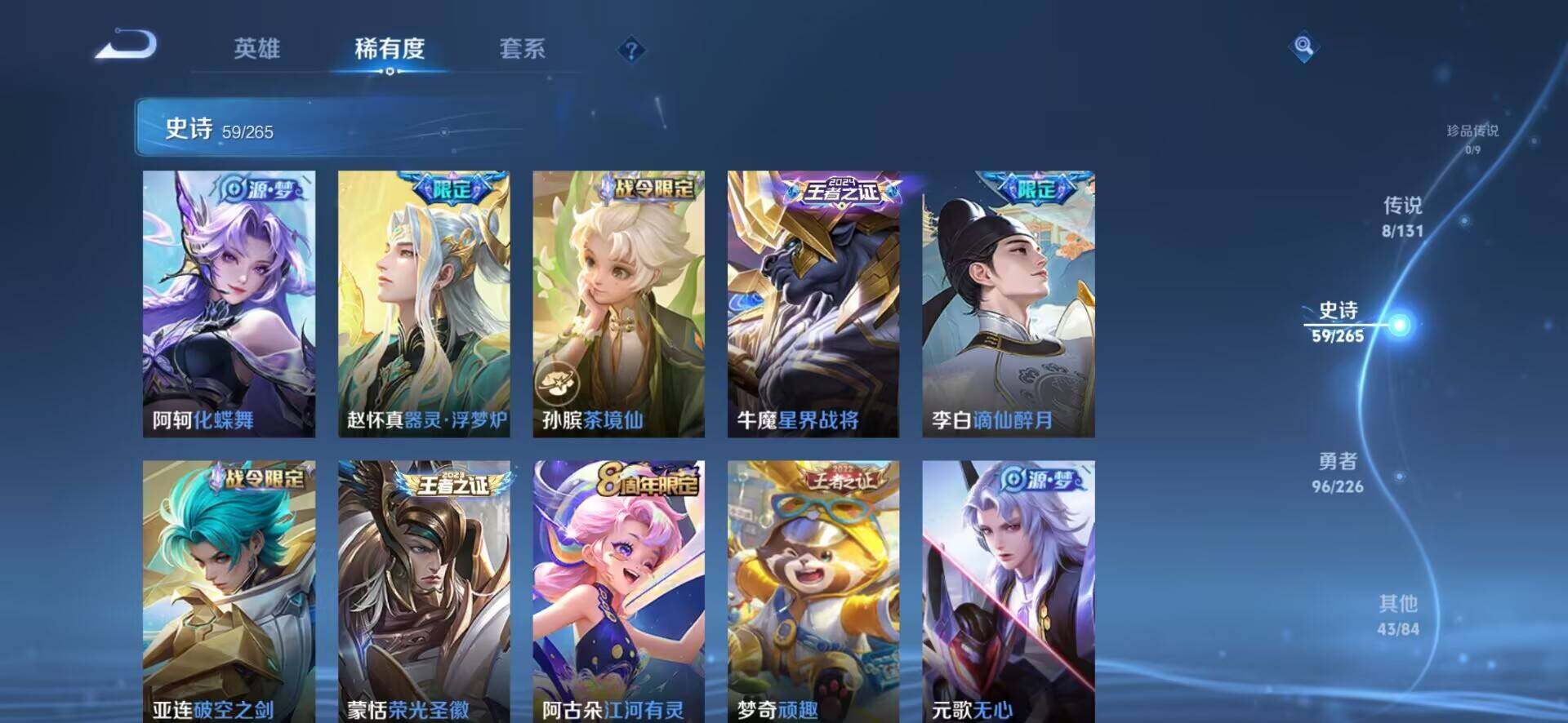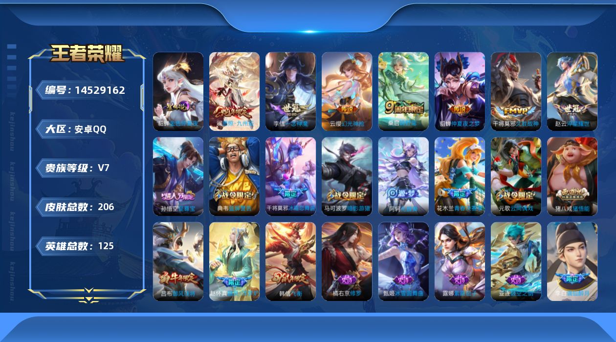 [14529162]安卓q-v7-永恒钻石ii段位-125英雄-206皮肤-8传说-59史诗 【传说皮肤】:后羿神树通天,澜愿照九州拓,云缨幻光神呛,桑启鸣野蒿,赵云淬星耀世,李信一念神魔,干将莫邪久胜战神,貂蝉仲夏夜之梦 【限定皮肤】:姜子牙天穹之誓,李白谪仙醉月,狄仁杰阴阳师,赵云皇家上将,墨子神迹守卫,嬴政优雅恋人,阿轲迷踪丽影,钟无艳王者之锤,芈月重明,吕布御风骁将,元歌云间偶戏,元歌无心,夏侯惇朔风刀,典韦穷奇,典韦蓝屏警告,马可波罗暗影游猎,狄仁杰魔术师,狄仁杰万华元夜,达摩星际陆战队,达摩沙漠行僧,项羽海滩派对,老夫子醍醐杖,老夫子航海奇遇记,程咬金演武夺筹,刘邦夺宝奇兵,韩信飞衡,兰陵王金庭之子,花木兰青春决赛季,亚瑟潮玩骑士王,孙悟空至尊宝,牛魔御旌,后羿圣弓游侠,李元芳银河之约,李元芳云中旅人,钟馗驱傩正仪,干将莫邪冰霜恋舞曲,干将莫邪真爱魔法,雅典娜单词大作战,雅典娜黎明之约,鬼谷子原初探秘者,苏烈千军破阵,百里玄策原初追逐者,弈星混沌棋,梦奇顽趣,沈梦溪星空之诺,沈梦溪大漠名商,明世隐疑决卦,裴擒虎李小龙,裴擒虎擒涛扼浪,狂铁御狮,米莱狄御霄,云中君纤云弄巧,盾山御銮,猪八戒西部大镖客,猪八戒猪悟能,上官婉儿梁祝,蒙犽狂想玩偶喵,鲁班大师探海日志,桑启海盐诗旅,阿古朵江河有灵,张良古海寻踪,蒙恬荣光圣徽,鬼谷子天穹祈灯,刘邦剑破天穹 【年限皮肤】:吕布御风骁将,韩信飞衡 【赛季限定】:芈月重明,夏侯惇朔风刀,典韦穷奇,狄仁杰万华元夜,达摩沙漠行僧,老夫子醍醐杖,程咬金演武夺筹,兰陵王金庭之子,张良古海寻踪,牛魔御旌,李元芳云中旅人,钟馗驱傩正仪,雅典娜黎明之约,鬼谷子原初探秘者,苏烈千军破阵,百里玄策原初追逐者,弈星混沌棋,梦奇顽趣,沈梦溪大漠名商,明世隐疑决卦,裴擒虎擒涛扼浪,狂铁御狮,米莱狄御霄,盾山御銮,鲁班大师探海日志,桑启海盐诗旅,鬼谷子天穹祈灯,蒙恬荣光圣徽,刘邦剑破天穹,姜子牙天穹之誓 【战令限定】:墨子神迹守卫,阿轲迷踪丽影,元歌云间偶戏,典韦蓝屏警告,马可波罗暗影游猎,达摩星际陆战队,老夫子航海奇遇记,刘邦夺宝奇兵,亚瑟潮玩骑士王,后羿圣弓游侠,李元芳银河之约,干将莫邪真爱魔法,雅典娜单词大作战,沈梦溪星空之诺,猪八戒西部大镖客,蒙犽狂想玩偶喵 【史诗皮肤】:露娜紫霞仙子,钟无艳王者之锤,赵云皇家上将,赵云未来纪元,貂蝉圣诞恋歌,甄姬冰雪圆舞