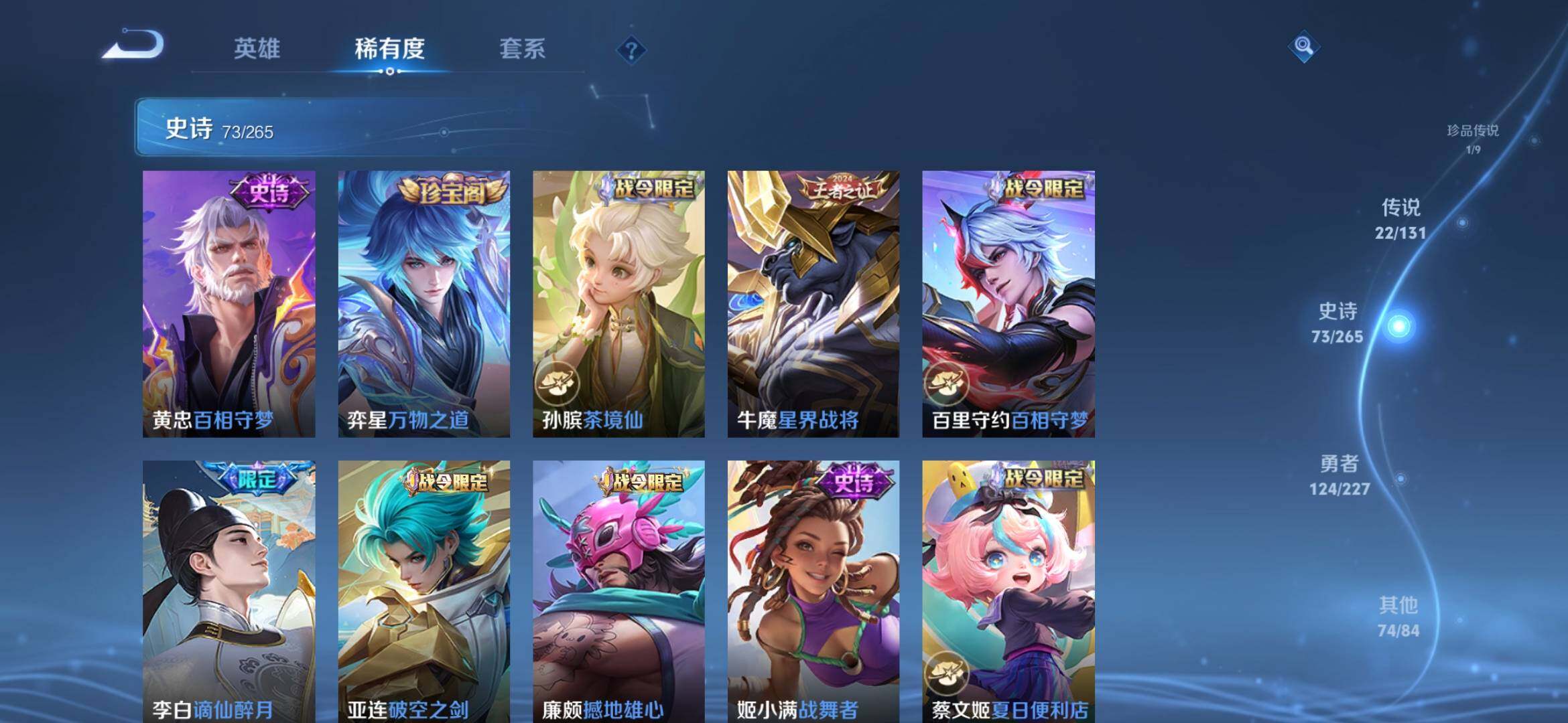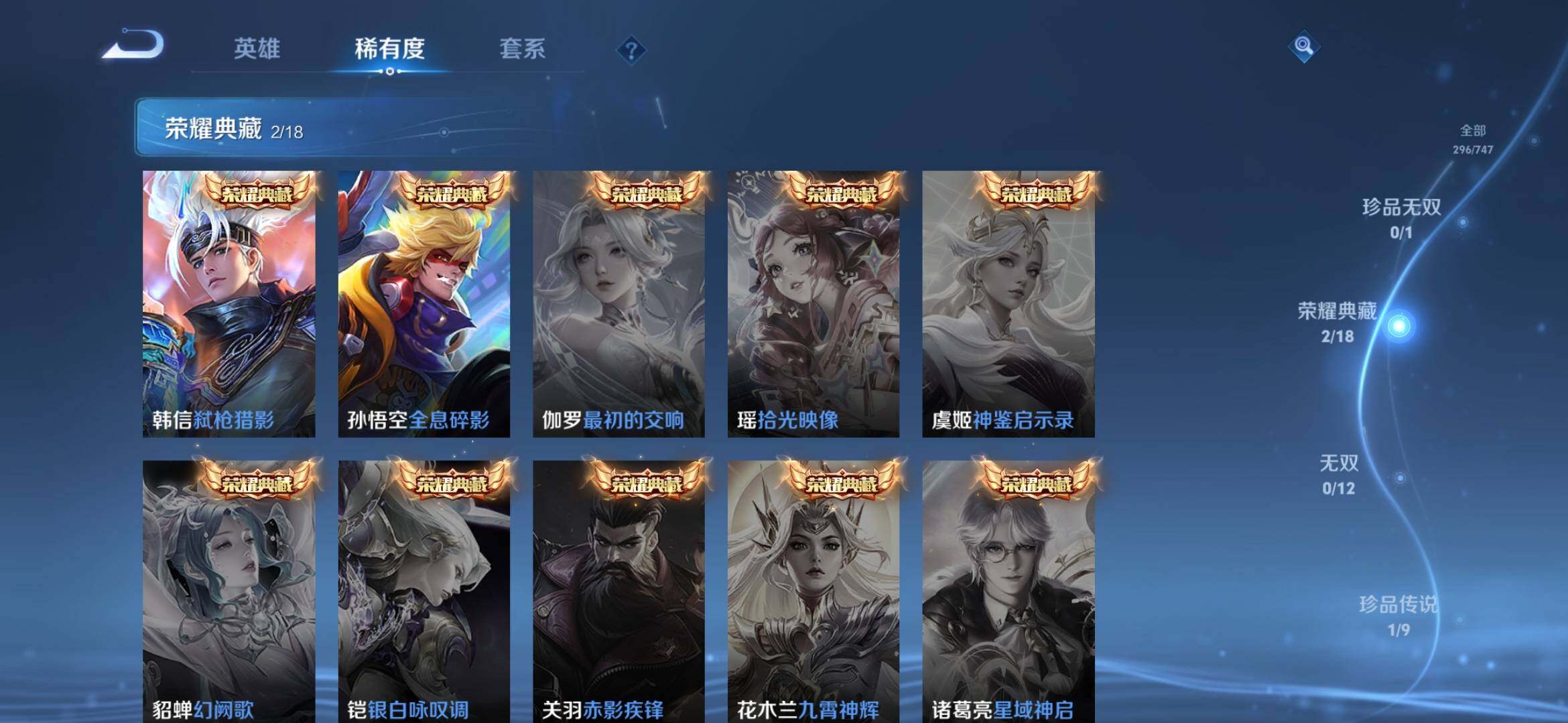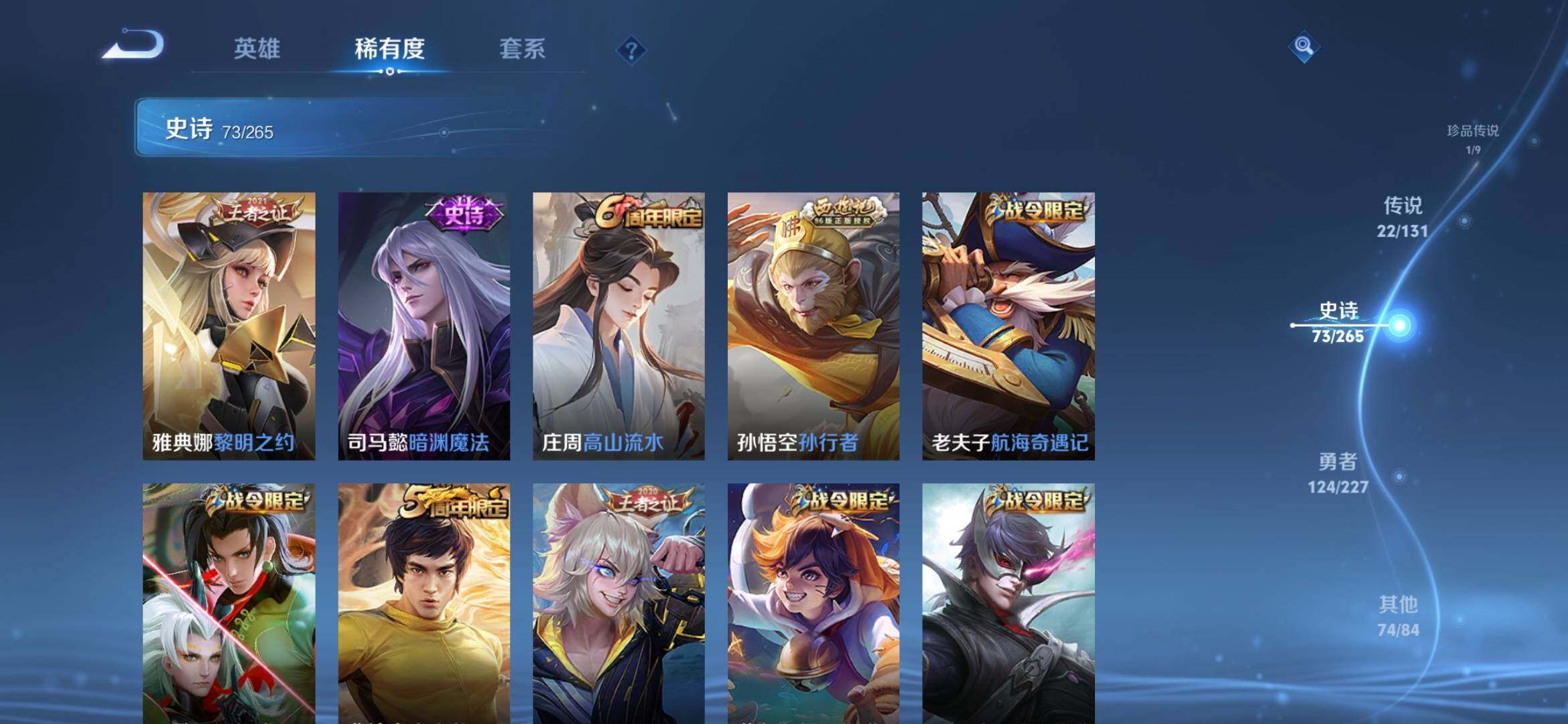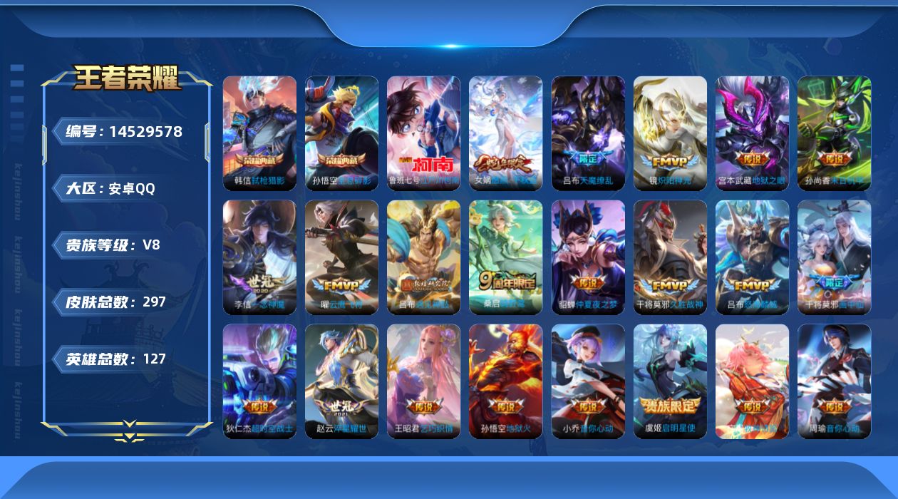 [14529578]安卓q-v8-至尊星耀iv段位-127英雄-296皮肤-2典藏皮肤-1珍品传说-22传说-73史诗 【荣耀典藏】:孙悟空全息碎影,韩信弑呛猎影 【珍品传说】:鲁班七号江户川柯南 【传说皮肤】:女娲愿照千秋盛,桑启鸣野蒿,庄周牧神诗旅,吕布遇见神鼓,干将莫邪画中仙,吕布怒海麟威,赵云淬星耀世,王昭君乞巧织情,周瑜音你心动,小乔音你心动,铠绛天战甲,镜炽阳神光,虞姬启明星使,曜云鹰飞将,李信一念神魔,干将莫邪久胜战神,貂蝉仲夏夜之梦,孙尚香末日机甲,宫本武藏地狱之眼,孙悟空地狱火,吕布天魔缭乱,狄仁杰超时空战士 【限定皮肤】:蔡文姬夏日便利店,大乔绒语心约,虞姬夏日便利店,姜子牙天穹之誓,李白谪仙醉月,狄仁杰阴阳师,赵云皇家上将,赵云引擎之心,墨子神迹守卫,嬴政白昼王子,孙尚香蔷薇恋人,庄周高山流水,高渐离玩趣恶龙,阿轲迷踪丽影,钟无艳超时空战士,芈月重明,吕布天魔缭乱,吕布猎兽之王,吕布遇见神鼓,元歌云间偶戏,元歌无心,夏侯惇朔风刀,甄姬落雪兰心,曹操烛龙,马可波罗暗影游猎,狄仁杰魔术师,狄仁杰万华元夜,达摩沙漠行僧,项羽海滩派对,老夫子醍醐杖,老夫子航海奇遇记,程咬金演武夺筹,兰陵王金庭之子,亚瑟潮玩骑士王,孙悟空大圣娶亲,孙悟空孙行者,李元芳银河之约,李元芳云中旅人,虞姬启明星使,钟馗神迹守卫,钟馗驱傩正仪,女娲朔望之晖,干将莫邪画中仙,雅典娜单词大作战,雅典娜黎明之约,鬼谷子原初探秘者,鬼谷子五谷丰年,苏烈千军破阵,百里玄策原初追逐者,弈星混沌棋,沈梦溪大漠名商,明世隐疑决卦,裴擒虎李小龙,裴擒虎擒涛扼浪,狂铁御狮,米莱狄御霄,猪八戒西部大镖客,上官婉儿梁祝,嫦娥暖冬兔眠,蒙犽狂想玩偶喵,鲁班大师探海日志,桑启海盐诗旅,暃星界游侠,张良古海寻踪,鬼谷子天穹祈灯,沈梦溪龙舞盛年,鲁班七号蔬乡物语,李元芳蔬乡物语,刘邦剑破天穹,程咬金群星魔术团,关羽决胜骁骑,镜青焰无极,项羽苍威无极,刘备异域游侠,周瑜熔金海岸 【年限皮肤】:马超神威 【赛季限定】:芈月重明,夏侯惇朔风刀,曹操烛龙,狄仁杰万华元夜,达摩沙漠行僧,老夫子醍醐杖,程咬金演武夺筹,兰陵王金庭之子,张良古海寻踪,李元芳云中旅人,钟馗驱傩正仪,雅典娜黎明之约,鬼谷子原初探秘者,苏烈千军破阵,百里玄策原初追逐者,弈星混沌棋,沈梦溪大漠名商,明世隐疑决卦,裴擒虎擒涛扼浪,狂铁御狮,米莱狄御霄,鲁班大师探海日志,