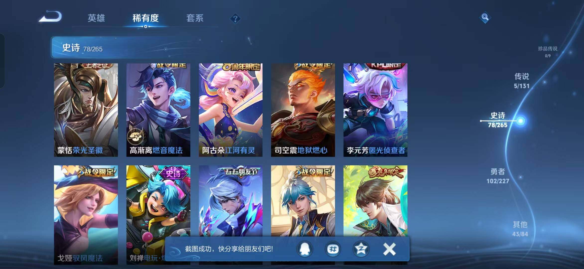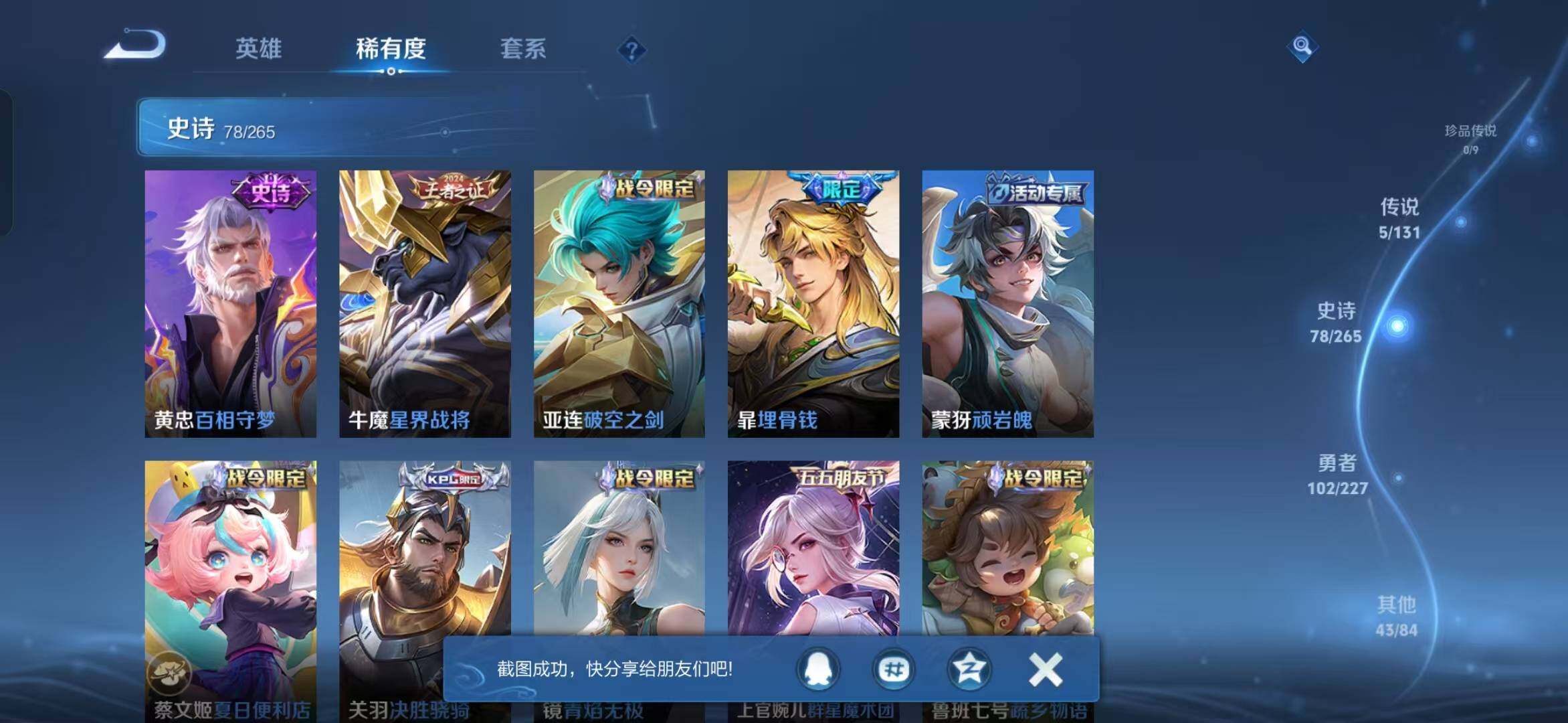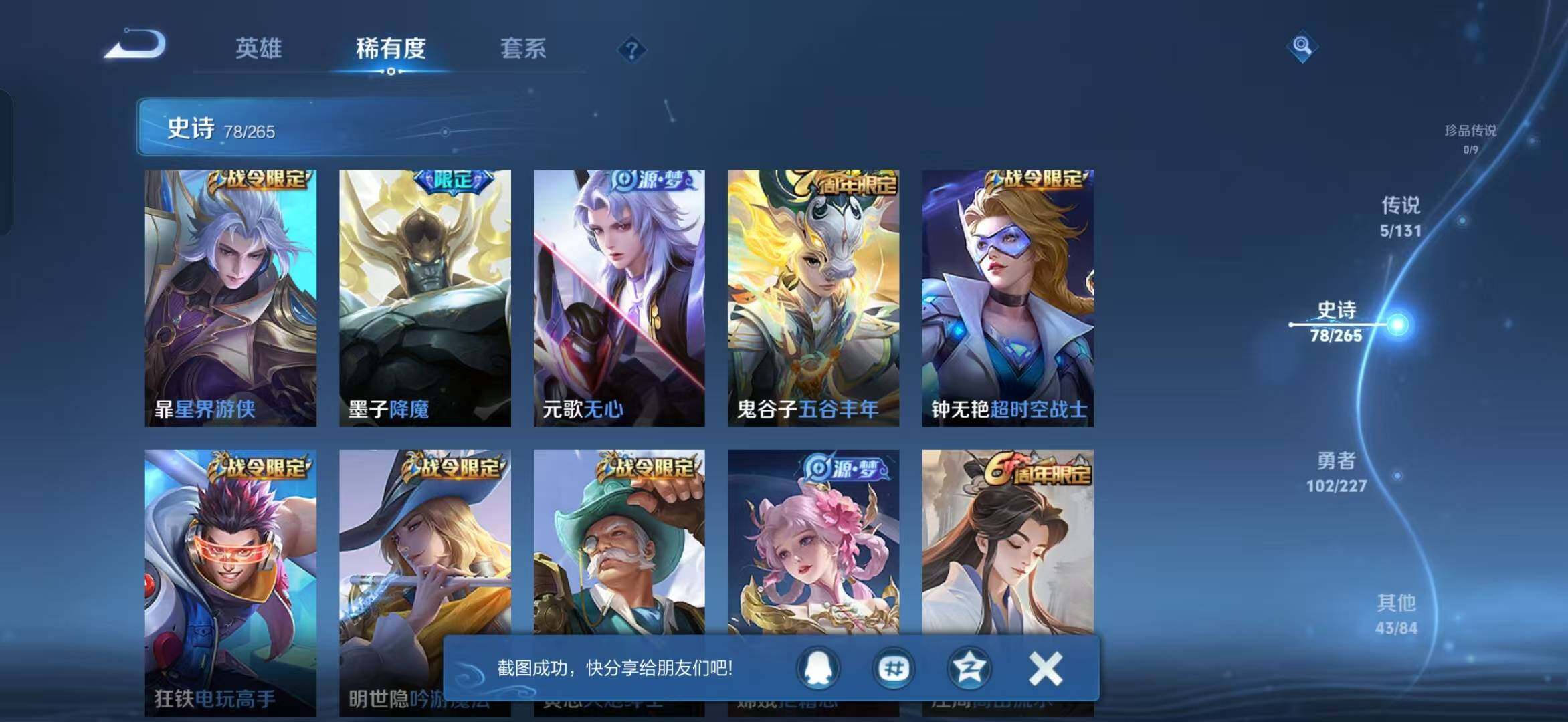 [14530066]安卓q-v7-永恒钻石ii段位-126英雄-231皮肤-2典藏皮肤-5传说-79史诗 【英雄全皮】:蒙恬全皮,影全皮 【荣耀典藏】:孙悟空全息碎影,关羽赤影疾锋 【传说皮肤】:云缨幻光神呛,桑启鸣野蒿,孙策末日机甲,曜云鹰飞将,孙尚香末日机甲 【限定皮肤】:暃埋骨钱,蒙犽顽岩魄,蔡文姬夏日便利店,虞姬夏日便利店,姜子牙天穹之誓,狄仁杰阴阳师,赵云皇家上将,赵云龙胆,墨子神迹守卫,墨子降魔,孙尚香蔷薇恋人,庄周高山流水,高渐离玩趣恶龙,钟无艳超时空战士,扁鹊奇幻香踪,白起夜都怪侠,芈月幻夜卜梦,吕布猎兽之王,元歌云间偶戏,元歌无心,甄姬游园惊梦,甄姬落雪兰心,马可波罗山海玄木吟,狄仁杰魔术师,达摩沙漠行僧,项羽海滩派对,老夫子航海奇遇记,王昭君午后时光,兰陵王金庭之子,花木兰青春决赛季,孙悟空孙行者,后羿如梦令,后羿圣弓游侠,刘备百相守梦,李元芳匿光侦查者,李元芳云中旅人,钟馗驱傩正仪,杨戬潮玩骑兵,干将莫邪真爱魔法,鬼谷子五谷丰年,黄忠火炮绅士,苏烈千军破阵,百里守约朱雀志,沈梦溪大漠名商,明世隐吟游魔法,裴擒虎李小龙,裴擒虎擒涛扼浪,狂铁电玩高手,云中君纤云弄巧,嫦娥拒霜思,嫦娥暖冬兔眠,西施玲珑珍味,鲁班大师探海日志,桑启海盐诗旅,暃星界游侠,戈娅驭风魔法,艾琳流音漫舞,司空震地狱燃心,阿古朵江河有灵,张良古海寻踪,蒙恬荣光圣徽,高渐离燃音魔法,妲己灵卜魔法,鬼谷子天穹祈灯,鲁班七号蔬乡物语,李元芳蔬乡物语,刘邦剑破天穹,上官婉儿群星魔术团,程咬金群星魔术团,关羽决胜骁骑,镜青焰无极,项羽苍威无极,刘备异域游侠,周瑜熔金海岸 【年限皮肤】:百里守约朱雀志,赵云龙胆,马可波罗山海玄木吟 【赛季限定】:达摩沙漠行僧,兰陵王金庭之子,张良古海寻踪,李元芳云中旅人,钟馗驱傩正仪,苏烈千军破阵,沈梦溪大漠名商,裴擒虎擒涛扼浪,鲁班大师探海日志,桑启海盐诗旅,鬼谷子天穹祈灯,蒙恬荣光圣徽,刘邦剑破天穹,姜子牙天穹之誓 【战令限定】:墨子神迹守卫,蔡文姬夏日便利店,虞姬夏日便利店,钟无艳超时空战士,扁鹊奇幻香踪,白起夜都怪侠,芈月幻夜卜梦,吕布猎兽之王,元歌云间偶戏,甄姬落雪兰心,老夫子航海奇遇记,王昭君午后时光,艾琳流音漫舞,后羿圣弓游侠,杨戬潮玩骑兵,干将莫邪真爱魔法,黄忠火炮绅士,明世隐吟游魔法,狂铁电玩高手,嫦娥暖冬兔眠,西施玲珑珍味,司空震地狱燃心,暃星界游侠,戈