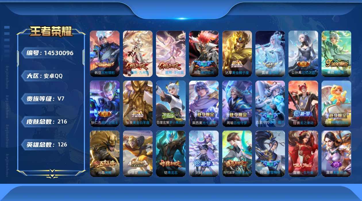 [14530096]安卓q-v7-最强王者段位-126英雄-216皮肤-1典藏皮肤-9传说-50史诗 【英雄全皮】:孙权全皮 【荣耀典藏】:韩信弑呛猎影 【传说皮肤】:澜愿照九州拓,虞姬愿照岁时盈,桑启鸣野蒿,马超琥珀纪元,露娜霜月吟,公孙离记忆之芯,张良黄金白羊座,达摩黄金狮子座,狄仁杰超时空战士 【限定皮肤】:虞姬夏日便利店,姜子牙天穹之誓,李白谪仙醉月,狄仁杰阴阳师,赵云皇家上将,嬴政优雅恋人,庄周高山流水,元歌无心,马可波罗山海玄木吟,狄仁杰魔术师,达摩沙漠行僧,项羽海滩派对,露娜一生所爱,韩信傲雪梅呛,兰陵王金庭之子,孙悟空孙行者,李元芳银河之约,李元芳云中旅人,铠青龙志,苏烈千军破阵,沈梦溪大漠名商,裴擒虎李小龙,裴擒虎擒涛扼浪,嫦娥暖冬兔眠,鲁班大师探海日志,桑启海盐诗旅,艾琳女武神,鬼谷子天穹祈灯,马超琥珀纪元,沈梦溪龙舞盛年,周瑜熔金海岸 【年限皮肤】:铠青龙志,马超神威,马可波罗山海玄木吟 【赛季限定】:达摩沙漠行僧,兰陵王金庭之子,李元芳云中旅人,苏烈千军破阵,沈梦溪大漠名商,裴擒虎擒涛扼浪,鲁班大师探海日志,桑启海盐诗旅,鬼谷子天穹祈灯,姜子牙天穹之誓 【战令限定】:虞姬夏日便利店,李元芳银河之约,嫦娥暖冬兔眠 【史诗皮肤】:露娜紫霞仙子,赵云皇家上将,貂蝉圣诞恋歌,王昭君偶像歌手,狄仁杰魔术师,宫本武藏鬼剑武藏,孙尚香水果甜心,嬴政优雅恋人,嬴政摇滚巨星,妲己魅力维加斯,墨子金属风暴,曹操幽灵船长,李白千年之狐,张飞乱世虎臣,花木兰水晶猎龙者,夏侯惇乘风破浪,小乔缤纷独角兽,诸葛亮黄金分割率,安琪拉心灵骇客,铠曙光守护者,程咬金功夫厨神,孙策猫狗日记,铠青龙志,露娜一生所爱,伽罗箭羽风息,狄仁杰鹰眼统帅,李元芳银河之约,马超神威,孙尚香时之恋人,裴擒虎李小龙,百里玄策热力回旋,杨戬天秀启明,孙悟空孙行者,庄周高山流水,韩信傲雪梅呛,澜赏金猎手,元歌无心,马可波罗山海玄木吟,亚连破空之剑,李白谪仙醉月,百里守约百相守梦,孙膑茶境仙,阿轲化蝶舞,刘禅鸭鸭历险记,狂铁龙之律动,百里守约雪豹霜爪,周瑜百相守梦,莱西奥光弋星穹,百里玄策罗小黑战记,少司缘巫礼祀神 【其他皮肤】:项羽海滩派对,韩信教廷特使,韩信街头霸王,露娜哥特玫瑰,阿轲爱心护理,赵云白执事,赵云忍炎影,芈月红桃皇后,艾琳女武神,程咬金爱与正义,白起白色死神,扁鹊化身博士,安琪拉玩偶对对碰,姜子牙时尚教