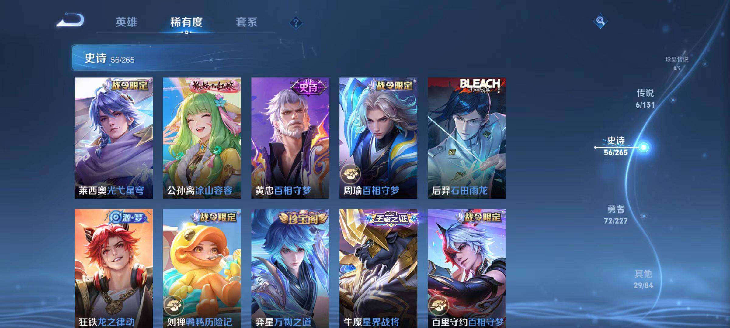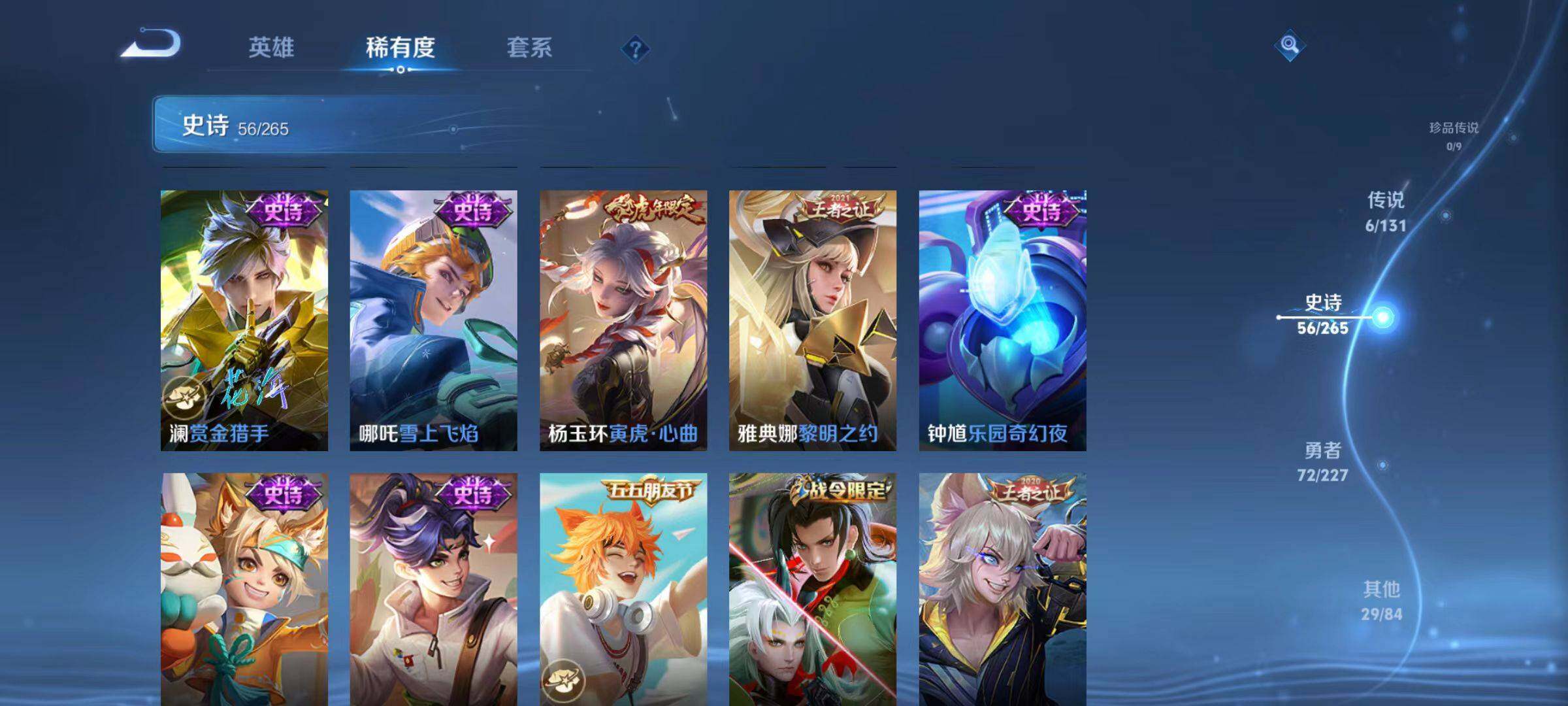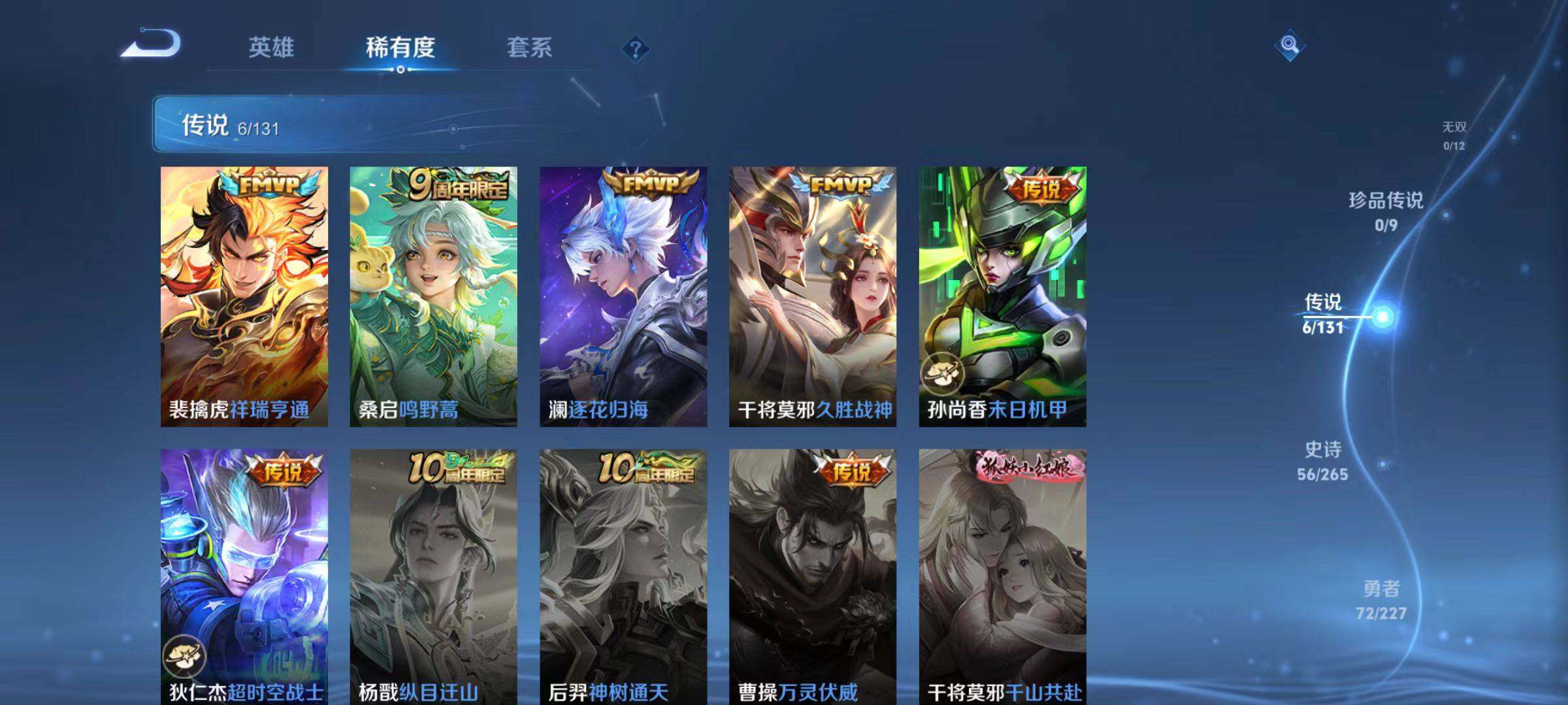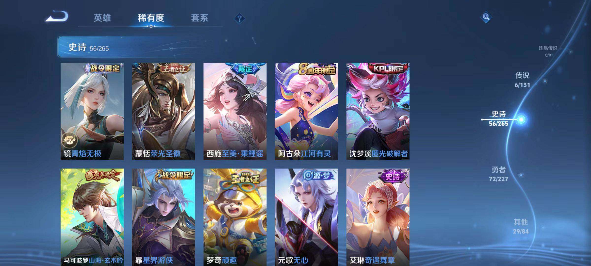 [14530243]安卓q-v6-最强王者段位-126英雄-163皮肤-6传说-56史诗 【传说皮肤】:裴擒虎祥瑞亨通,桑启鸣野蒿,澜逐花归海,干将莫邪久胜战神,孙尚香末日机甲,狄仁杰超时空战士 【限定皮肤】:姜子牙天穹之誓,狄仁杰阴阳师,赵云皇家上将,赵云引擎之心,元歌云间偶戏,元歌无心,马可波罗山海玄木吟,狄仁杰魔术师,达摩沙漠行僧,项羽海滩派对,兰陵王金庭之子,李元芳云中旅人,杨玉环寅虎心曲,雅典娜黎明之约,苏烈千军破阵,百里玄策原初追逐者,梦奇顽趣,沈梦溪大漠名商,沈梦溪匿光破解者,裴擒虎擒涛扼浪,嫦娥暖冬兔眠,西施至美乘鲤谣,鲁班大师探海日志,桑启海盐诗旅,暃星界游侠,艾琳女武神,艾琳流音漫舞,阿古朵江河有灵,张良古海寻踪,蒙恬荣光圣徽,鬼谷子天穹祈灯,沈梦溪龙舞盛年,刘邦剑破天穹,程咬金群星魔术团,镜青焰无极,周瑜熔金海岸 【年限皮肤】:杨玉环寅虎心曲,马可波罗山海玄木吟 【赛季限定】:达摩沙漠行僧,兰陵王金庭之子,张良古海寻踪,李元芳云中旅人,雅典娜黎明之约,苏烈千军破阵,百里玄策原初追逐者,梦奇顽趣,沈梦溪大漠名商,裴擒虎擒涛扼浪,鲁班大师探海日志,桑启海盐诗旅,鬼谷子天穹祈灯,蒙恬荣光圣徽,刘邦剑破天穹,姜子牙天穹之誓 【战令限定】:元歌云间偶戏,艾琳流音漫舞,嫦娥暖冬兔眠,暃星界游侠,镜青焰无极 【史诗皮肤】:露娜紫霞仙子,赵云皇家上将,狄仁杰魔术师,宫本武藏鬼剑武藏,孙尚香水果甜心,嬴政摇滚巨星,妲己魅力维加斯,妲己女仆咖啡,墨子金属风暴,曹操幽灵船长,李白千年之狐,赵云引擎之心,花木兰水晶猎龙者,刘邦德古拉伯爵,小乔缤纷独角兽,兰陵王暗隐猎兽者,百里守约特工魅影,刘禅天才门将,程咬金功夫厨神,白起星夜王子,阿轲节奏热浪,大乔猫狗日记,伽罗箭羽风息,狄仁杰鹰眼统帅,娜可露露晚萤,不知火舞魅语,百里玄策原初追逐者,元歌云间偶戏,百里玄策热力回旋,蒙犽龙鼓争鸣,沈梦溪月团寄思,钟馗乐园奇幻夜,雅典娜黎明之约,杨玉环寅虎心曲,哪吒雪上飞焰,澜赏金猎手,艾琳奇遇舞章,元歌无心,梦奇顽趣,暃星界游侠,马可波罗山海玄木吟,沈梦溪匿光破解者,阿古朵江河有灵,西施至美乘鲤谣,蒙恬荣光圣徽,镜青焰无极,百里守约百相守梦,牛魔星界战将,弈星万物之道,刘禅鸭鸭历险记,狂铁龙之律动,后羿石田雨龙,周瑜百相守梦,黄忠百相守梦,公孙离涂山容容,莱西奥光弋星穹 【其他皮肤】:项羽海滩派对,赵