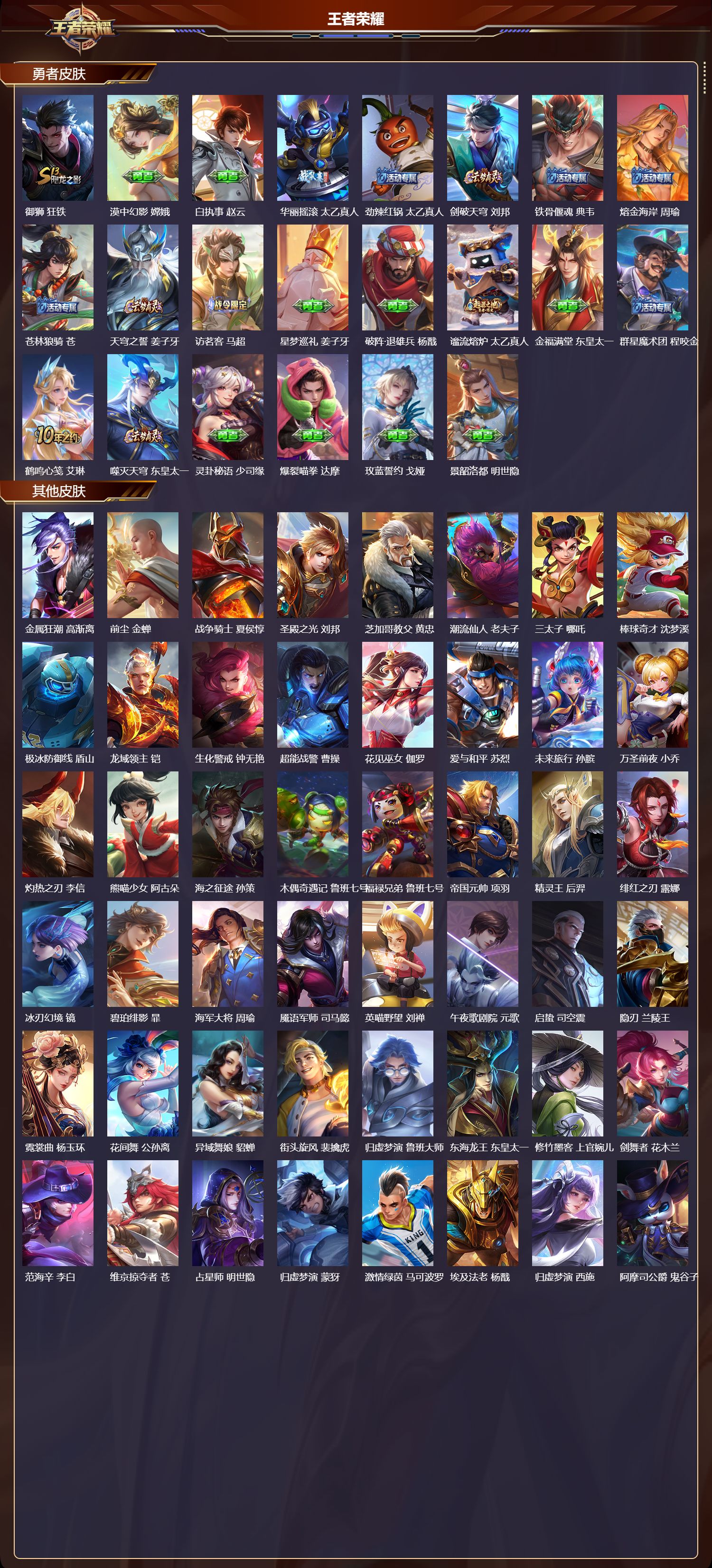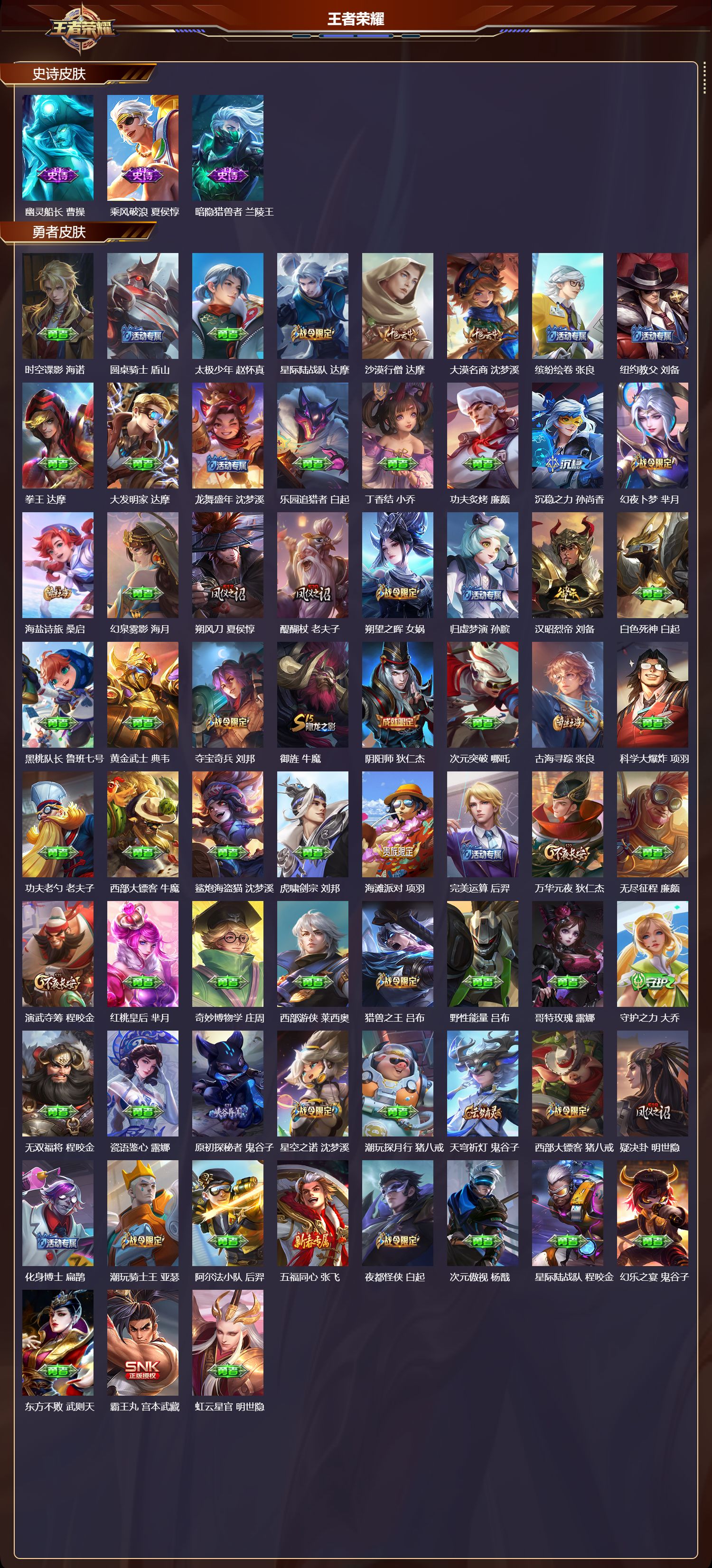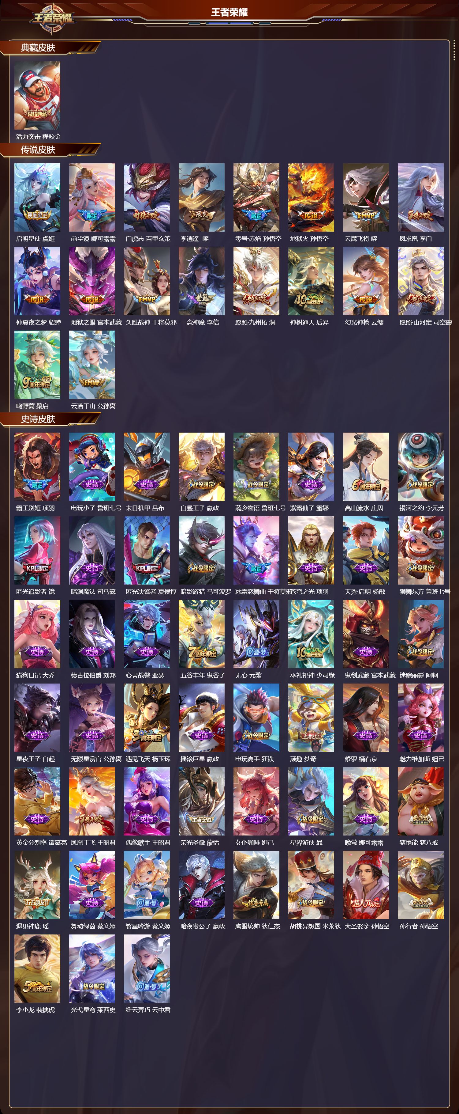 苹果qq/荣耀王者/377皮肤/126英雄/1典藏/0珍品无双/0无双/0珍品传说/18传说/124史诗/8稀有英雄【1 典藏皮肤】活力突击 程咬金【18 传说皮肤】启明星使 虞姬前尘镜 娜可露露白虎志 百里玄策李 曜零号·赤焰 孙悟空地狱火 孙悟空云鹰飞将 曜凤求凰 李白仲夏夜之梦 貂蝉地狱之眼 宫本武藏久胜战神 干将莫邪一念神魔 李信愿照·九