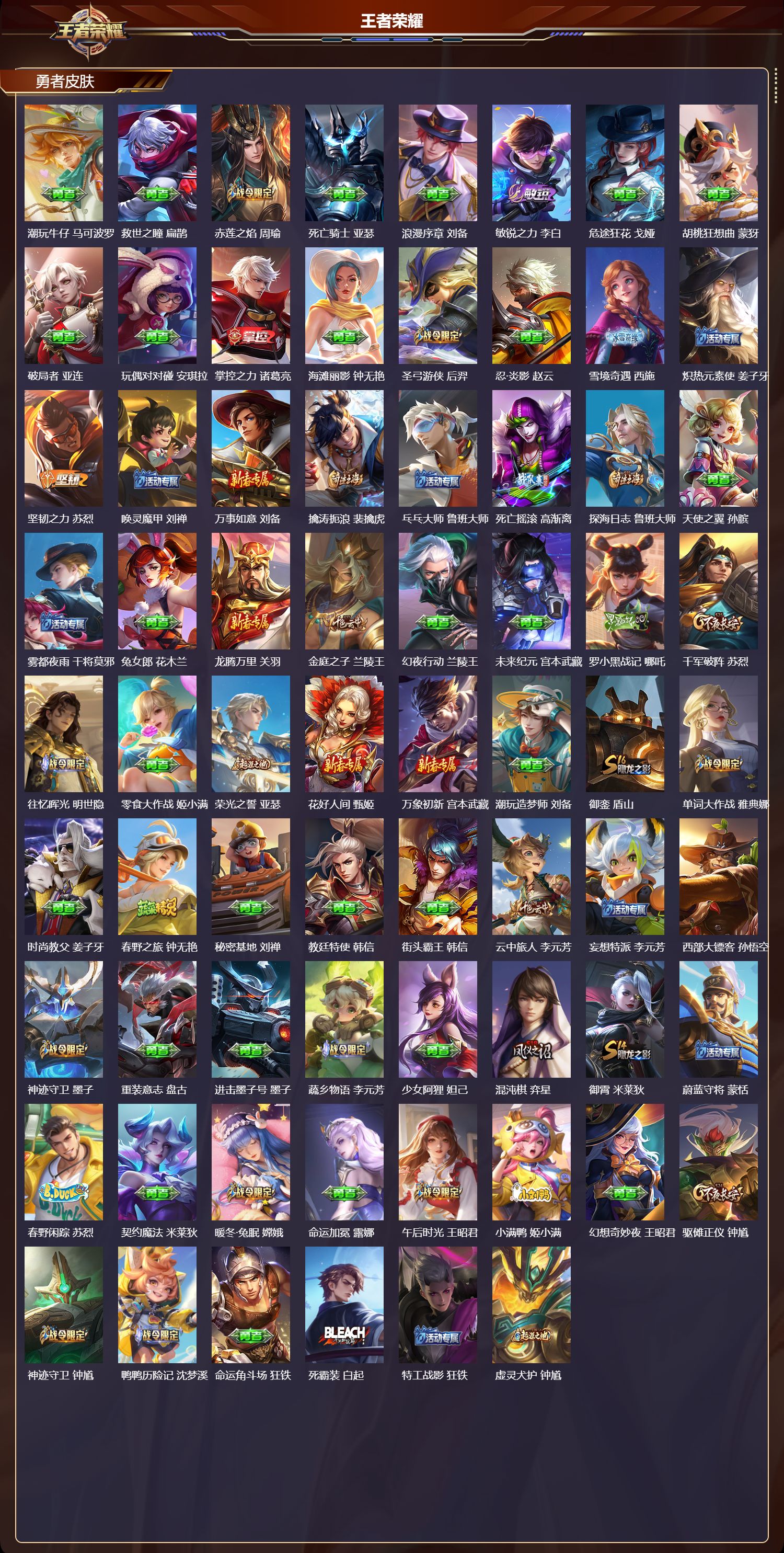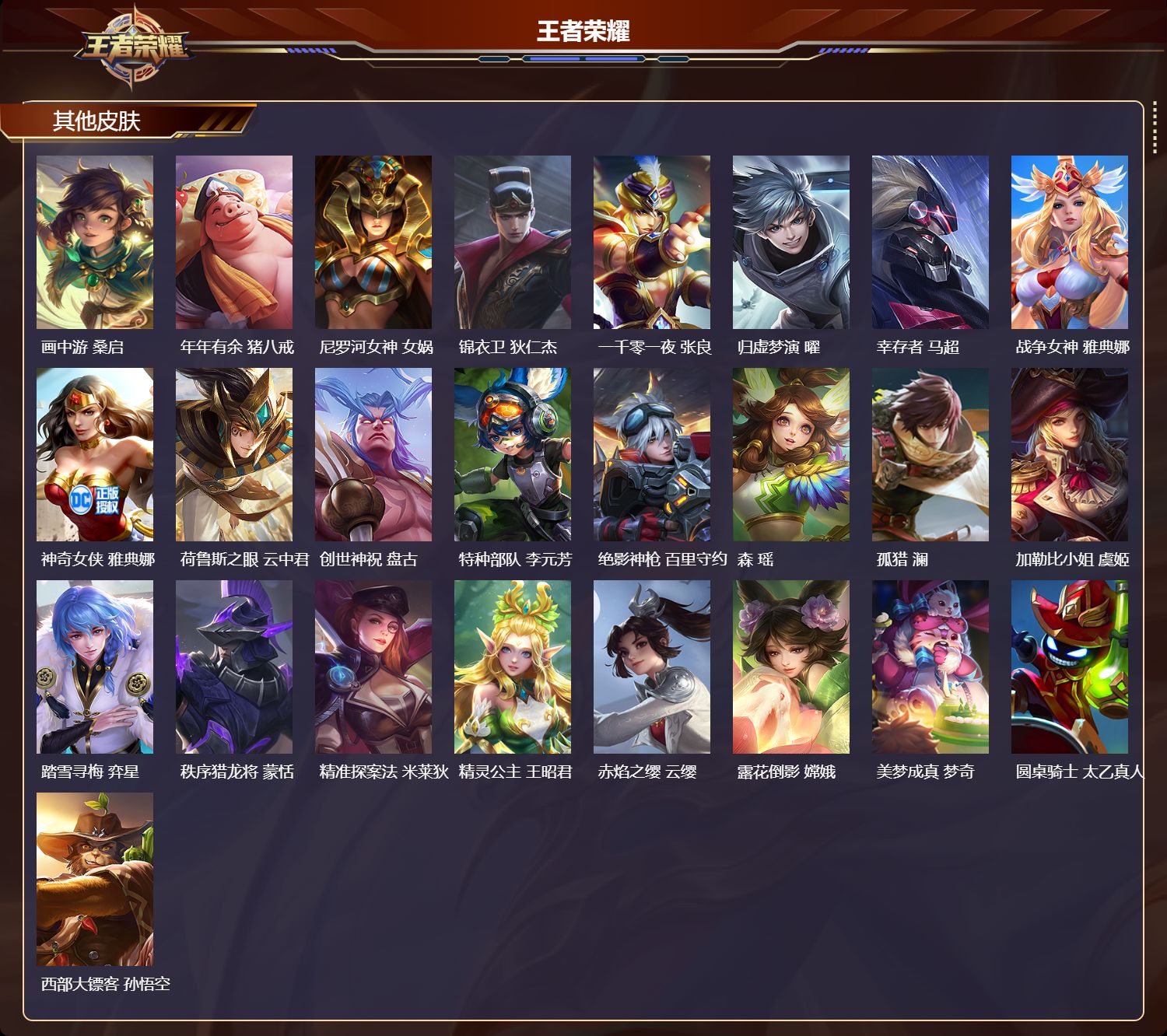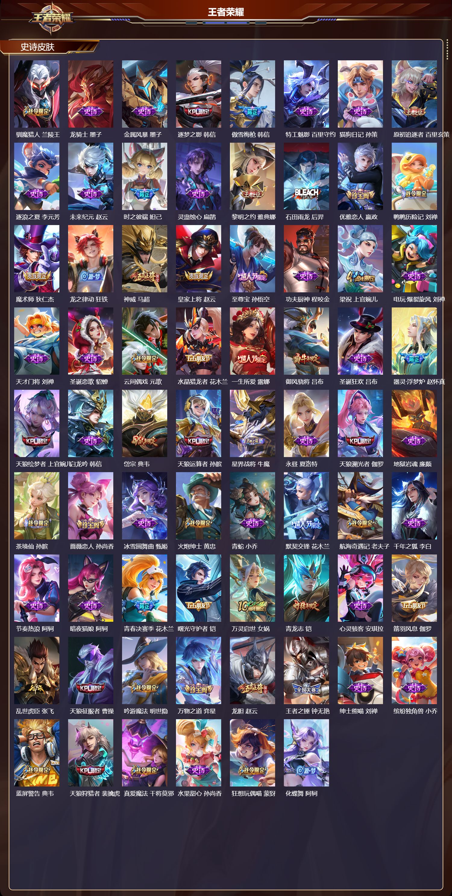 苹果qq/荣耀王者/377皮肤/126英雄/1典藏/0珍品无双/0无双/0珍品传说/18传说/124史诗/8稀有英雄【1 典藏皮肤】活力突击 程咬金【18 传说皮肤】启明星使 虞姬前尘镜 娜可露露白虎志 百里玄策李 曜零号·赤焰 孙悟空地狱火 孙悟空云鹰飞将 曜凤求凰 李白仲夏夜之梦 貂蝉地狱之眼 宫本武藏久胜战神 干将莫邪一念神魔 李信愿照·九
