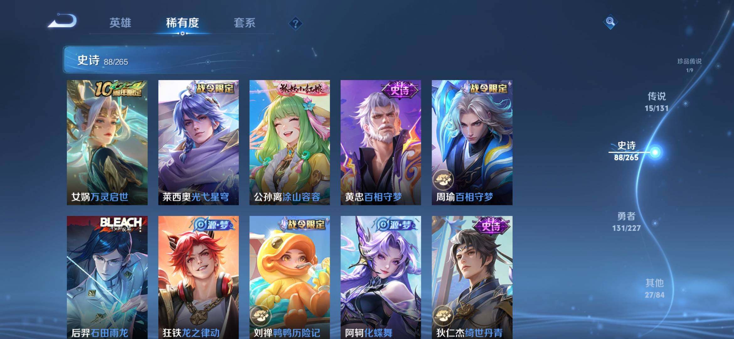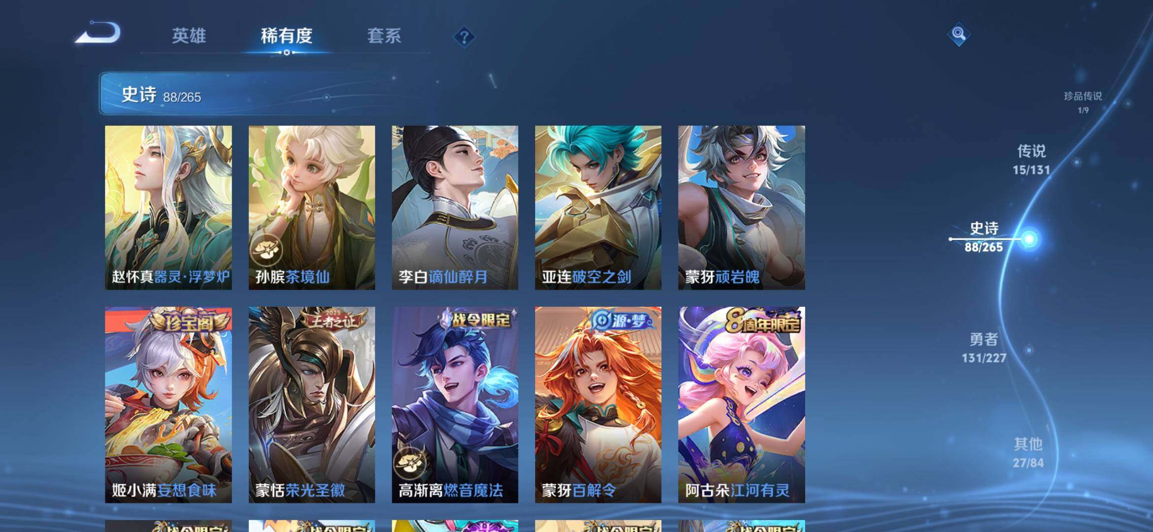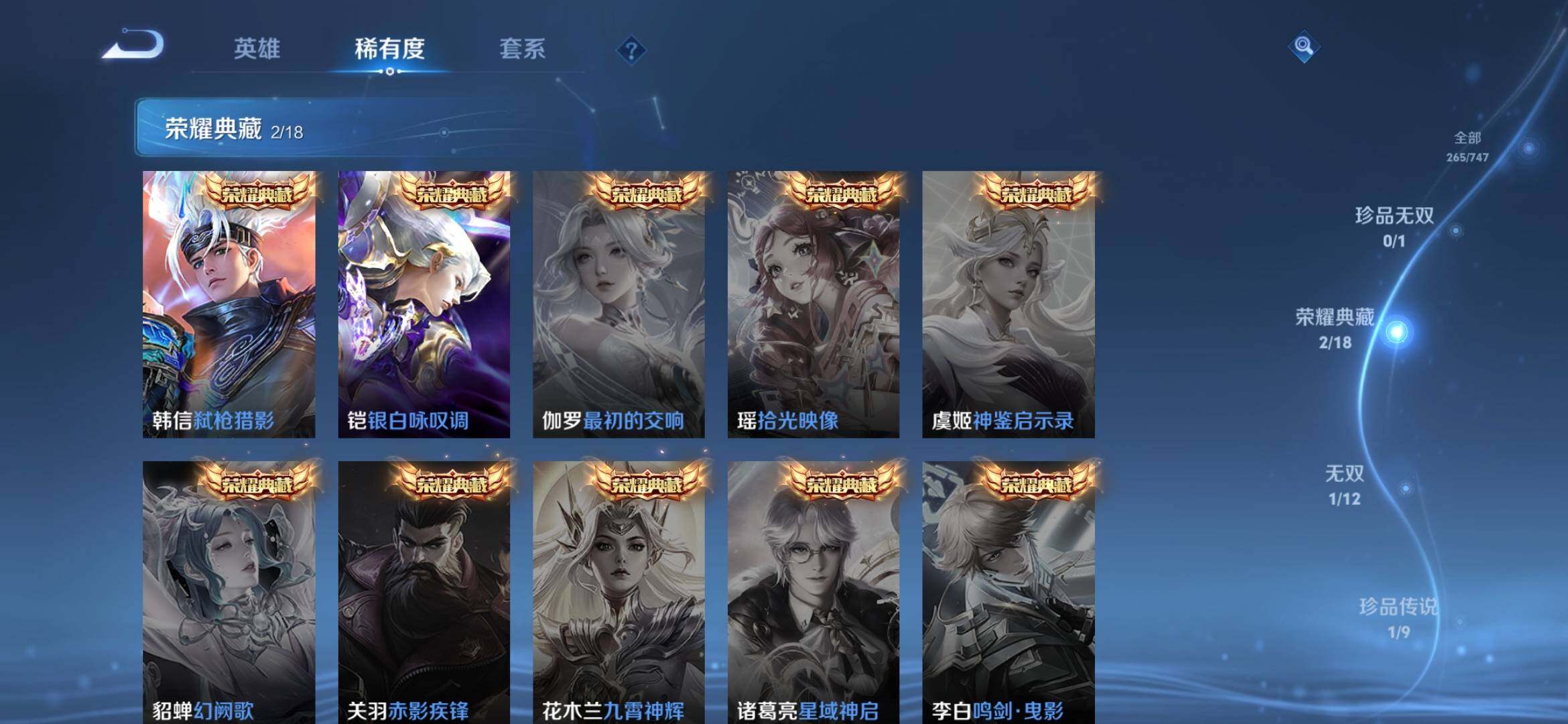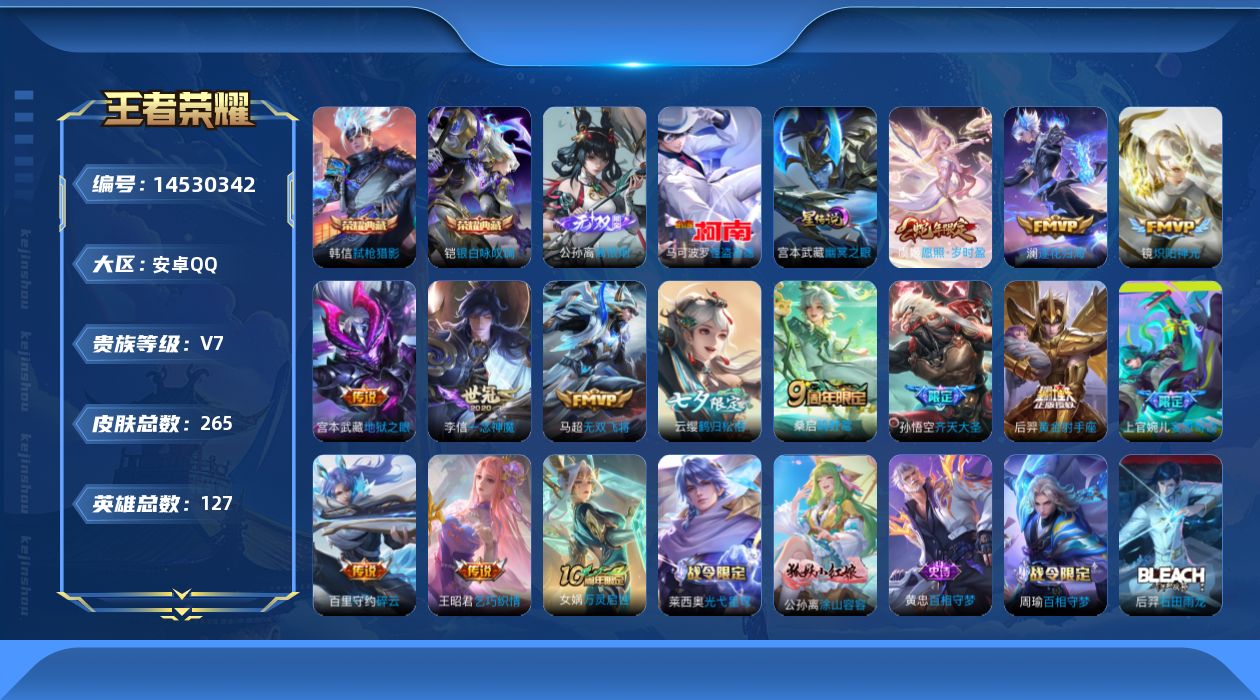 [14530342]安卓q-v7-最强王者段位-127英雄-265皮肤-2典藏皮肤-1无双-1珍品传说-15传说-88史诗 【英雄全皮】:孙权全皮,影全皮 【荣耀典藏】:铠银白咏叹调,韩信弑呛猎影 【无双皮肤】:公孙离离恨烟 【珍品传说】:马可波罗怪盗基德 【传说皮肤】:后羿神树通天,干将莫邪千山共赴,虞姬愿照岁时盈,桑启鸣野蒿,澜逐花归海,云缨鹤归松栖,上官婉儿妄想奇谈,孙悟空齐天大圣,百里守约碎云,马超无双飞将,王昭君乞巧织情,镜炽阳神光,李信一念神魔,后羿黄金射手座,宫本武藏地狱之眼 【限定皮肤】:公孙离离恨烟,蒙犽顽岩魄,虞姬夏日便利店,姜子牙天穹之誓,杨戬破阵退雄兵,李白谪仙醉月,狄仁杰阴阳师,赵云皇家上将,孙尚香蔷薇恋人,庄周高山流水,钟无艳超时空战士,扁鹊奇幻香踪,元歌无心,甄姬落雪兰心,狄仁杰魔术师,狄仁杰万华元夜,达摩沙漠行僧,项羽海滩派对,老夫子醍醐杖,程咬金演武夺筹,韩信飞衡,韩信傲雪梅呛,兰陵王金庭之子,孙悟空至尊宝,孙悟空大圣娶亲,孙悟空孙行者,孙悟空齐天大圣,李元芳银河之约,李元芳云中旅人,钟馗驱傩正仪,杨戬潮玩骑兵,干将莫邪胡桃夹子,鬼谷子原初探秘者,鬼谷子五谷丰年,苏烈千军破阵,沈梦溪大漠名商,裴擒虎李小龙,裴擒虎擒涛扼浪,米莱狄胡桃异想国,云中君纤云弄巧,上官婉儿妄想奇谈,嫦娥拒霜思,嫦娥暖冬兔眠,西施玲珑珍味,鲁班大师探海日志,桑启海盐诗旅,暃星界游侠,戈娅驭风魔法,艾琳流音漫舞,云缨鹤归松栖,司空震地狱燃心,阿古朵江河有灵,张良古海寻踪,蒙犽百解令,蒙恬荣光圣徽,高渐离燃音魔法,妲己灵卜魔法,鬼谷子天穹祈灯,姬小满妄想食味,沈梦溪龙舞盛年,刘邦剑破天穹,程咬金群星魔术团,刘备异域游侠,周瑜熔金海岸 【年限皮肤】:韩信飞衡 【赛季限定】:狄仁杰万华元夜,达摩沙漠行僧,老夫子醍醐杖,程咬金演武夺筹,兰陵王金庭之子,张良古海寻踪,李元芳云中旅人,钟馗驱傩正仪,鬼谷子原初探秘者,苏烈千军破阵,沈梦溪大漠名商,裴擒虎擒涛扼浪,鲁班大师探海日志,桑启海盐诗旅,鬼谷子天穹祈灯,蒙恬荣光圣徽,刘邦剑破天穹,姜子牙天穹之誓 【战令限定】:虞姬夏日便利店,钟无艳超时空战士,扁鹊奇幻香踪,甄姬落雪兰心,艾琳流音漫舞,李元芳银河之约,杨戬潮玩骑兵,米莱狄胡桃异想国,嫦娥暖冬兔眠,西施玲珑珍味,司空震地狱燃心,暃星界游侠,戈娅驭风魔法,高渐离燃音魔法,妲己灵卜魔法 【史诗