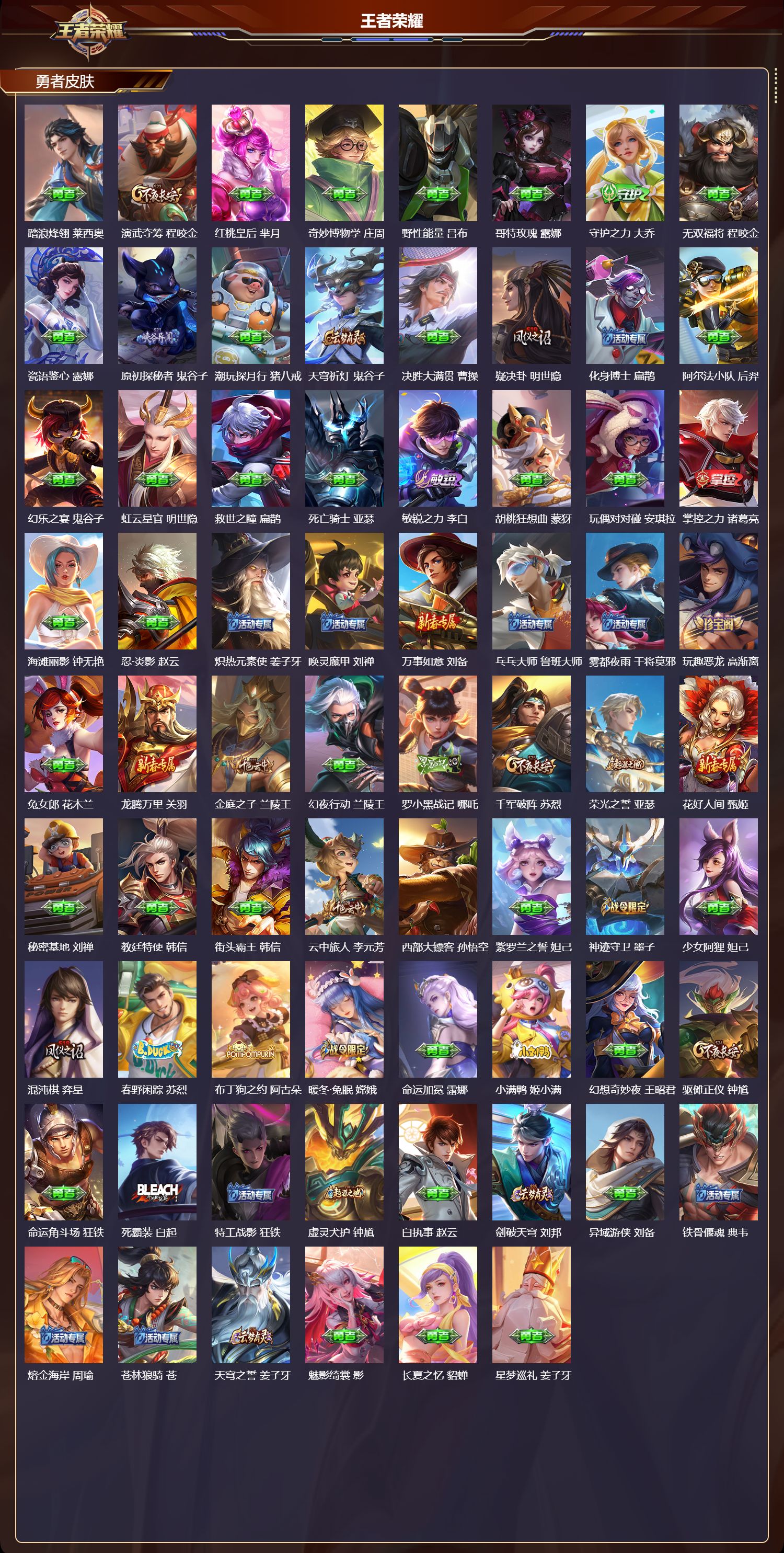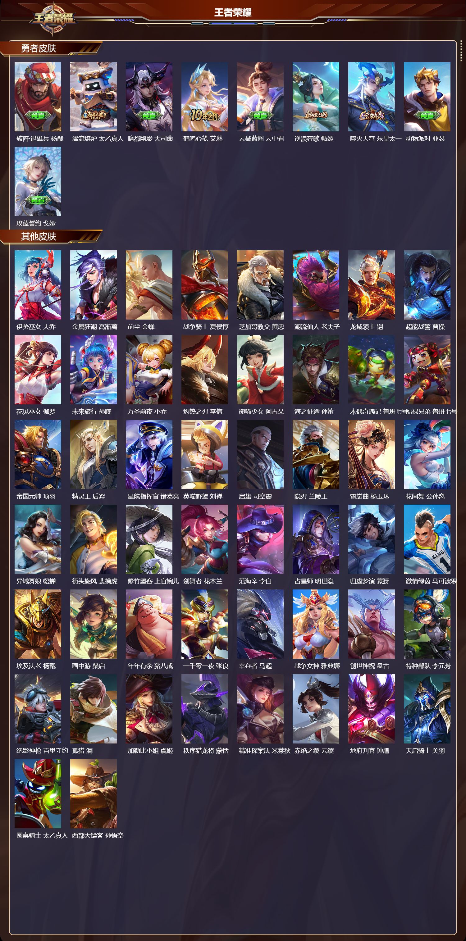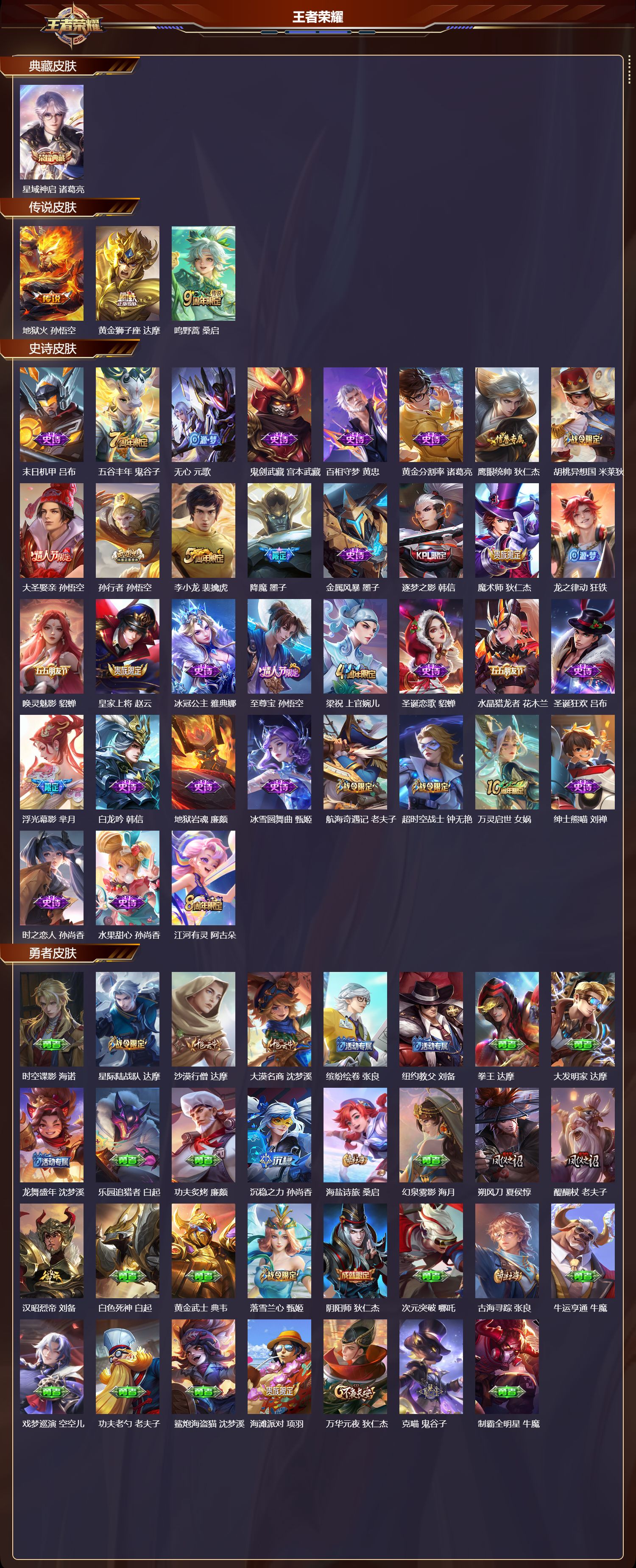 苹果qq/非凡王者/200皮肤/125英雄/1典藏/0珍品无双/0无双/0珍品传说/3传说/35史诗/7稀有英雄【1 典藏皮肤】星域神启 诸葛亮【3 传说皮肤】地狱火 孙悟空黄金狮子座 达摩鸣野蒿 桑启【35 史诗皮肤】末日机甲 吕布五谷丰年 鬼谷子无心 元歌鬼剑武藏 宫本武藏百相守梦 黄忠黄金分割率 诸葛亮鹰眼统帅 狄仁杰胡桃异想国 米莱狄大圣娶亲 孙