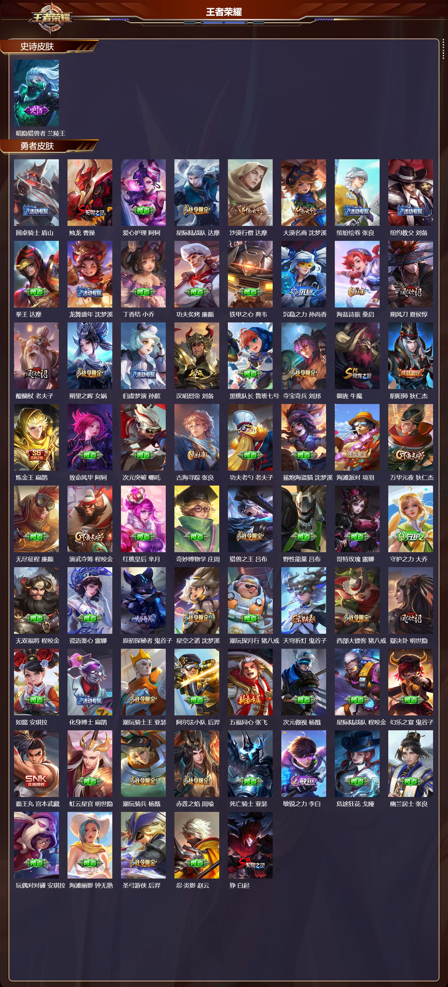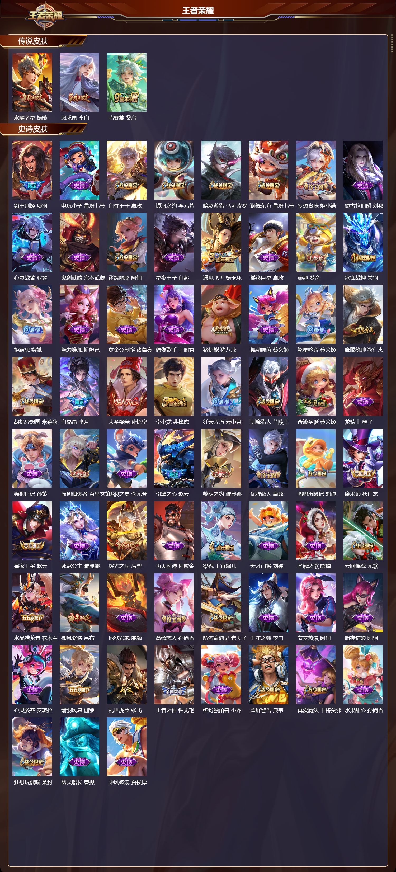 苹果qq/至尊星耀/243皮肤/126英雄/0典藏/0珍品无双/0无双/0珍品传说/3传说/68史诗/8稀有英雄【3 传说皮肤】永曜之星 杨戬凤求凰 李白鸣野蒿 桑启【68 史诗皮肤】霸王别姬 项羽电玩小子 鲁班七号白昼王子 嬴政银河之约 李元芳暗影游猎 马可波罗狮舞东方 鲁班七号妄想食味 姬小满德古拉伯爵 刘邦心灵战警 亚瑟鬼剑武藏 宫本武藏迷踪丽影 阿轲星夜王子 白