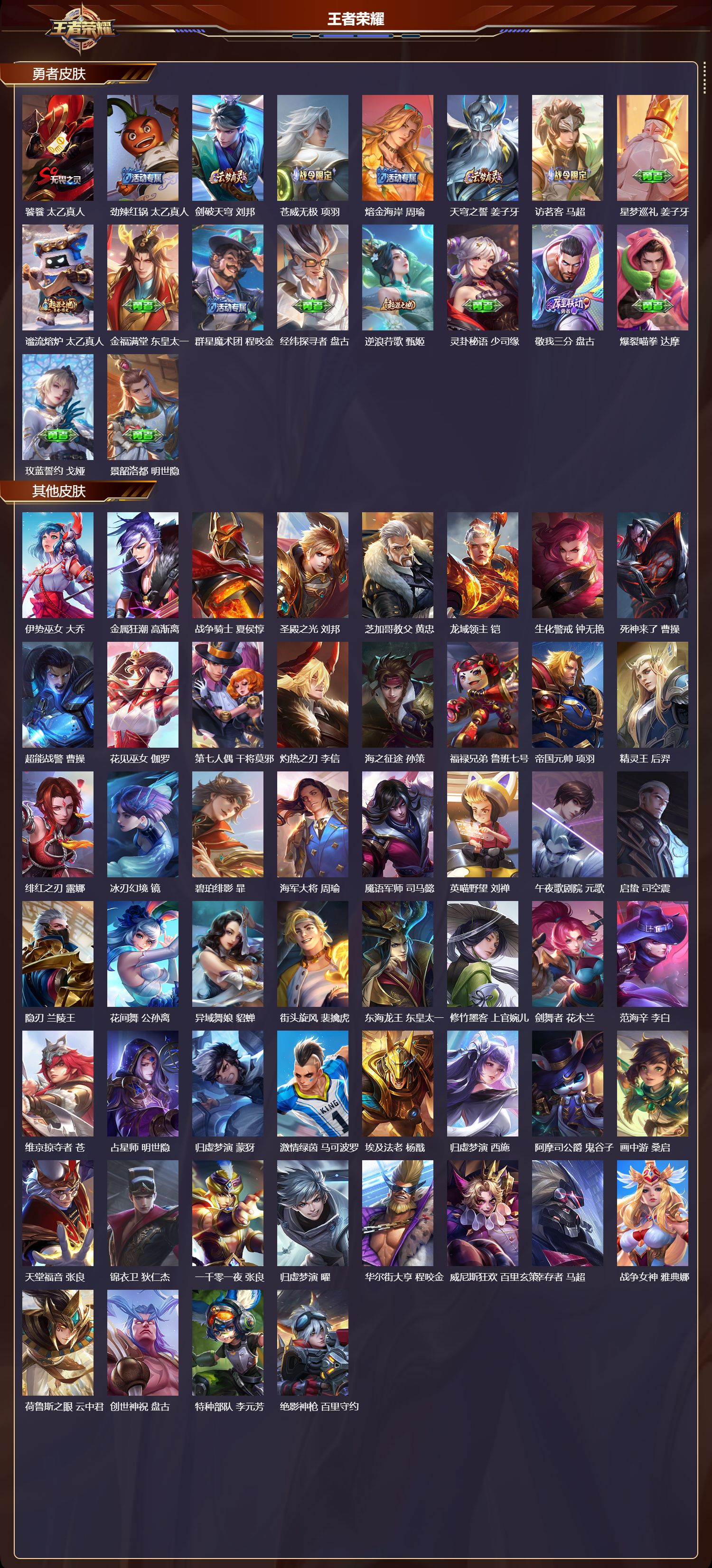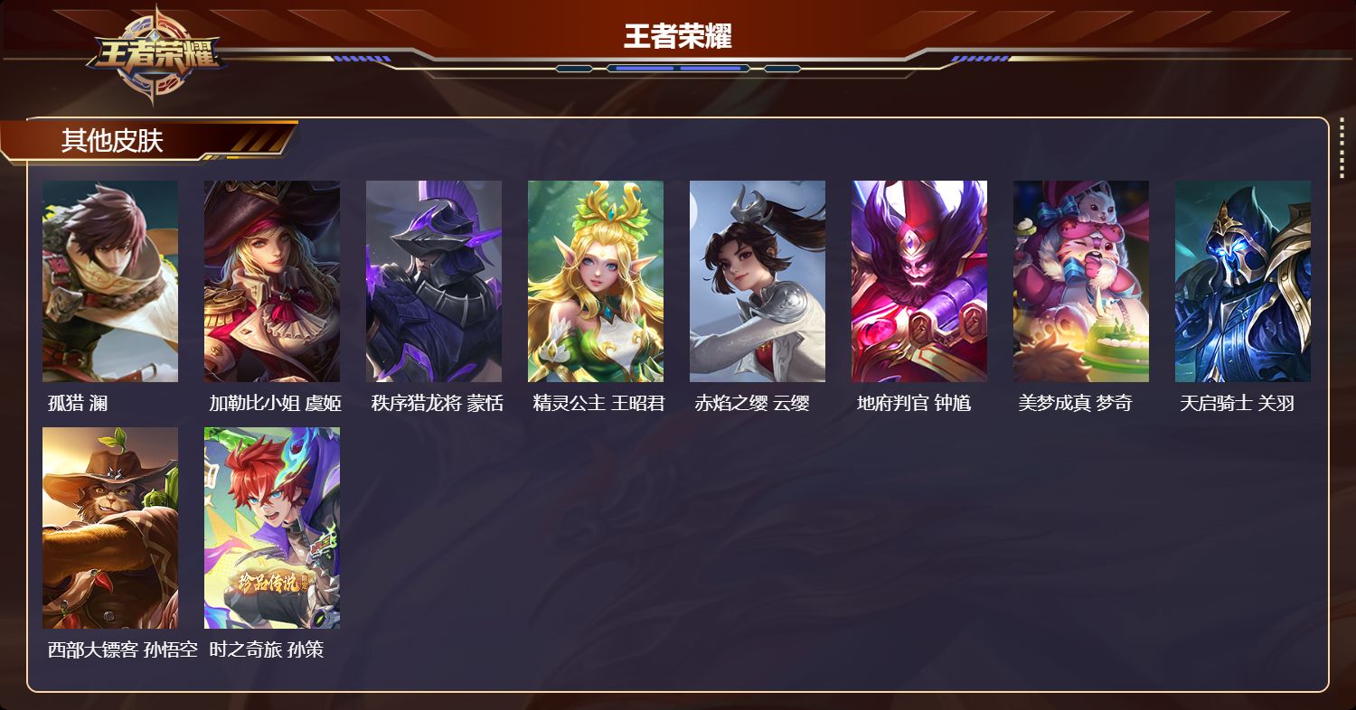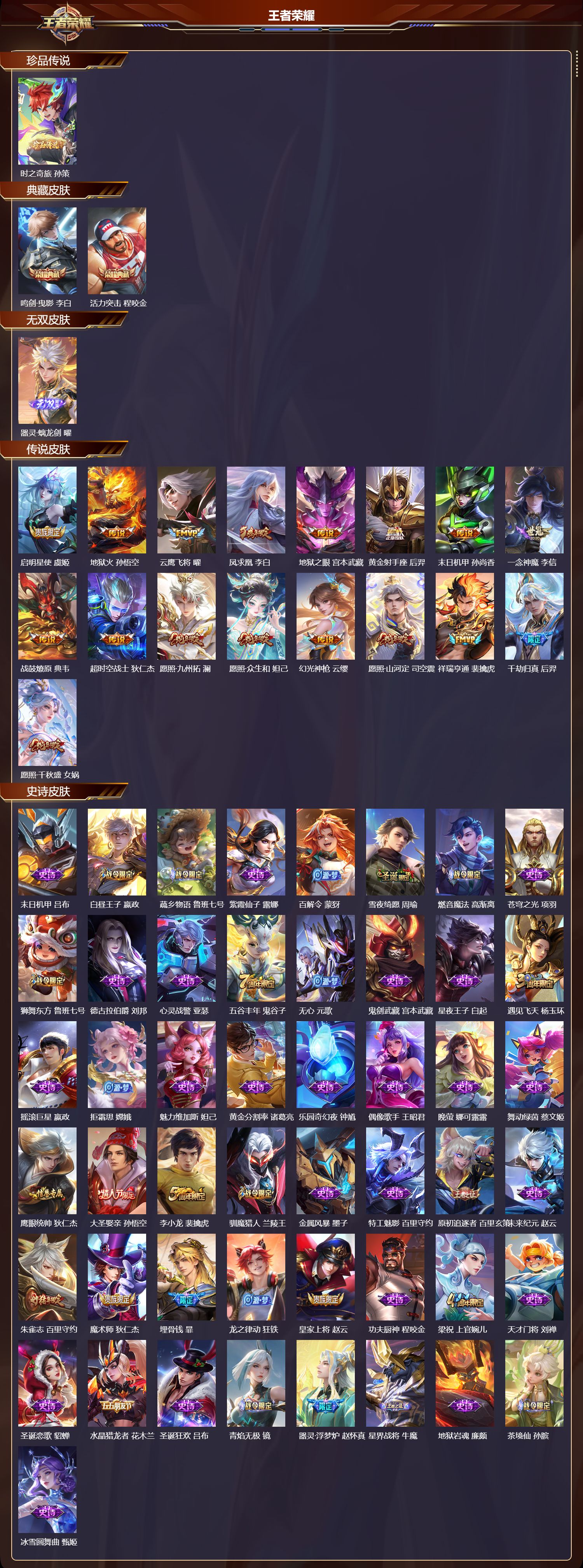 安卓qq/非凡王者/289皮肤/126英雄/2典藏/0珍品无双/1无双/1珍品传说/17传说/67史诗/8稀有英雄【1 珍品传说】时之奇旅 孙策【2 典藏皮肤】鸣剑·曳影 李白活力突击 程咬金【1 无双皮肤】器灵·螭龙剑 曜【17 传说皮肤】启明星使 虞姬地狱火 孙悟空云鹰飞将 曜凤求凰 李白地狱之眼 宫本武藏黄金射手座 后羿末日机甲 孙尚香一念神魔 李信