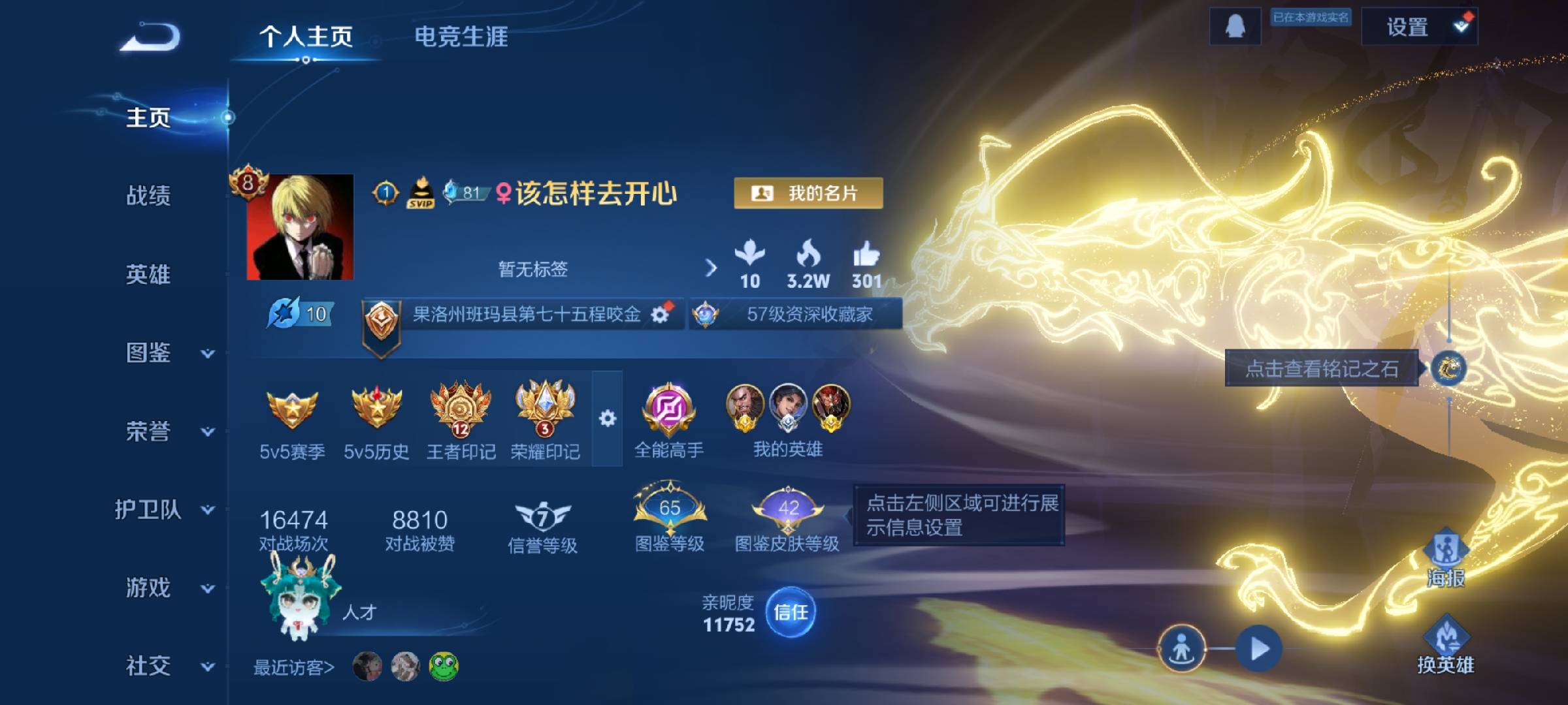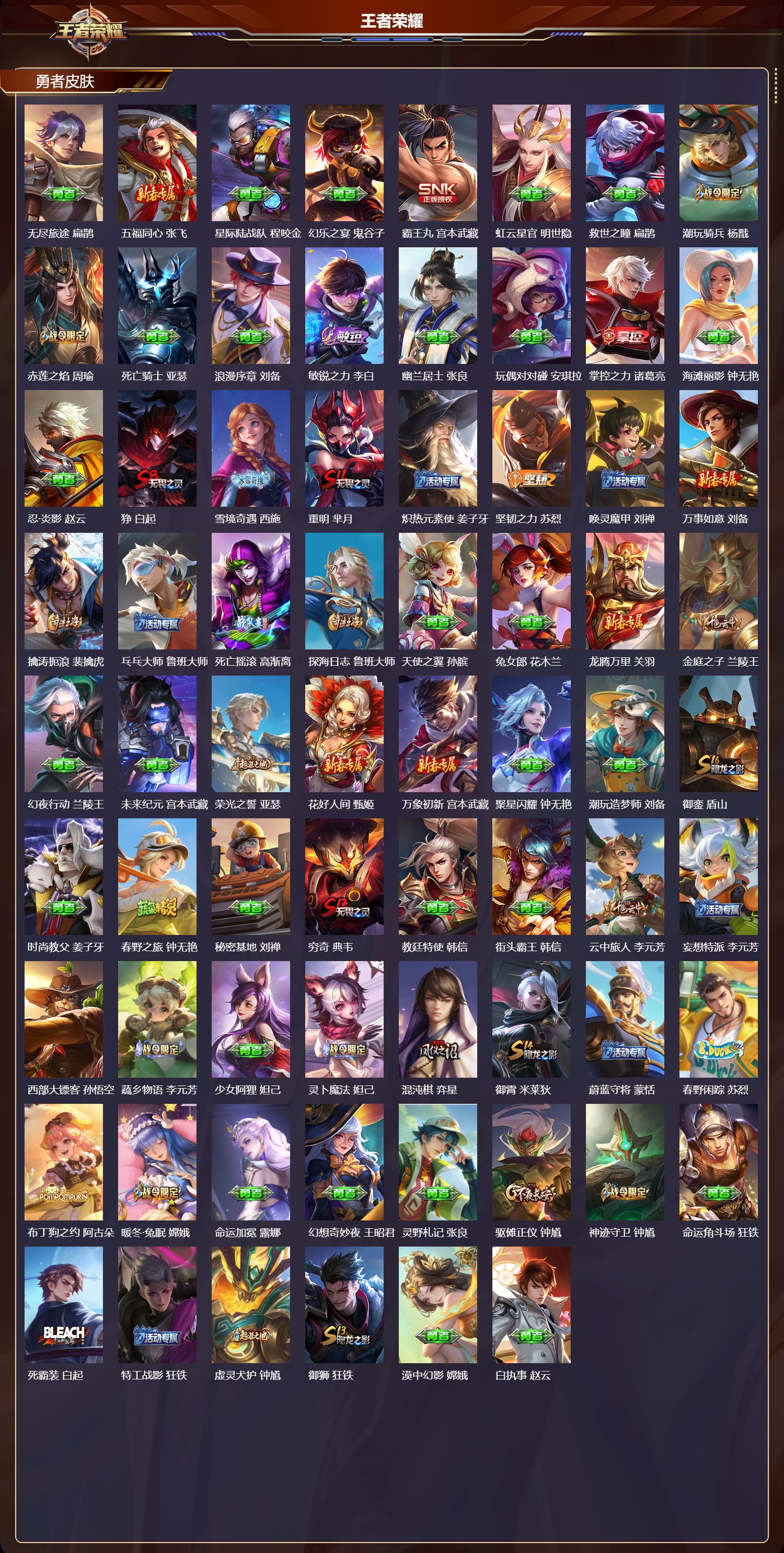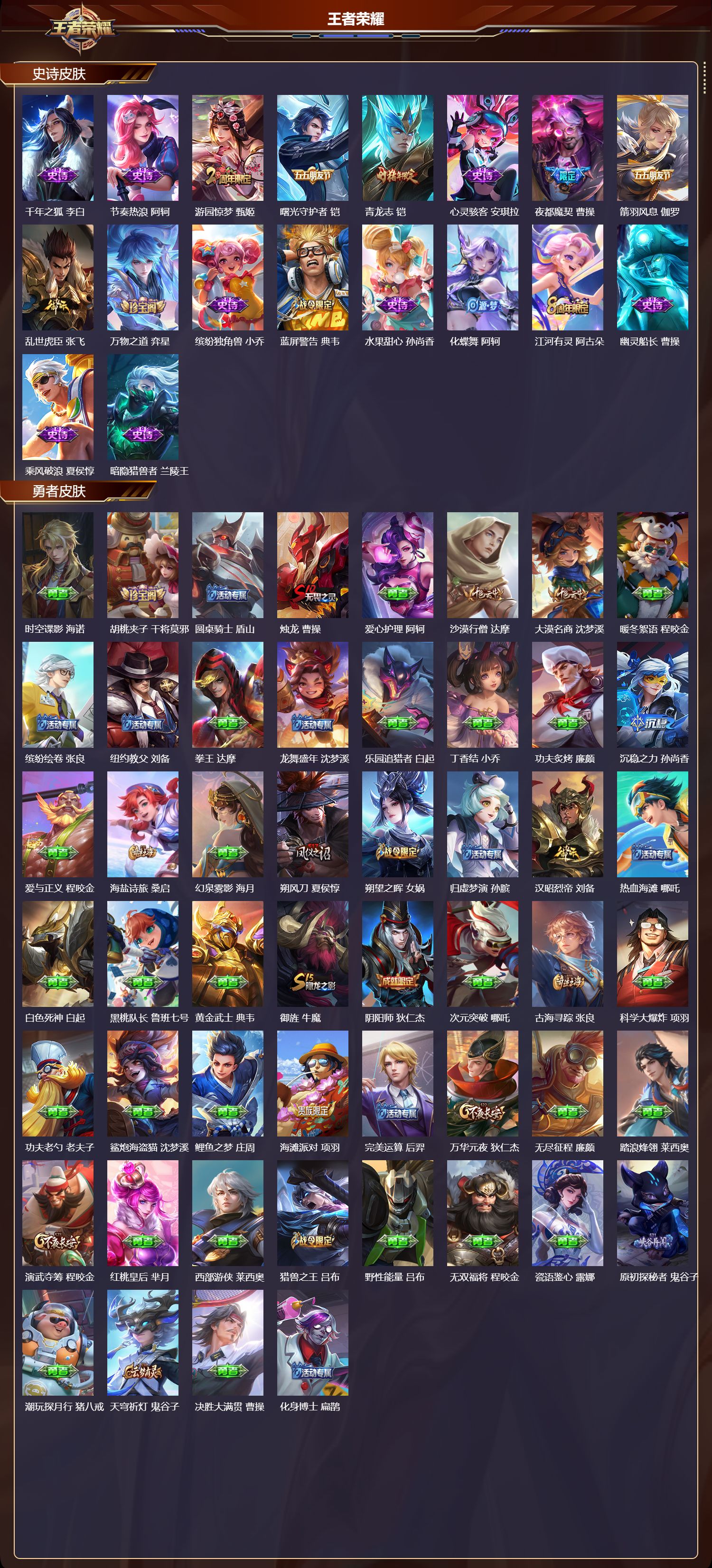 安卓qq/非凡王者/289皮肤/126英雄/2典藏/0珍品无双/1无双/1珍品传说/17传说/67史诗/8稀有英雄【1 珍品传说】时之奇旅 孙策【2 典藏皮肤】鸣剑·曳影 李白活力突击 程咬金【1 无双皮肤】器灵·螭龙剑 曜【17 传说皮肤】启明星使 虞姬地狱火 孙悟空云鹰飞将 曜凤求凰 李白地狱之眼 宫本武藏黄金射手座 后羿末日机甲 孙尚香一念神魔 李信