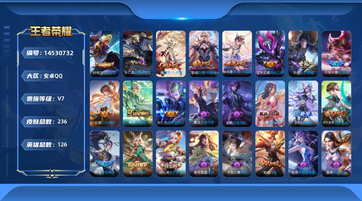 [14530732]安卓q-v7-至尊星耀iii段位-126英雄-236皮肤-1典藏皮肤-9传说-69史诗 【英雄全皮】:孙权全皮,李信全皮,空空儿全皮,影全皮 【荣耀典藏】:孙悟空全息碎影 【传说皮肤】:澜愿照九州拓,云缨幻光神呛,桑启鸣野蒿,孙尚香乘龙问璇玑,李信山海炽霜斩,不知火舞绯月行,李信一念神魔,宫本武藏地狱之眼,狄仁杰超时空战士 【限定皮肤】:蔡文姬夏日便利店,大乔绒语心约,虞姬夏日便利店,姜子牙天穹之誓,狄仁杰阴阳师,赵云皇家上将,吕布猎兽之王,元歌无心,甄姬游园惊梦,马可波罗山海玄木吟,狄仁杰魔术师,达摩沙漠行僧,项羽海滩派对,韩信飞衡,韩信傲雪梅呛,兰陵王金庭之子,不知火舞绯月行,孙悟空美猴王,李元芳云中旅人,钟馗神迹守卫,杨玉环遇见飞天,鬼谷子五谷丰年,百里玄策原初追逐者,沈梦溪大漠名商,裴擒虎擒涛扼浪,云中君纤云弄巧,李信山海炽霜斩,嫦娥暖冬兔眠,西施玲珑珍味,鲁班大师探海日志,桑启海盐诗旅,暃星界游侠,戈娅驭风魔法,艾琳女武神,阿古朵江河有灵,张良古海寻踪,蒙恬荣光圣徽,高渐离燃音魔法,妲己灵卜魔法,鬼谷子天穹祈灯,姬小满妄想食味,孙尚香乘龙问璇玑,沈梦溪龙舞盛年,鲁班七号蔬乡物语,李元芳蔬乡物语,刘邦剑破天穹,程咬金群星魔术团,镜青焰无极,项羽苍威无极,刘备异域游侠,周瑜熔金海岸 【年限皮肤】:孙悟空美猴王,韩信飞衡,马可波罗山海玄木吟,李信山海炽霜斩,孙尚香乘龙问璇玑 【赛季限定】:达摩沙漠行僧,兰陵王金庭之子,张良古海寻踪,李元芳云中旅人,百里玄策原初追逐者,沈梦溪大漠名商,裴擒虎擒涛扼浪,鲁班大师探海日志,桑启海盐诗旅,鬼谷子天穹祈灯,蒙恬荣光圣徽,刘邦剑破天穹,姜子牙天穹之誓 【战令限定】:蔡文姬夏日便利店,虞姬夏日便利店,吕布猎兽之王,钟馗神迹守卫,嫦娥暖冬兔眠,西施玲珑珍味,暃星界游侠,戈娅驭风魔法,高渐离燃音魔法,妲己灵卜魔法,鲁班七号蔬乡物语,李元芳蔬乡物语,镜青焰无极,项羽苍威无极 【史诗皮肤】:露娜紫霞仙子,赵云皇家上将,赵云未来纪元,甄姬冰雪圆舞曲,王昭君偶像歌手,狄仁杰魔术师,宫本武藏鬼剑武藏,孙尚香水果甜心,嬴政暗夜贵公子,嬴政摇滚巨星,妲己女仆咖啡,墨子金属风暴,吕布圣诞狂欢,李白千年之狐,吕布末日机甲,张飞乱世虎臣,花木兰水晶猎龙者,夏侯惇乘风破浪,小乔缤纷独角兽,兰陵王暗隐猎兽者,甄姬游园惊梦,雅典娜冰冠公主,安琪拉心灵骇客
