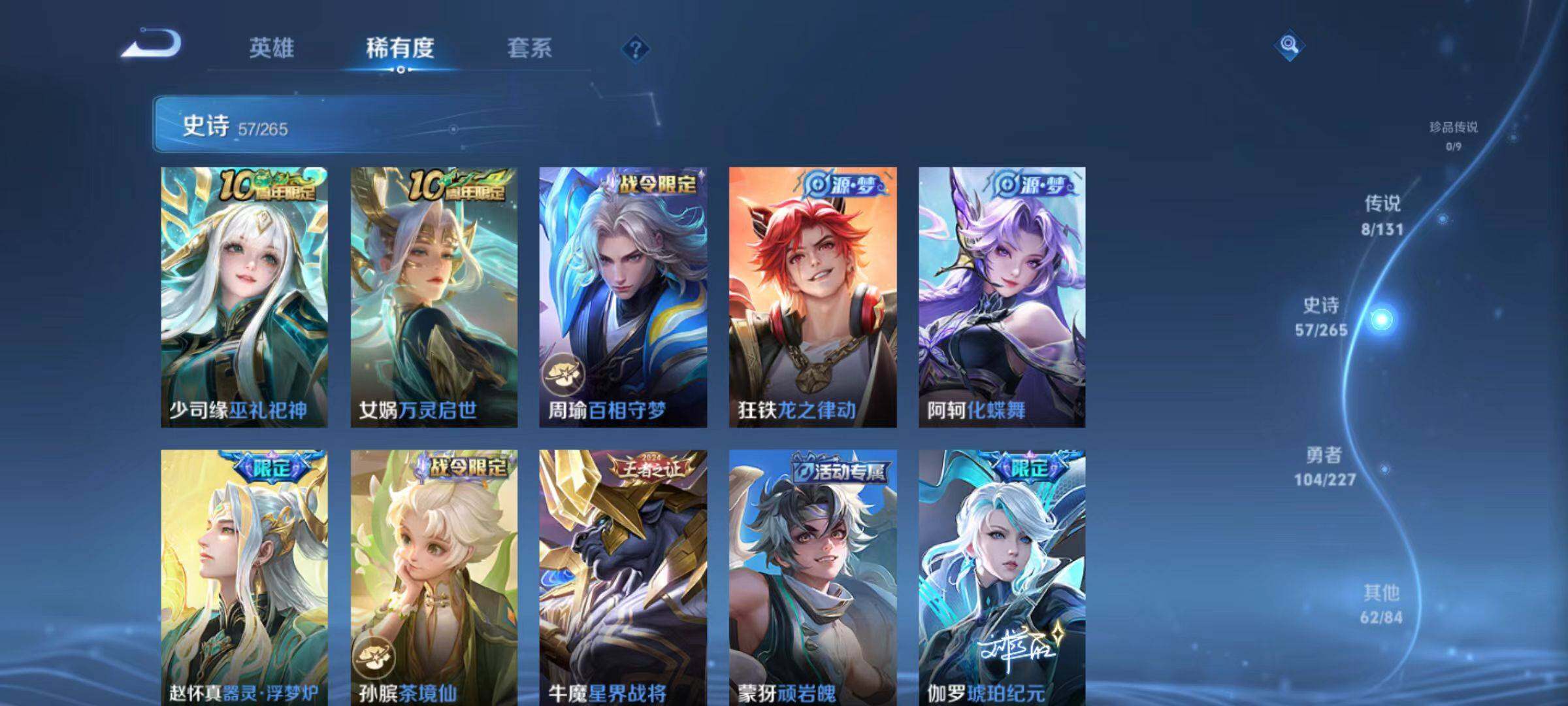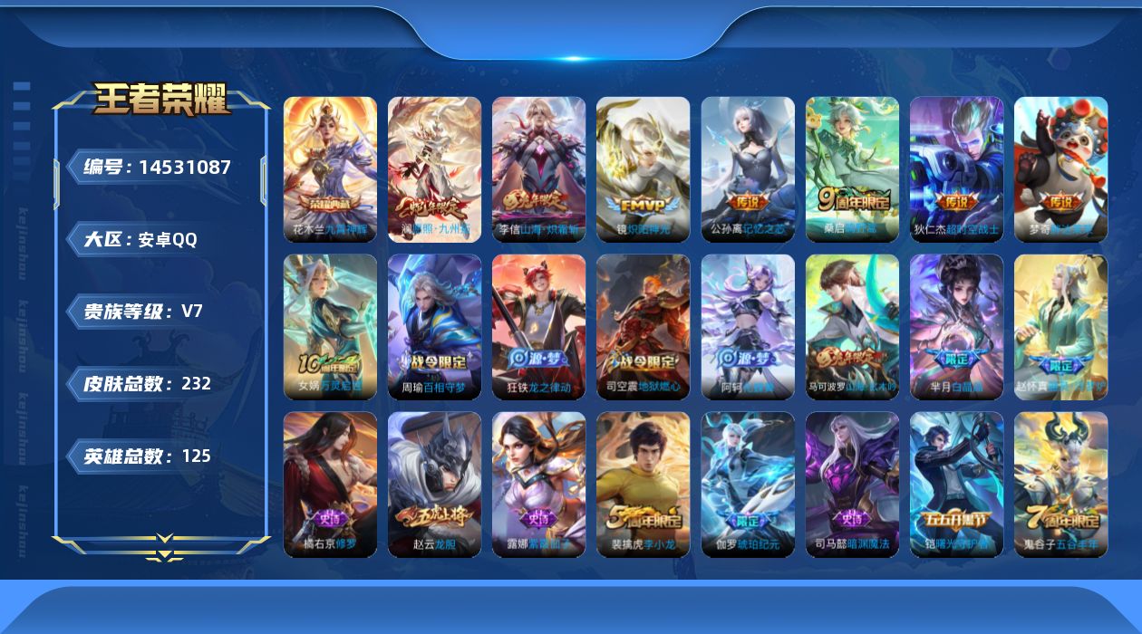[14531087]安卓q-v7-最强王者段位-125英雄-232皮肤-1典藏皮肤-8传说-57史诗 【英雄全皮】:孙权全皮,蒙恬全皮,影全皮 【荣耀典藏】:花木兰九霄神辉 【传说皮肤】:后羿神树通天,澜愿照九州拓,桑启鸣野蒿,公孙离记忆之芯,李信山海炽霜斩,镜炽阳神光,梦奇胖达荣荣,狄仁杰超时空战士 【限定皮肤】:蒙犽顽岩魄,姜子牙天穹之誓,杨戬破阵退雄兵,狄仁杰阴阳师,赵云皇家上将,赵云龙胆,孙尚香蔷薇恋人,芈月白晶晶,马可波罗山海玄木吟,狄仁杰魔术师,项羽海滩派对,兰陵王金庭之子,李元芳云中旅人,鬼谷子五谷丰年,沈梦溪大漠名商,裴擒虎李小龙,裴擒虎擒涛扼浪,云中君纤云弄巧,李信山海炽霜斩,嫦娥拒霜思,嫦娥暖冬兔眠,鲁班大师探海日志,桑启海盐诗旅,暃星界游侠,戈娅驭风魔法,艾琳女武神,艾琳流音漫舞,司空震地狱燃心,阿古朵江河有灵,张良古海寻踪,蒙恬荣光圣徽,高渐离燃音魔法,妲己灵卜魔法,鬼谷子天穹祈灯,伽罗琥珀纪元,沈梦溪龙舞盛年,刘邦剑破天穹,程咬金群星魔术团,周瑜熔金海岸 【年限皮肤】:赵云龙胆,马可波罗山海玄木吟,李信山海炽霜斩 【赛季限定】:兰陵王金庭之子,张良古海寻踪,李元芳云中旅人,沈梦溪大漠名商,裴擒虎擒涛扼浪,鲁班大师探海日志,桑启海盐诗旅,鬼谷子天穹祈灯,蒙恬荣光圣徽,刘邦剑破天穹,姜子牙天穹之誓 【战令限定】:艾琳流音漫舞,嫦娥暖冬兔眠,司空震地狱燃心,暃星界游侠,戈娅驭风魔法,高渐离燃音魔法,妲己灵卜魔法 【史诗皮肤】:露娜紫霞仙子,赵云皇家上将,赵云未来纪元,貂蝉圣诞恋歌,王昭君偶像歌手,狄仁杰魔术师,廉颇地狱岩魂,宫本武藏鬼剑武藏,孙尚香蔷薇恋人,孙尚香水果甜心,嬴政摇滚巨星,妲己魅力维加斯,墨子金属风暴,曹操幽灵船长,李白千年之狐,吕布末日机甲,张飞乱世虎臣,花木兰水晶猎龙者,兰陵王暗隐猎兽者,雅典娜冰冠公主,百里守约特工魅影,铠曙光守护者,蔡文姬舞动绿茵,刘禅天才门将,李元芳逐浪之夏,程咬金功夫厨神,白起星夜王子,孙策猫狗日记,伽罗箭羽风息,狄仁杰鹰眼统帅,橘右京修罗,赵云龙胆,裴擒虎李小龙,云中君纤云弄巧,芈月白晶晶,百里玄策热力回旋,司马懿暗渊魔法,嫦娥拒霜思,鬼谷子五谷丰年,暃星界游侠,马可波罗山海玄木吟,刘禅电玩爆裂旋风,戈娅驭风魔法,司空震地狱燃心,阿古朵江河有灵,妲己灵卜魔法,高渐离燃音魔法,蒙恬荣光圣徽,伽罗琥珀纪元,蒙犽顽岩魄,牛魔星