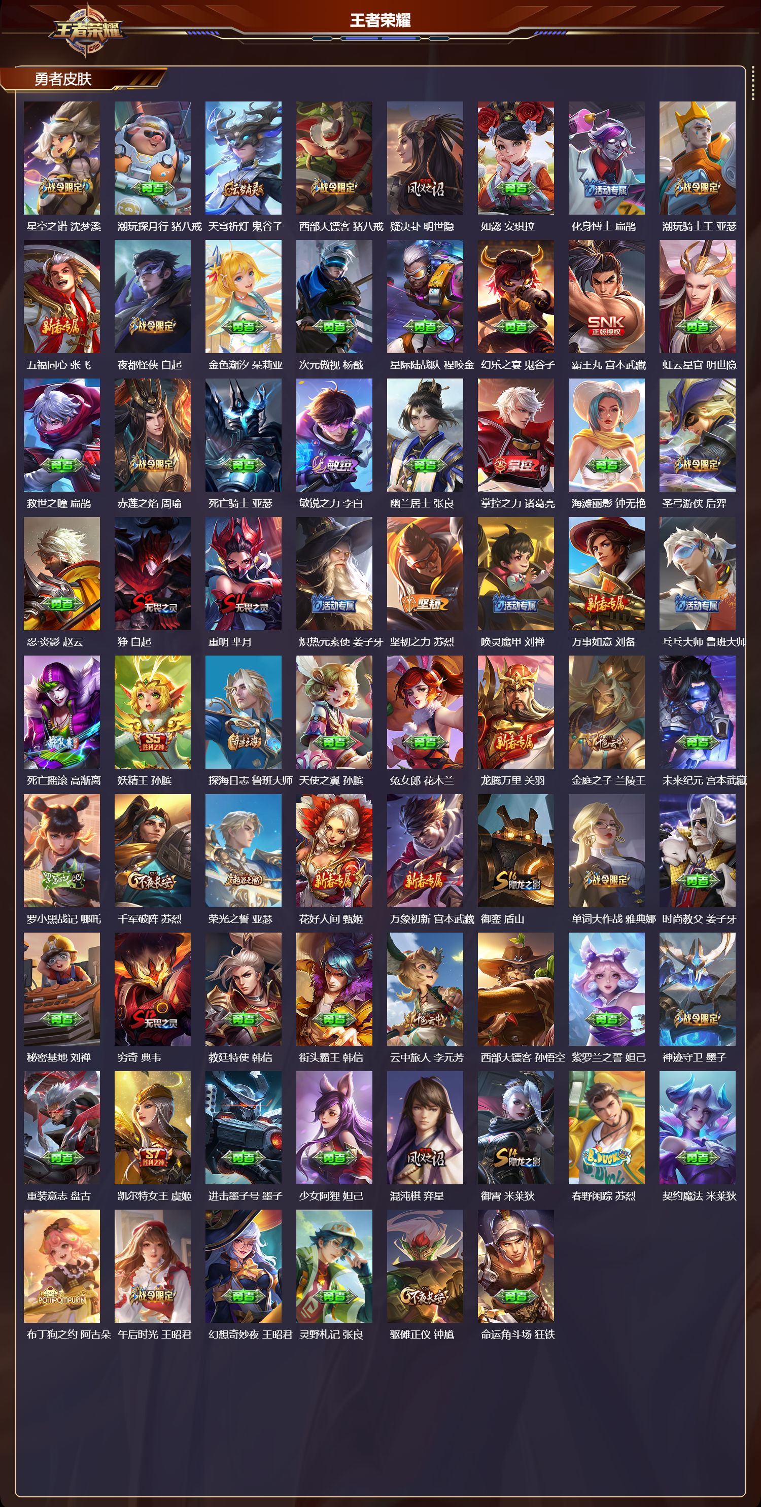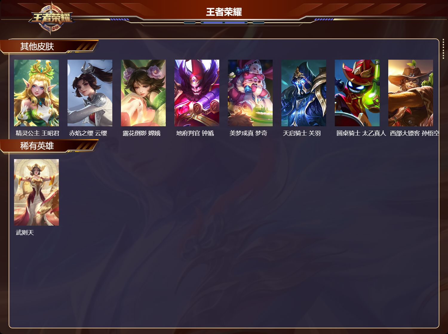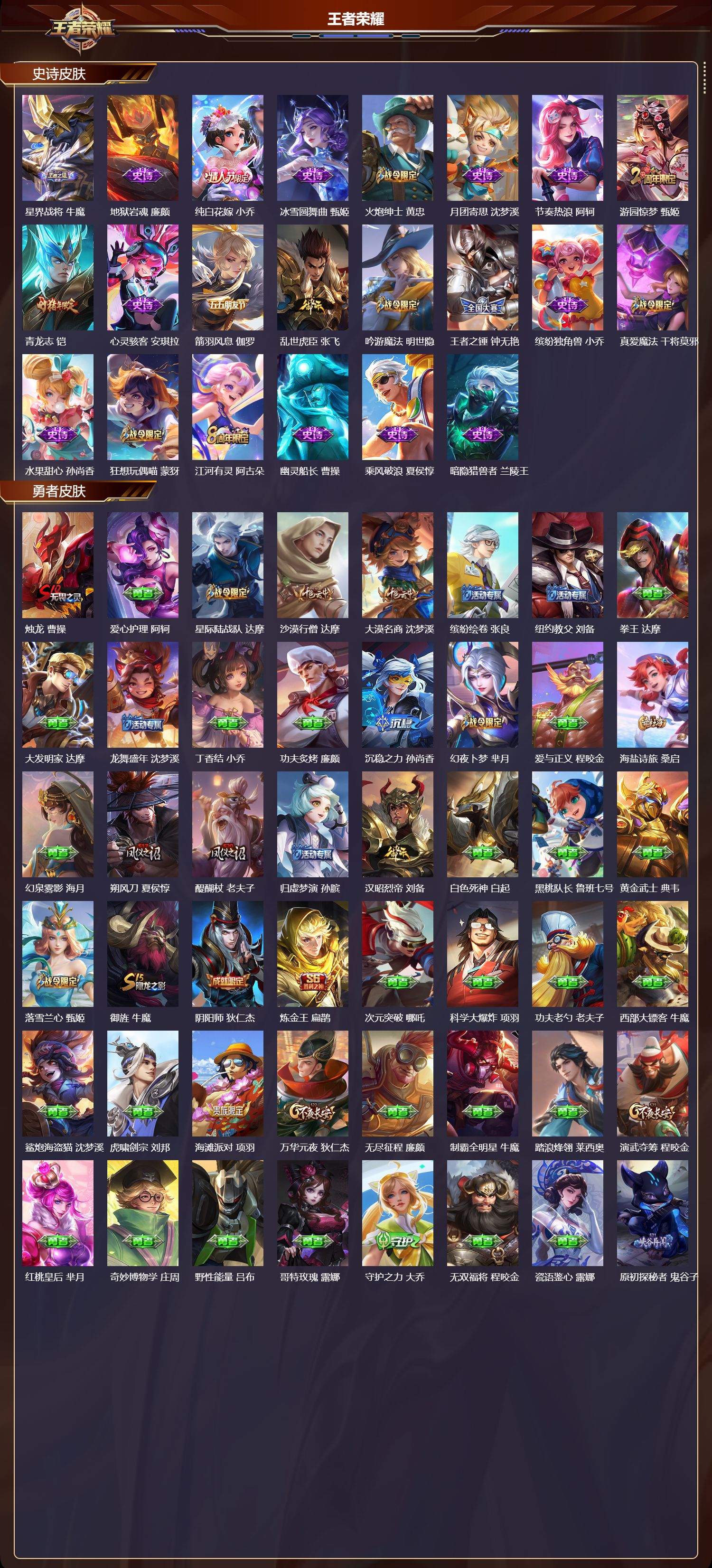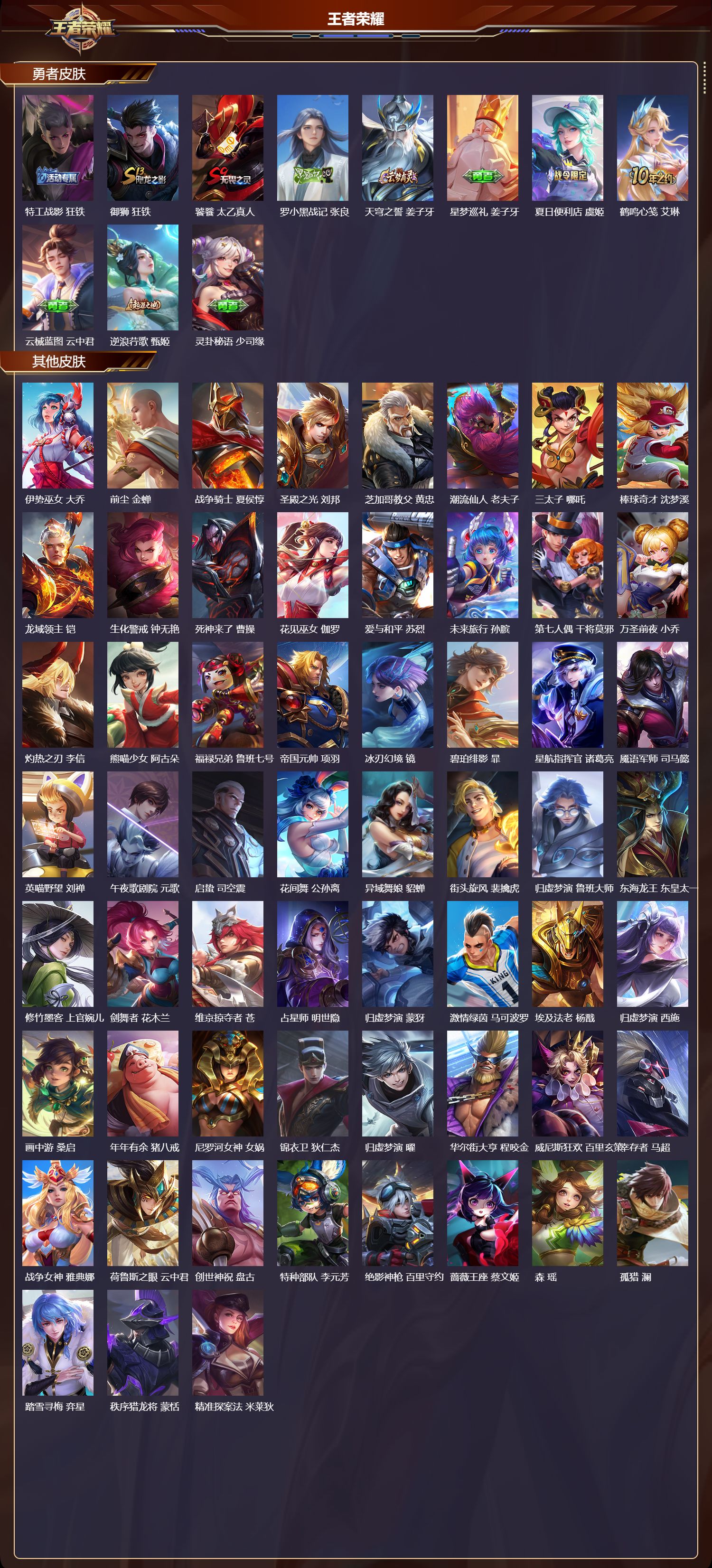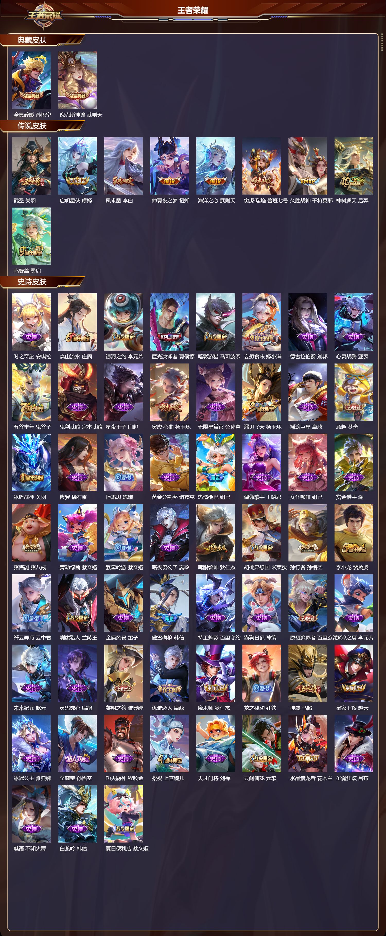 安卓qq/至圣王者/288皮肤/127英雄/2典藏/0珍品无双/0无双/0珍品传说/9传说/81史诗/9稀有英雄【2 典藏皮肤】全息碎影 孙悟空倪克斯神谕 武则天【9 传说皮肤】武圣 关羽启明星使 虞姬凤求凰 李白仲夏夜之梦 貂蝉海洋之心 武则天寅虎·瑞焰 鲁班七号久胜战神 干将莫邪神树通天 后羿鸣野蒿 桑启【81 史诗皮肤】时之奇旅 安琪拉高山流水 庄周银河之约 李元芳