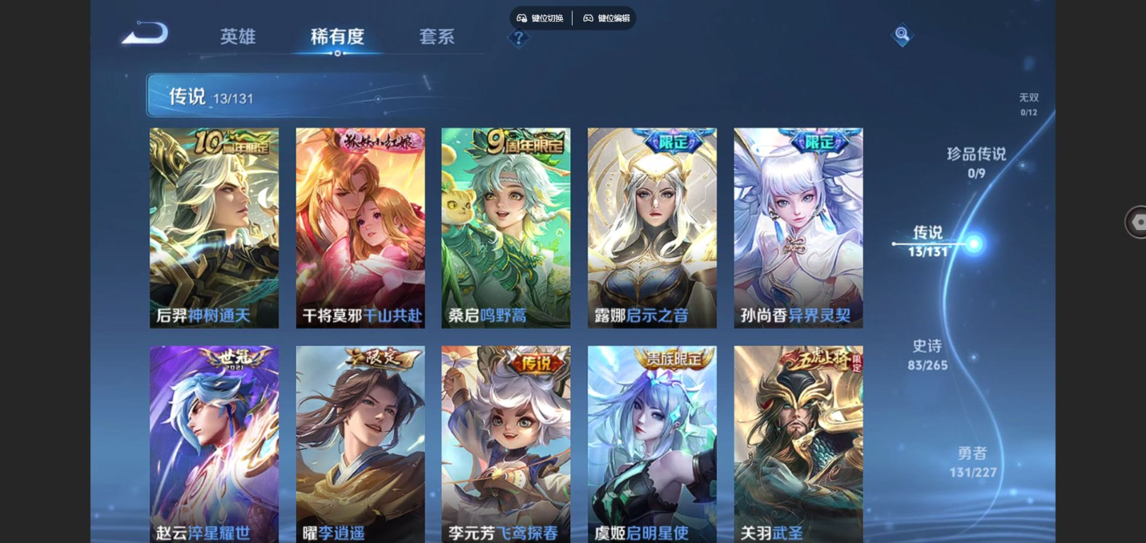 126英雄-302皮肤-124英雄-302皮肤v8-302皮肤2典藏13传说 打野31段 3星传说 时之思念 幽冥之眼 金色仲夏夜 【全皮英雄】 鬼谷子全皮 狂铁全皮 【典藏】 鸣剑曳影 弑呛猎影 【传说】 神树通天 千山共赴 鸣野蒿 启明星使 武圣 李 武陵仙君 异界灵契 启示之音 淬星耀世 云鹰飞将 飞鸢探春 仲夏夜之梦 【热门】万灵启世 神威 至尊宝 青龙志 寅虎心曲 飞衡 武圣 天狼绘