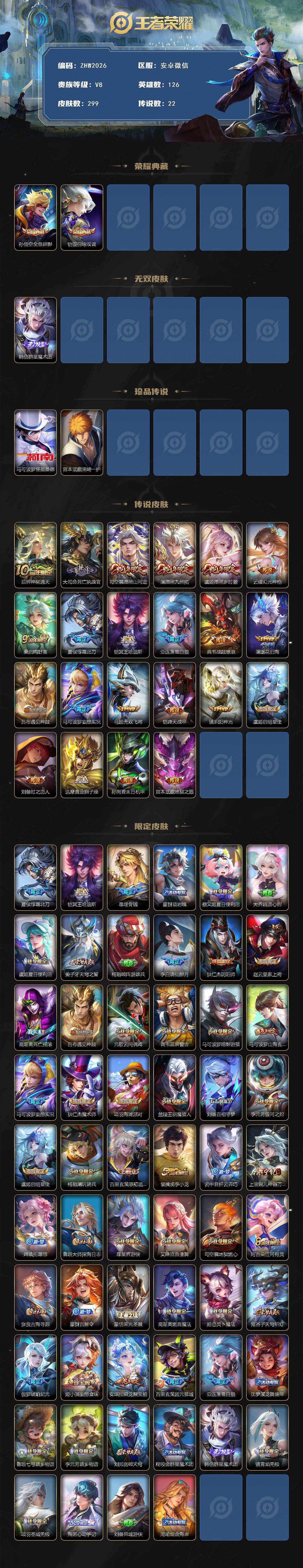 打野48段!1小兵!3星传!安卓wx-v8-最强王者段位-126英雄-299皮肤-2典藏皮肤-1无双-2珍品传说-22传说-91史诗 【英雄全皮】:刘备全皮,苍全皮,亚连全皮,蒙恬全皮,司空震全皮,空空儿全皮,影全皮,海诺全皮 【荣耀典藏】:孙悟空全息碎影,铠银白咏叹调 【无双皮肤】:韩信群星魔术团 【珍品传说】:马可波罗怪盗基德,宫本武藏黑崎一护 【传说皮肤】:后羿神树通天,大司命死亡执政官,司空震愿照山河定,澜愿照九州拓,虞姬愿照岁时盈,云缨幻光神呛,桑启鸣野蒿,夏侯惇霜北刀,铠冥王哈迪斯,亚连落雪白狼,典韦战鼓燎原,澜逐花归海,吕布遇见神鼓,马可波罗妄想实况,马超无双飞将,铠绛天战甲,镜炽阳神光,虞姬启明星使,刘备时之恋人,达摩黄金狮子座,孙尚香末日机甲,宫本武藏地狱之眼 【限定皮肤】:夏侯惇霜北刀,铠冥王哈迪斯,暃埋骨钱,蒙犽顽岩魄,蔡文姬夏日便利店,大乔绒语心约,虞姬夏日便利店,姜子牙天穹之誓,杨戬破阵退雄兵,李白谪仙醉月,狄仁杰阴阳师,赵云皇家上将,高渐离死亡摇滚,吕布遇见神鼓,元歌云间偶戏,典韦蓝屏警告,马可波罗暗影游猎,马可波罗山海玄木吟,马可波罗妄想实况,狄仁杰魔术师,项羽海滩派对,兰陵王驯魔猎人,刘备百相守梦,李元芳银河之约,虞姬启明星使,杨戬潮玩骑兵,百里玄策原初追逐者,裴擒虎李小龙,云中君纤云弄巧,上官婉儿神器万象笔,嫦娥拒霜思,鲁班大师探海日志,暃星界游侠,艾琳流音漫舞,司空震地狱燃心,阿古朵江河有灵,张良古海寻踪,蒙犽百解令,蒙恬荣光圣徽,高渐离燃音魔法,妲己灵卜魔法,鬼谷子天穹祈灯,伽罗琥珀纪元,姬小满妄想食味,安琪拉乘龙聚宝船,百里玄策超元猎域,亚连落雪白狼,沈梦溪龙舞盛年,鲁班七号蔬乡物语,李元芳蔬乡物语,刘邦剑破天穹,程咬金群星魔术团,韩信群星魔术团,镜青焰无极,项羽苍威无极,海诺心动手记,刘备异域游侠,周瑜熔金海岸 【年限皮肤】:马可波罗山海玄木吟,安琪拉乘龙聚宝船 【赛季限定】:张良古海寻踪,百里玄策原初追逐者,鲁班大师探海日志,鬼谷子天穹祈灯,蒙恬荣光圣徽,刘邦剑破天穹,姜子牙天穹之誓 【战令限定】:蔡文姬夏日便利店,虞姬夏日便利店,元歌云间偶戏,典韦蓝屏警告,马可波罗暗影游猎,兰陵王驯魔猎人,艾琳流音漫舞,李元芳银河之约,杨戬潮玩骑兵,司空震地狱燃心,暃星界游侠,高渐离燃音魔法,妲己灵卜魔法,鲁班七号蔬乡物语,李元芳蔬乡物语,镜青焰无极,项羽苍威无极 【史诗皮肤】:露娜紫霞仙子,赵云皇家上将,赵云未来纪元,貂蝉圣诞恋歌,甄姬冰雪圆舞曲,王昭君偶像歌手,狄仁杰魔术师,宫本武藏鬼剑武藏,孙尚香水果甜心,嬴政暗夜贵公子,妲己魅力维加斯,墨子金属风暴,吕布圣诞狂欢,刘禅绅士熊喵,曹操幽灵船长,李白千年之狐,刘邦德古拉伯爵,夏侯惇乘风破浪,小乔缤纷独角兽,兰陵王暗隐猎兽者,亚瑟心灵战警,雅典娜冰冠公主,铠曙光守护者,李元芳逐浪之夏,阿轲节奏热浪,孙策猫狗日记,大乔猫狗日记,典韦蓝屏警告,伽罗箭羽风息,狄仁杰鹰眼统帅,公孙离无限星赏官,兰陵王驯魔猎人,李元芳银河之约,娜可露露晚萤,不知火舞魅语,橘右京修罗,孙尚香时之恋人,马可波罗暗影游猎,百里玄策原初追逐者,裴擒虎李小龙,云中君纤云弄巧,元歌云间偶戏,沈梦溪月团寄思,司马懿暗渊魔法,嫦娥拒霜思,澜赏金猎手,上官婉儿神器万象笔,暃星界游侠,马可波罗山海玄木吟,刘备百相守梦,百里守约真我赫兹,司空震地狱燃心,阿古朵江河有灵,蒙犽百解令,妲己灵卜魔法,高渐离燃音魔法,蒙恬荣光圣徽,伽罗琥珀纪元,姬小满妄想食味,百里玄策超元猎域,安琪拉乘龙聚宝船,鲁班七号蔬乡物语,镜青焰无极,海诺心动手记,黄忠怒海争锋,蔡文姬夏日便利店,蒙犽顽岩魄,暃埋骨钱,姬小满战舞者,亚连破空之剑,马可波罗星界特工,李白谪仙醉月,艾琳陌上桑,百里守约百相守梦,牛魔星界战将,孙膑茶境仙,白起苍鳞隐世,赵怀真器灵浮梦炉,亚连糖绘人间,苍狼魂孤将,狄仁杰绮世丹青,阿轲化蝶舞,刘禅鸭鸭历险记,狂铁龙之律动,老夫子藏狐褐绒,后羿石田雨龙,周瑜百相守梦,黄忠百相守梦,西施织梦人,公孙离涂山容容,女娲万灵启世,少司缘巫礼祀神 【其他皮肤】:项羽海滩派对,韩信教廷特使,韩信街头霸王,露娜哥特玫瑰,赵云白执事,赵云忍炎影,芈月红桃皇后,白起白色死神,牛魔西部大镖客,庄周鲤鱼之梦,孙膑天使之翼,姜子牙时尚教父,典韦黄金武士,亚瑟死亡骑士,达摩拳王,花木兰兔女郎,张飞五福同心,刘备万事如意,宫本武藏万象初新,后羿阿尔法小队,狄仁杰阴阳师,刘备纽约教父,高渐离死亡摇滚,刘备汉昭烈帝,李元芳黑猫爱糖果,关羽龙腾万里,墨子进击墨子号,钟无艳海滩丽影,王昭君幻想奇妙夜,狂铁命运角斗场,老夫子功夫老勺,孙尚香沉稳之力,诸葛亮掌控之力,鬼谷子幻乐之宴,明世隐虹云星官,张良幽兰居士,沈梦溪鲨炮海盗猫,哪吒次元突破,鲁班七号黑桃队长,盾山圆桌骑士,狂铁特工战影,廉颇无尽征程,刘禅秘密基地,杨戬次元傲视,露娜瓷语鉴心,盘古重装意志,鲁班大师乓乓大师,典韦铁甲之心,马可波罗潮玩牛仔,程咬金无双福将,刘邦虎啸剑宗,米莱狄契约魔法,蒙犽胡桃狂想曲,蒙恬蔚蓝守将,戈娅危途狂花,刘备潮玩造梦师,猪八戒潮玩探月行,杨戬潮玩骑兵,太乙真人劲辣红锅,莱西奥西部游侠,鲁班大师探海日志,姬小满零食大作战,李元芳妄想特派,艾琳流音漫舞,张良古海寻踪,钟无艳聚星