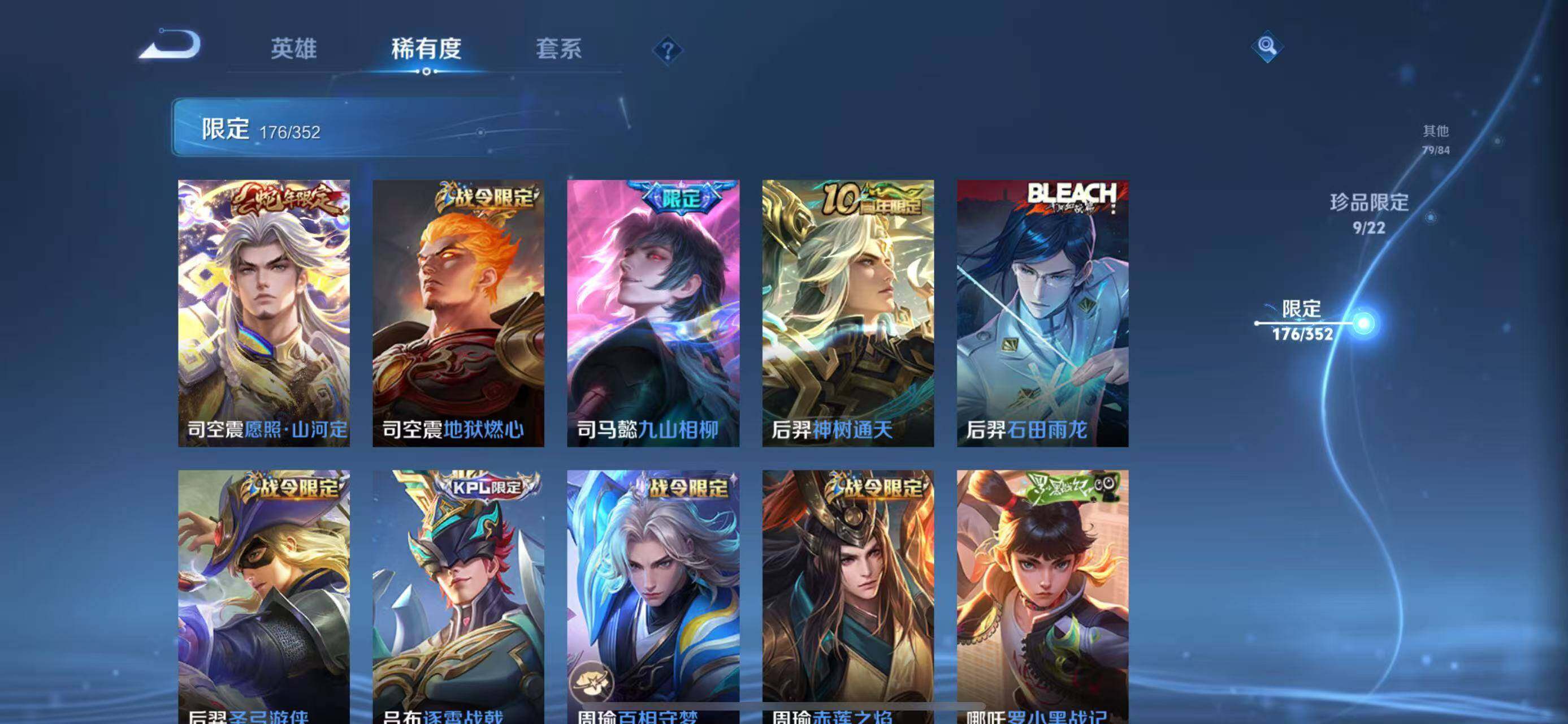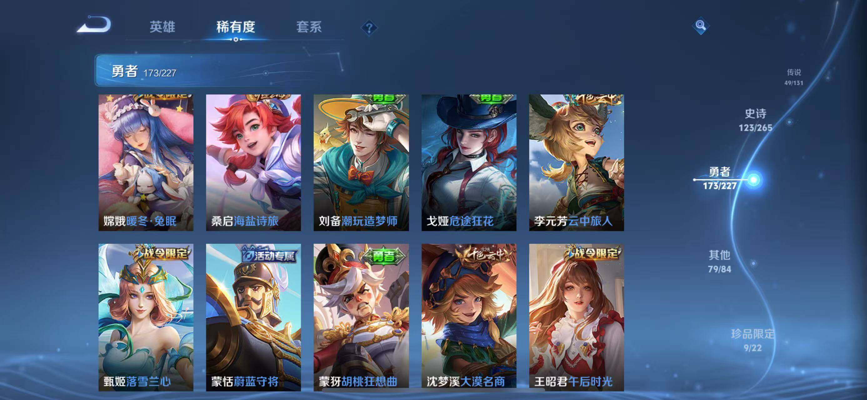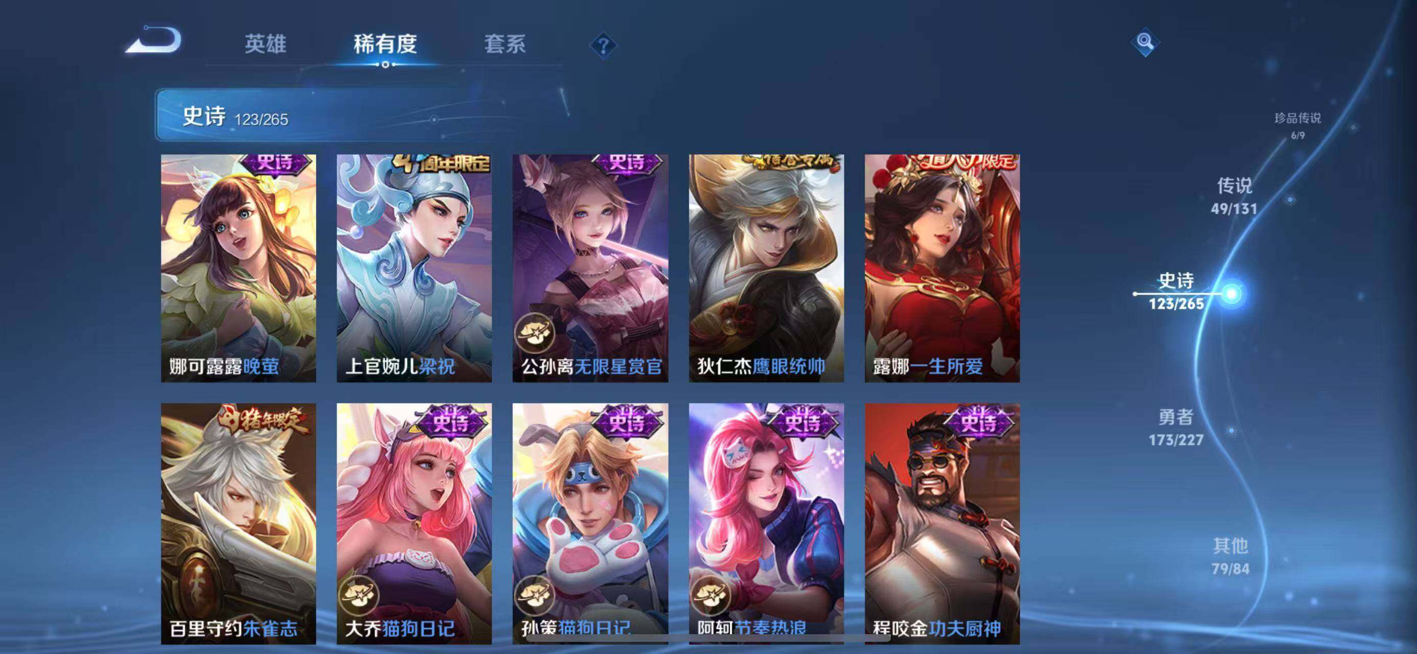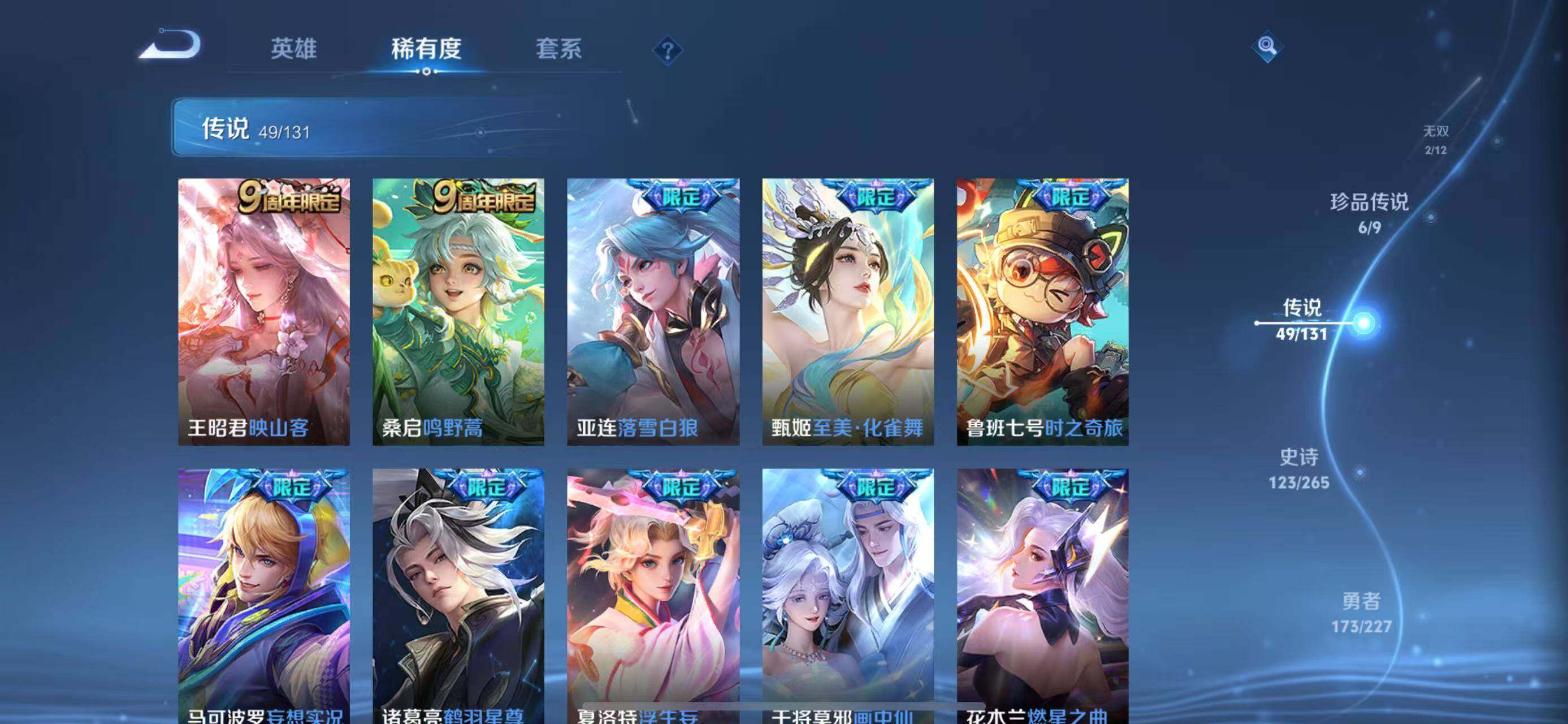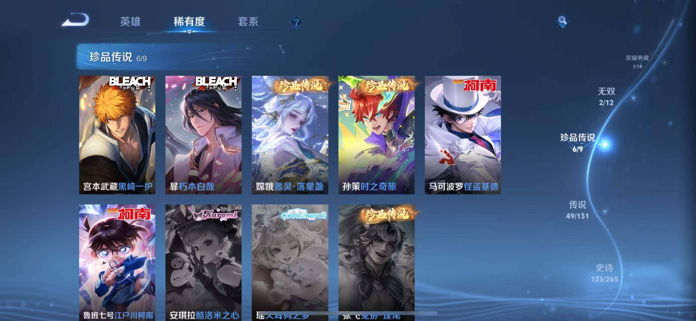【wzsa996】贵族9/皮肤434/典藏1/传说49/史诗123/英雄127/刘邦全皮/孙权全皮/橘右京全皮/鬼谷子全皮/盾山全皮/猪八戒全皮/蒙恬全皮/镜全皮/司空震全皮/暃全皮/空空儿全皮/影全皮/海诺全皮/李白-鸣剑·曳影/貂蝉-馥梦繁花/小乔-时之魔女/曜-器灵·螭龙剑/马可波罗-怪盗基德/鲁班七号-江户川柯南/孙策-时之奇旅/嫦娥-器灵·落星盏/暃-朽木白哉/宫本武藏-黑崎一护/后
