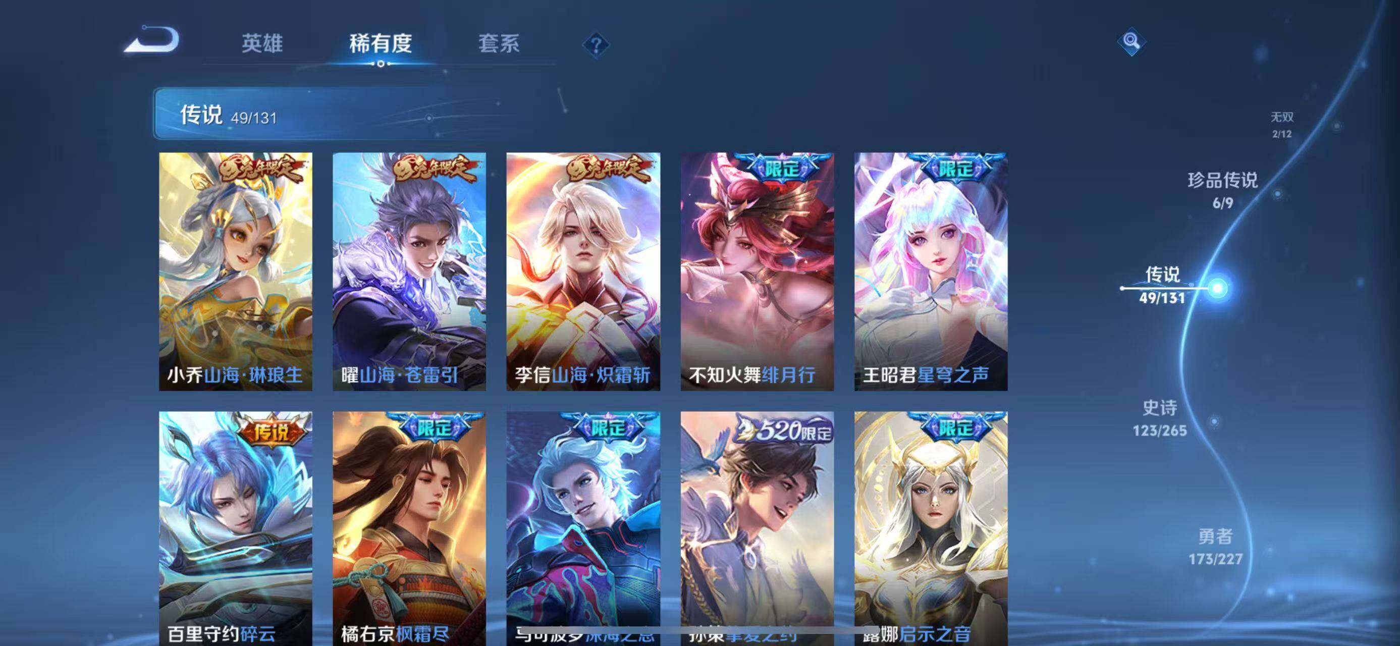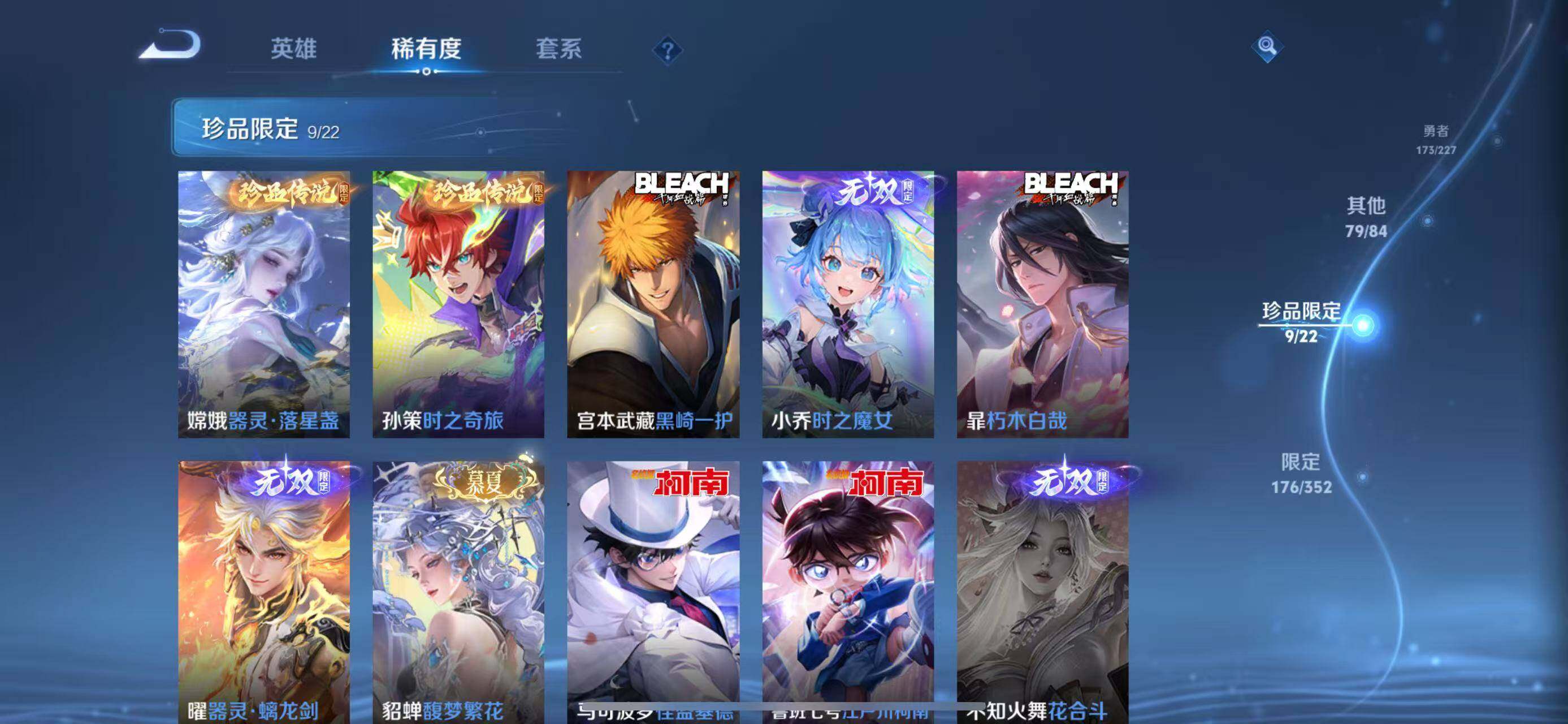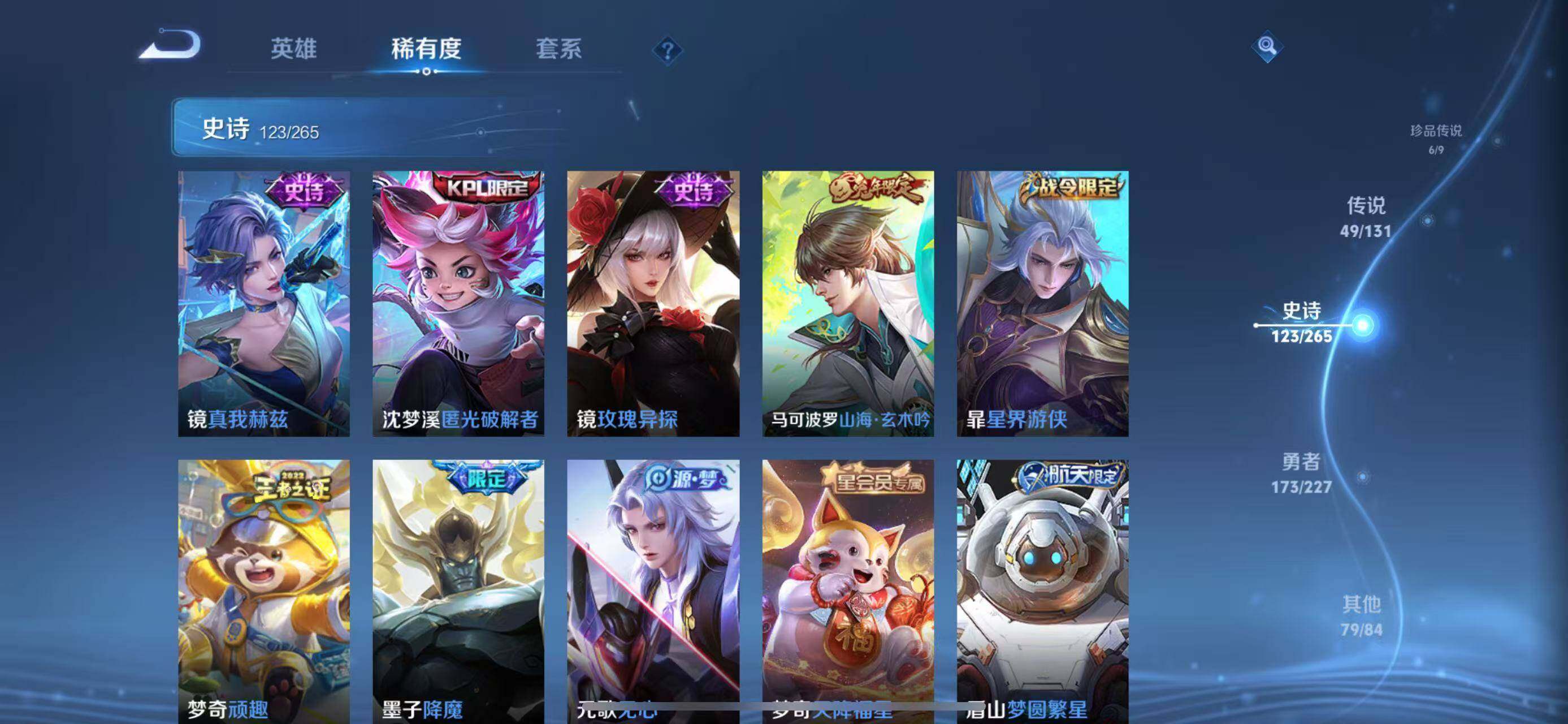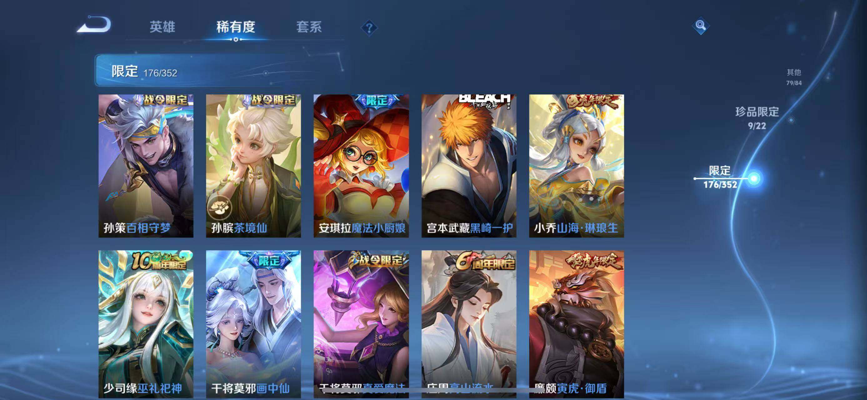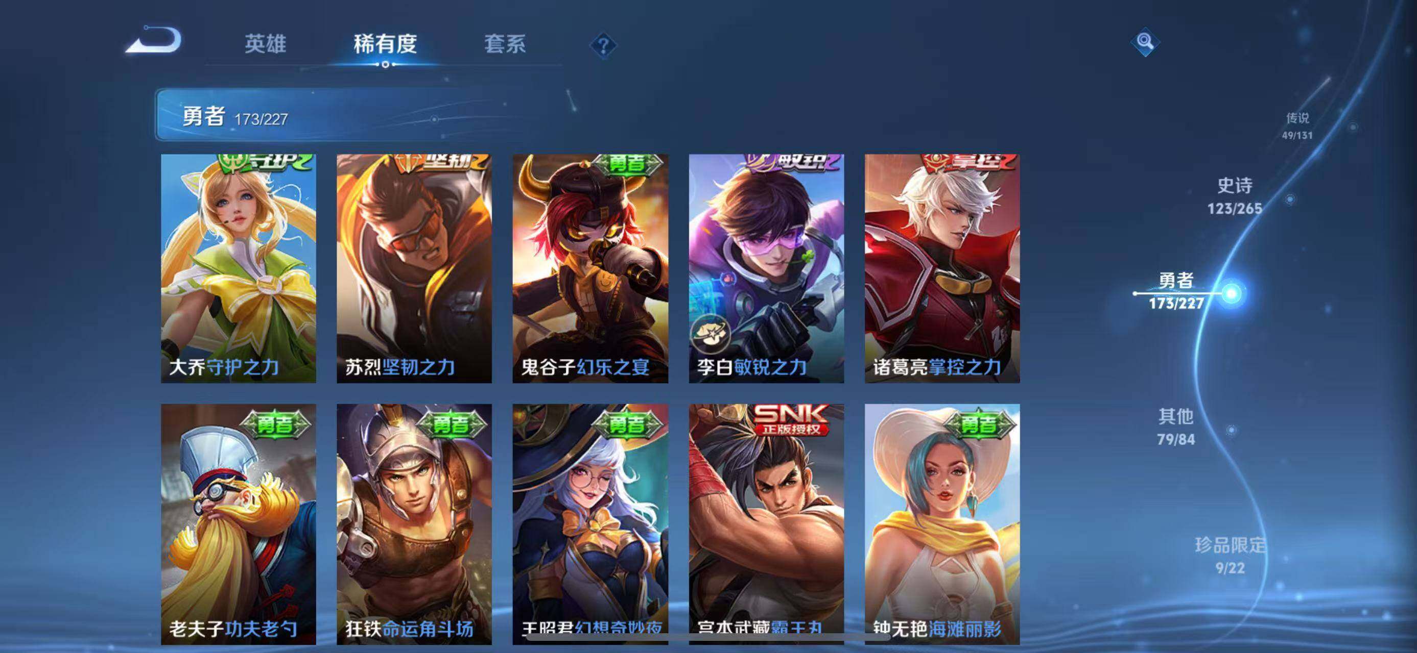 【wzsa996】贵族9/皮肤434/典藏1/传说49/史诗123/英雄127/刘邦全皮/孙权全皮/橘右京全皮/鬼谷子全皮/盾山全皮/猪八戒全皮/蒙恬全皮/镜全皮/司空震全皮/暃全皮/空空儿全皮/影全皮/海诺全皮/李白-鸣剑·曳影/貂蝉-馥梦繁花/小乔-时之魔女/曜-器灵·螭龙剑/马可波罗-怪盗基德/鲁班七号-江户川柯南/孙策-时之奇旅/嫦娥-器灵·落星盏/暃-朽木白哉/宫本武藏-黑崎一护/后