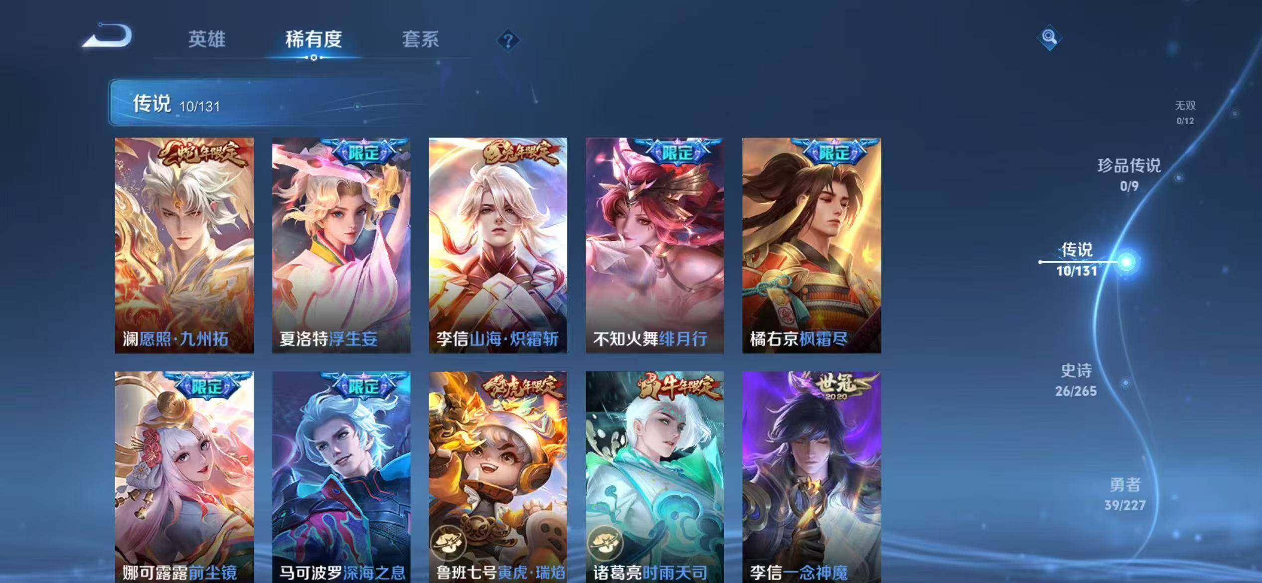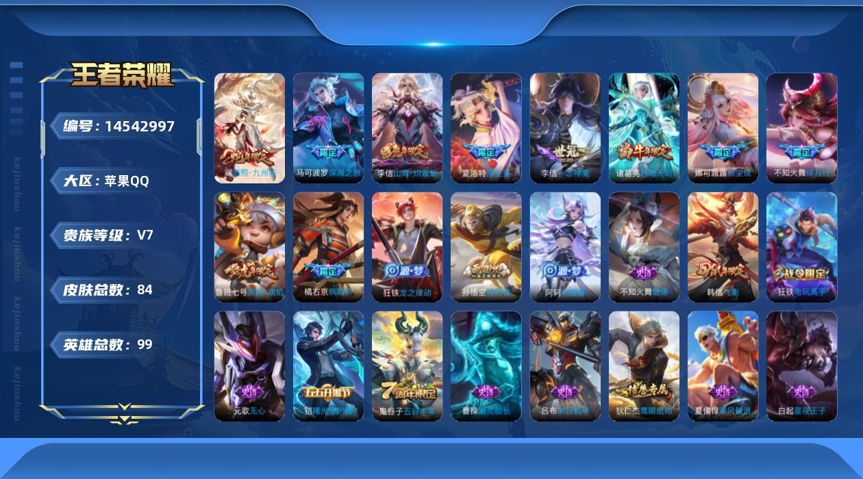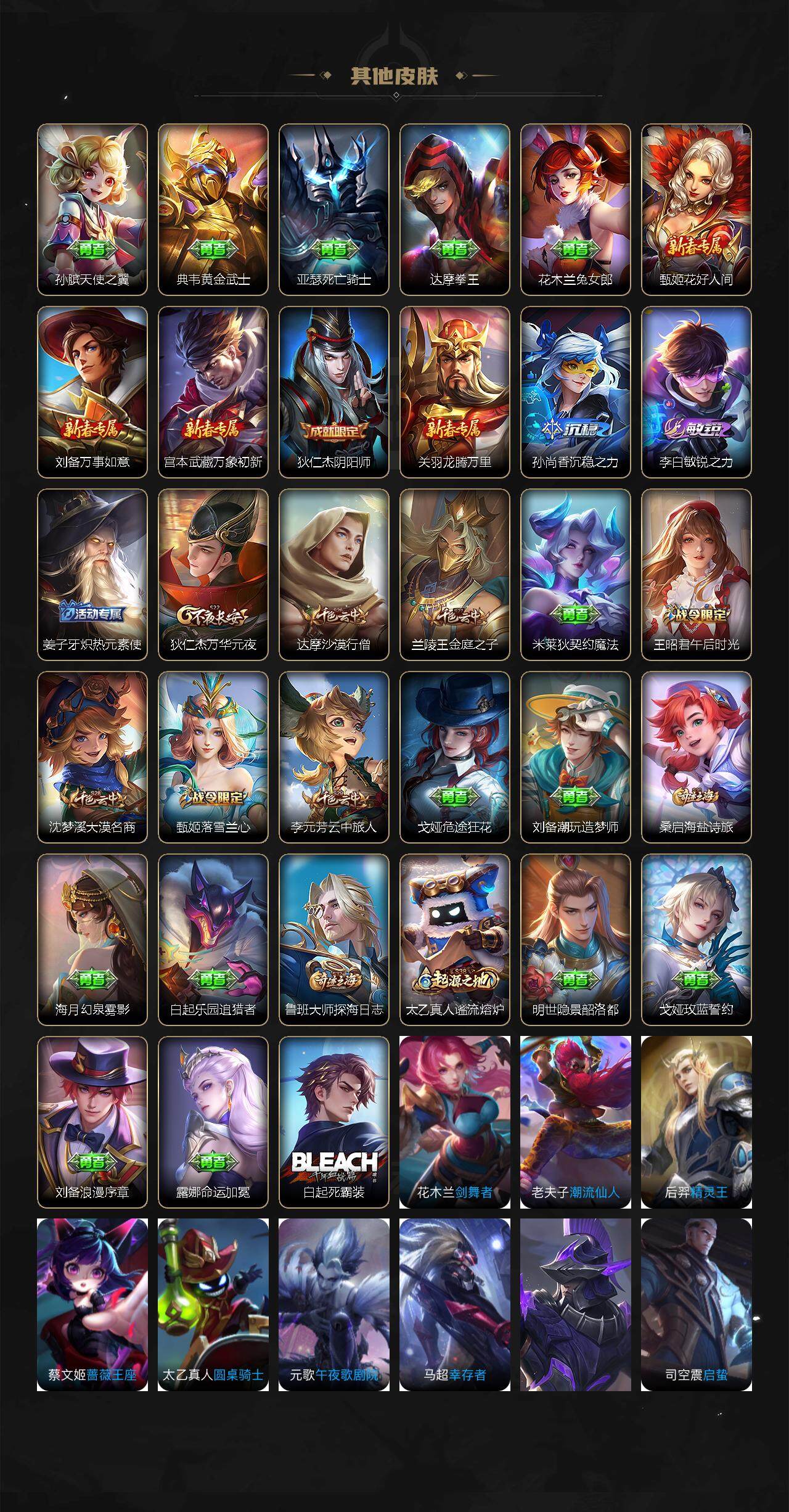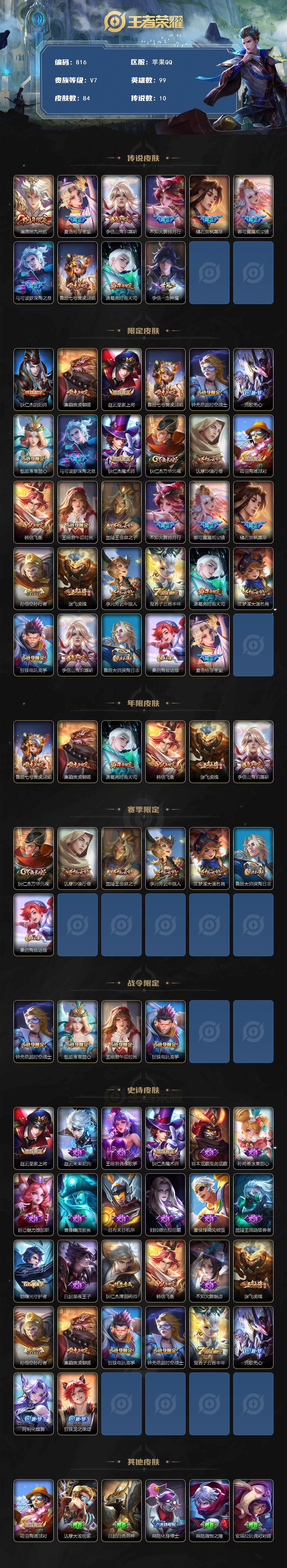[14542997]v7-99英雄-84皮肤-10传说-26史诗 紫星币2400 yh7044 【传说皮肤】:澜愿照九州拓,夏洛特浮生妄,李信山海炽霜斩,不知火舞绯月行,橘右京枫霜尽,娜可露露前尘镜,马可波罗深海之息,鲁班七号寅虎瑞焰,诸葛亮时雨天司,李信一念神魔 【限定皮肤】:狄仁杰阴阳师,廉颇寅虎御盾,赵云皇家上将,鲁班七号寅虎瑞焰,钟无艳超时空战士,元歌无心,甄姬落雪兰心,马可波罗深海之息,狄仁杰魔术师,狄仁杰万华元夜,达摩沙漠行僧,项羽海滩派对,韩信飞衡,王昭君午后时光,兰陵王金庭之子,不知火舞绯月行,娜可露露前尘镜,橘右京枫霜尽,孙悟空孙行者,张飞虎魄,李元芳云中旅人,鬼谷子五谷丰年,诸葛亮时雨天司,沈梦溪大漠名商,狂铁电玩高手,李信山海炽霜斩,鲁班大师探海日志,桑启海盐诗旅,夏洛特浮生妄 【年限皮肤】:鲁班七号寅虎瑞焰,廉颇寅虎御盾,诸葛亮时雨天司,韩信飞衡,张飞虎魄,李信山海炽霜斩 【赛季限定】:狄仁杰万华元夜,达摩沙漠行僧,兰陵王金庭之子,李元芳云中旅人,沈梦溪大漠名商,鲁班大师探海日志,桑启海盐诗旅 【战令限定】:钟无艳超时空战士,甄姬落雪兰心,王昭君午后时光,狂铁电玩高手 【史诗皮肤】:赵云皇家上将,赵云未来纪元,王昭君偶像歌手,狄仁杰魔术师,宫本武藏鬼剑武藏,孙尚香水果甜心,妲己魅力维加斯,曹操幽灵船长,吕布末日机甲,刘邦德古拉伯爵,夏侯惇乘风破浪,兰陵王暗隐猎兽者,铠曙光守护者,白起星夜王子,狄仁杰鹰眼统帅,韩信飞衡,不知火舞魅语,张飞虎魄,孙悟空孙行者,廉颇寅虎御盾,狂铁电玩高手,钟无艳超时空战士,鬼谷子五谷丰年,元歌无心,阿轲化蝶舞,狂铁龙之律动 【其他皮肤】:项羽海滩派对,达摩大发明家,白起白色死神,扁鹊化身博士,扁鹊救世之瞳,安琪拉玩偶对对碰,孙膑天使之翼,典韦黄金武士,亚瑟死亡骑士,达摩拳王,花木兰兔女郎,甄姬花好人间,刘备万事如意,宫本武藏万象初新,狄仁杰阴阳师,关羽龙腾万里,孙尚香沉稳之力,李白敏锐之力,姜子牙炽热元素使,狄仁杰万华元夜,达摩沙漠行僧,兰陵王金庭之子,米莱狄契约魔法,王昭君午后时光,沈梦溪大漠名商,甄姬落雪兰心,李元芳云中旅人,戈娅危途狂花,刘备潮玩造梦师,桑启海盐诗旅,海月幻泉雾影,白起乐园追猎者,鲁班大师探海日志,太乙真人谧流熔炉,明世隐景韶洛都,戈娅玫蓝誓约,刘备浪漫序章,露娜命运加冕,白起死霸装,花木兰剑舞者,老夫子潮流