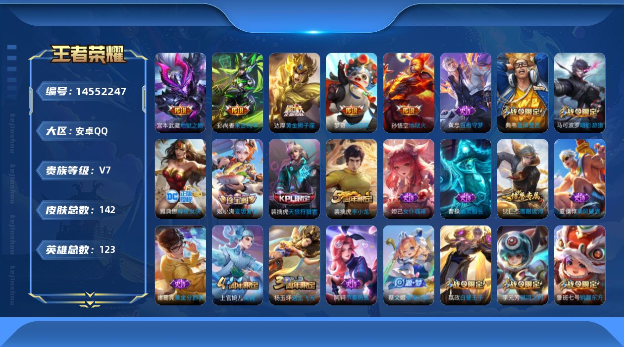 [14552247]v7 5传说 123英雄 142皮肤 可修改实名 【稀有英雄】:大司命嬴政始皇帝韩信韩跳跳夏洛特夏师傅艾琳橘右京橘子娜可露露鸟人不知火舞赵云金蝉唐僧戈娅 【传说皮】:黄金狮子座地狱火地狱之眼末日机甲-孙尚香绿蚂蚱胖达荣荣 【珍宝阁皮】:妄想食味 【赛季/战令皮】:饕餮s9烛龙s10重明s11穷奇s12御狮s13御霄s14御旌s15御銮s16朔风刀s17混沌棋s18疑决卦s19醍醐杖s20原初探秘者s21万华元夜s22驱傩正仪s24猎兽之王白昼王子朔望之晖蓝屏警告神迹守卫-钟馗狮舞东方星空之诺银河之约西部大镖客-猪八戒暗影游猎游乐娃子 【史诗皮】:百相守梦-黄忠黄金分割率冰冠公主乱世虎臣节奏热浪女仆咖啡功夫厨神幽灵船长鬼剑武藏繁星吟游呼啦呼啦缤纷独角兽乘风破浪逐浪之夏金属风暴鹰眼统帅魅力维加斯 【限定皮】:遇见飞天梁祝天狼狩猎者李小龙神奇女侠 【普通皮】:街头霸王鹤鸣心笺锦麟游梦踏浪烽翎逆浪荇歌威尼斯狂欢尼罗河女神万事如意龙腾万里花好人间归虚梦演-蒙犽归虚梦演-曜海滩丽影海滩派对皇家上将魔术师坚韧之力霸王丸化身博士纽约教父圆桌骑士(盾山)万象初新次元突破大发明家天使之翼功夫老勺哥特玫瑰鲨炮海盗猫西部大镖客牛魔教廷特使进击墨子号阴阳师汉昭烈帝兔女郎死亡骑士少女阿狸忍·炎影白执事秘密基地白色死神拳王玩偶对对碰阿尔法小队幻乐之宴虹云星官灼热之刃幸存者伊势巫女爱与和平踏雪寻梅三太子龙域领主第七人偶地府判官埃及法老圣殿之光金属狂潮福禄兄弟蔷薇王座维京掠夺者潮流仙人东海龙王激情绿茵精灵王加勒比小姐死神来了芝加哥教父创世神祝年年有余棒球奇才魇语军师海之征途午夜歌剧院命运角斗场街头旋风占星师绝影神呛阿摩司公爵战争骑士特种部队范海辛隐刃绯红之刃木偶奇遇记西部大镖客-孙悟空海军大将精灵公主一千零一夜英喵野望无双福将