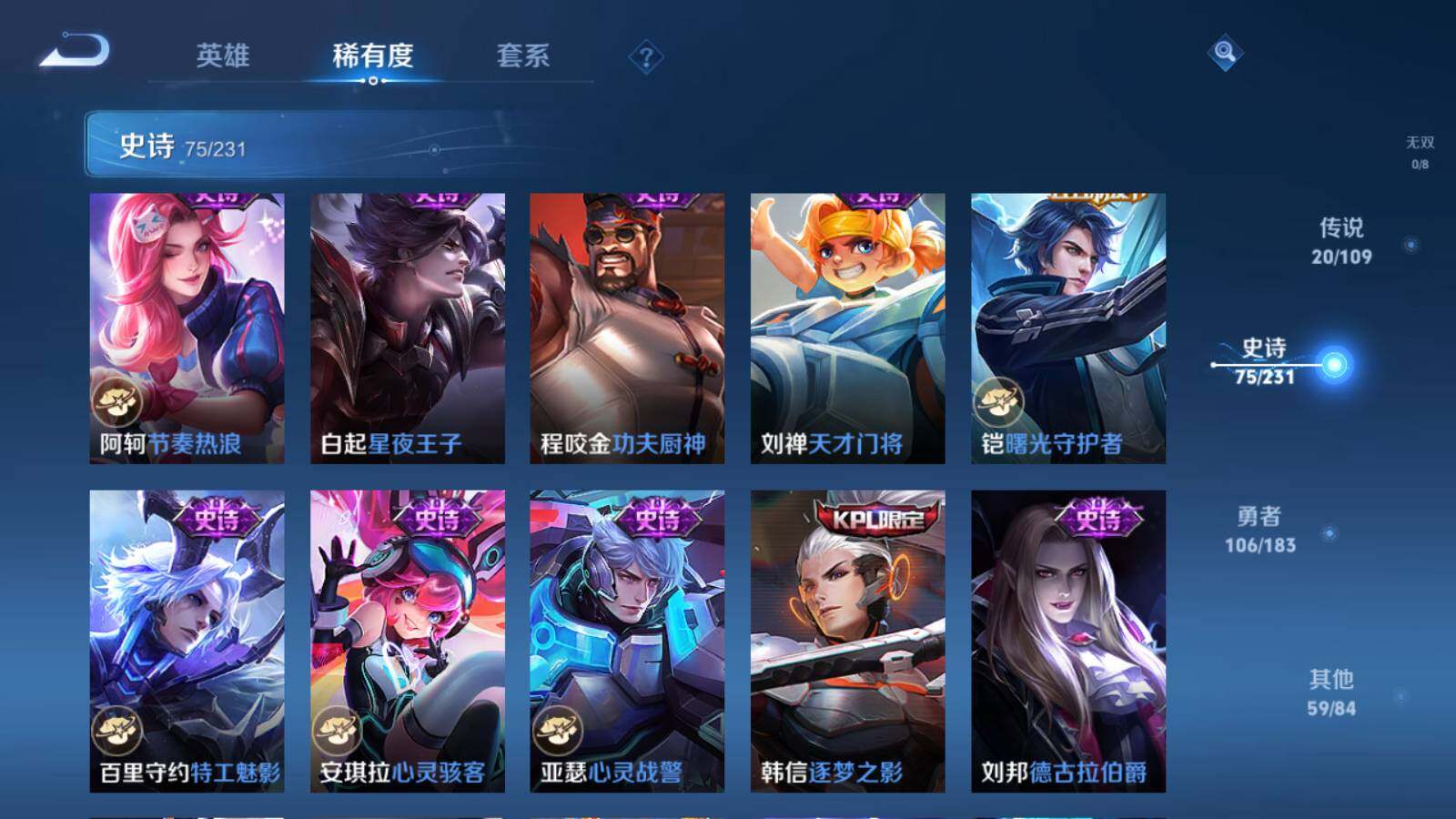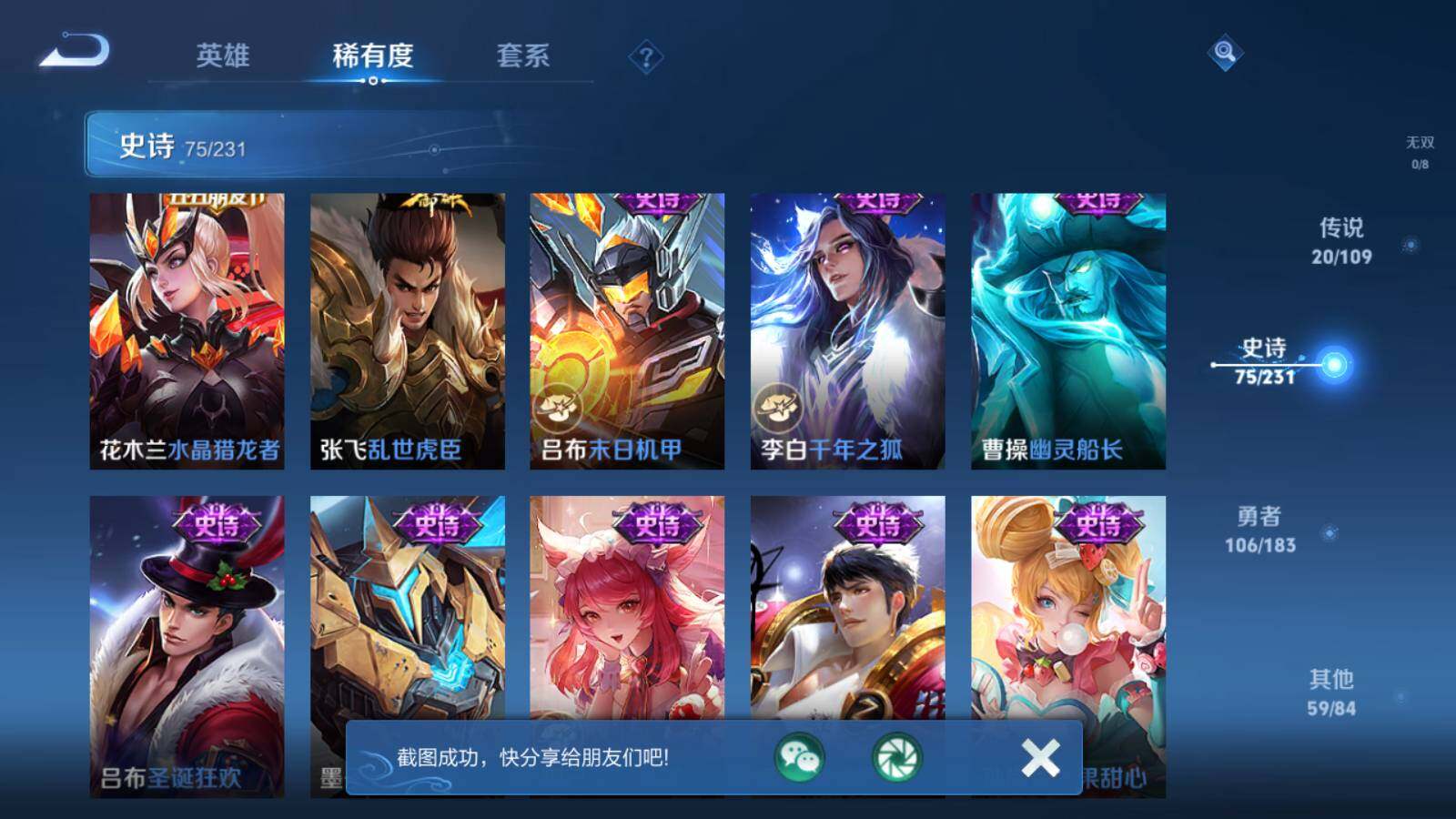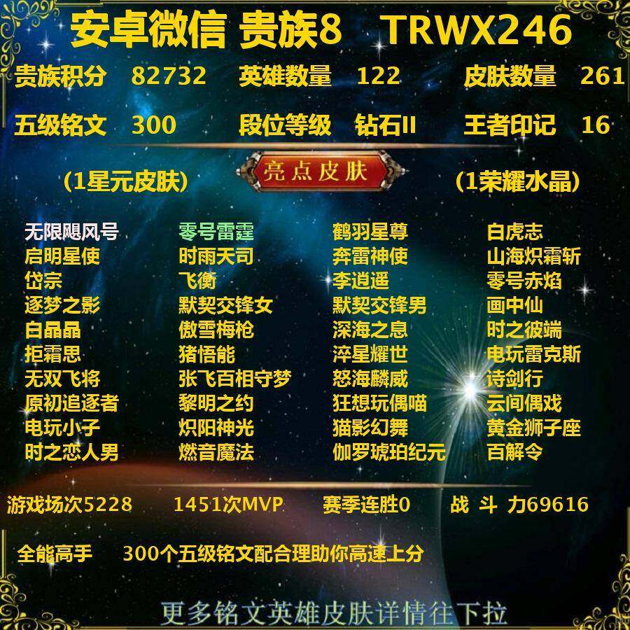 _2295049-wx-v8-至尊星耀iv段位-122英雄-267皮肤-1典藏-0珍品无双-0无双-0珍品传说-20传说-75史诗 【荣耀典藏】:夏侯惇无限飓风号 【传说皮肤】:诸葛亮鹤羽星尊,澜电玩雷克斯,张飞百相守梦,干将莫邪画中仙,李信山海炽霜斩,吕布怒海麟威,李白诗剑行,马可波罗深海之息,马超无双飞将,赵云淬星耀世,曜李,兰陵王默契交锋,诸葛亮时雨天司,镜炽阳神光,虞姬启明星使,孙悟空零号赤焰,刘备时之恋人,貂蝉猫影幻舞,达摩黄金狮子座,百里玄策白虎志 【限定皮肤】:姜子牙天穹之誓,狄仁杰阴阳师,赵云皇家上将,墨子神迹守卫,妲己时之彼端,孙尚香蔷薇恋人,高渐离死亡摇滚,扁鹊奇幻香踪,芈月白晶晶,芈月幻夜卜梦,元歌云间偶戏,元歌无心,夏侯惇朔风刀,典韦岱宗,马可波罗深海之息,狄仁杰魔术师,狄仁杰万华元夜,达摩星际陆战队,达摩沙漠行僧,项羽海滩派对,老夫子航海奇遇记,关羽百相守梦,程咬金演武夺筹,韩信逐梦之影,韩信飞衡,韩信傲雪梅呛,王昭君午后时光,兰陵王默契交锋,兰陵王金庭之子,花木兰默契交锋,亚瑟潮玩骑士王,孙悟空零号赤焰,牛魔奔雷神使,刘备百相守梦,张飞百相守梦,李元芳云中旅人,虞姬启明星使,钟馗驱傩正仪,杨戬潮玩骑兵,干将莫邪画中仙,雅典娜单词大作战,雅典娜黎明之约,太乙真人华丽摇滚,鬼谷子原初探秘者,鬼谷子五谷丰年,诸葛亮时雨天司,诸葛亮鹤羽星尊,黄忠火炮绅士,苏烈千军破阵,百里玄策白虎志,百里玄策原初追逐者,弈星混沌棋,梦奇顽趣,沈梦溪大漠名商,沈梦溪匿光破解者,明世隐疑决卦,裴擒虎李小龙,裴擒虎擒涛扼浪,狂铁御狮,狂铁电玩高手,米莱狄御霄,米莱狄胡桃异想国,云中君纤云弄巧,李信山海炽霜斩,盾山御銮,猪八戒猪悟能,嫦娥拒霜思,嫦娥暖冬兔眠,曜李,蒙犽狂想玩偶喵,鲁班大师探海日志,桑启海盐诗旅,暃星界游侠,艾琳女武神,艾琳流音漫舞,司空震地狱燃心,阿古朵江河有灵,张良古海寻踪,蒙犽百解令,蒙恬荣光圣徽,高渐离燃音魔法,妲己灵卜魔法,鬼谷子天穹祈灯,伽罗琥珀纪元,沈梦溪龙舞盛年,刘邦剑破天穹 【年限皮肤】:百里玄策白虎志,牛魔奔雷神使,诸葛亮时雨天司,韩信飞衡,典韦岱宗,李信山海炽霜斩 【赛季限定】:夏侯惇朔风刀,狄仁杰万华元夜,达摩沙漠行僧,程咬金演武夺筹,兰陵王金庭之子,张良古海寻踪,李元芳云中旅人,钟馗驱傩正仪,雅典娜黎明之约,鬼谷子原初探秘者,苏