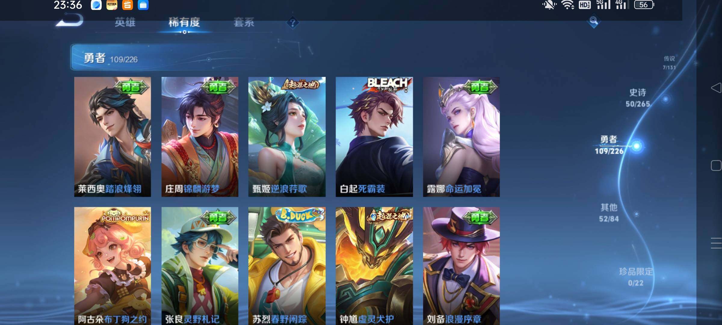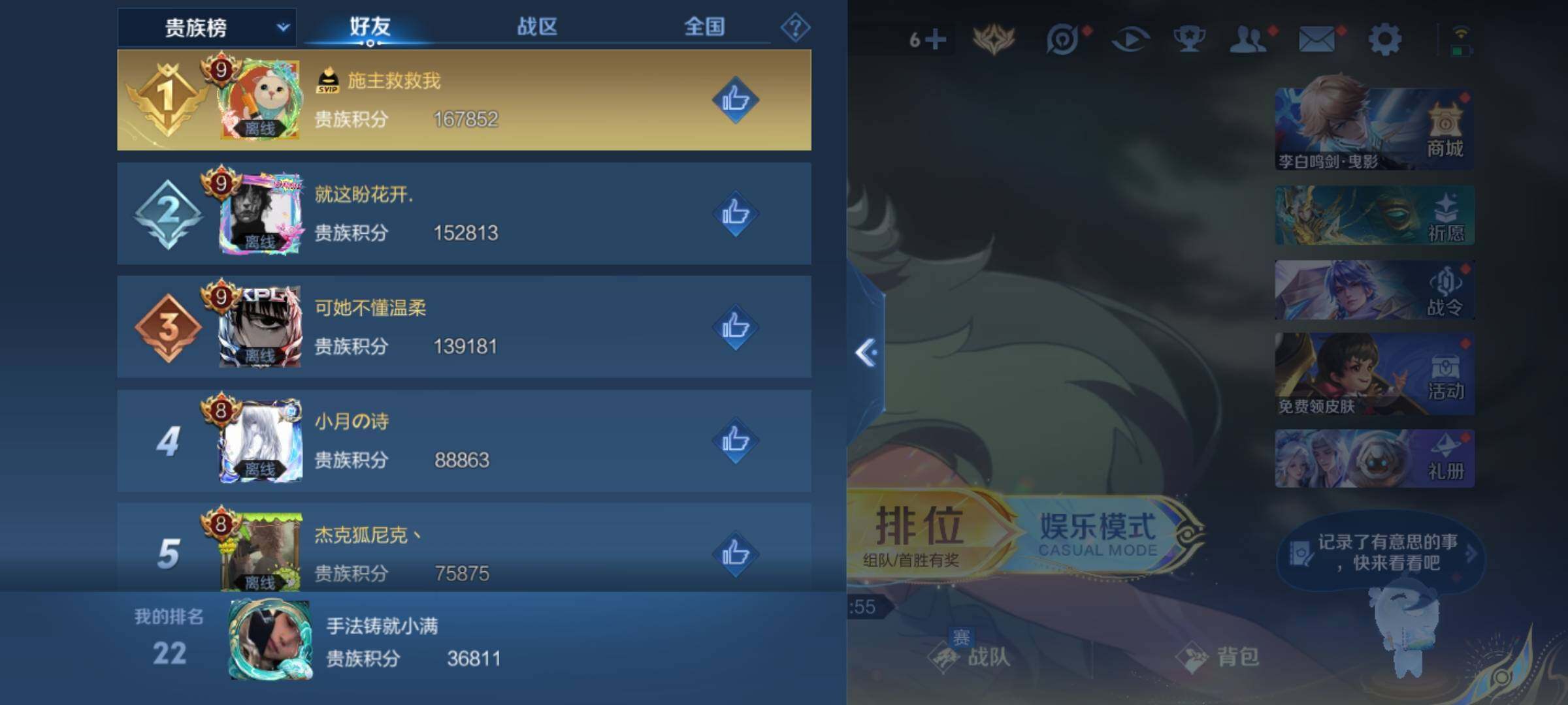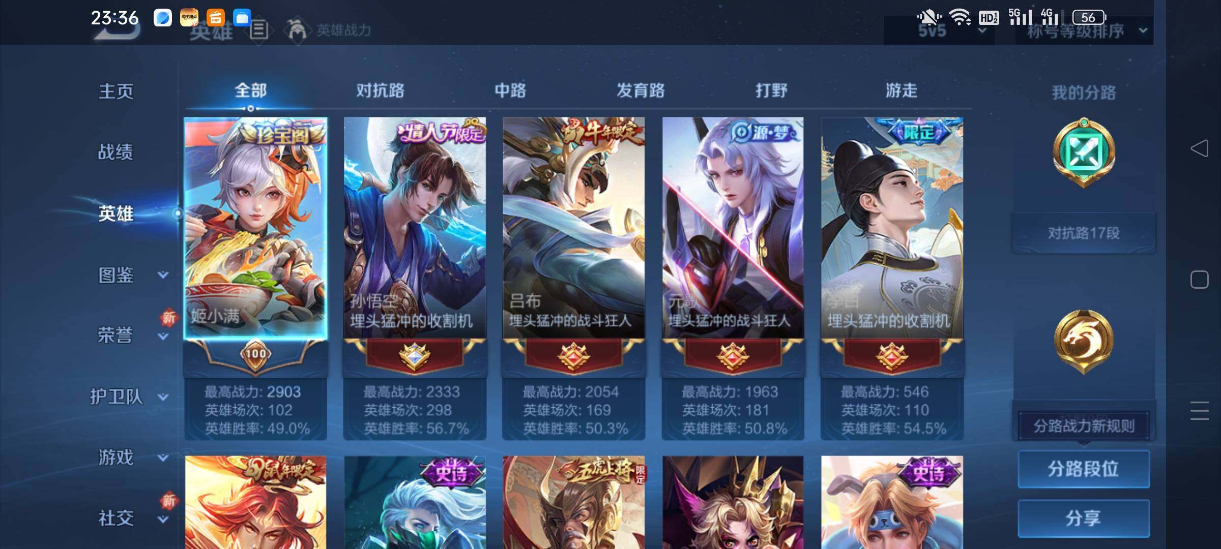 _2295136-q-v7-尊贵铂金i段位-1星元刘备时之恋人-对抗路17段-125英雄-218皮肤7传说-50史诗 【英雄全皮】:刘邦全皮,影全皮 【传说皮肤】:司空震愿照山河定,桑启鸣野蒿,诸葛亮时雨天司,铠绛天战甲,曜云鹰飞将,达摩黄金狮子座,孙悟空地狱火 【限定皮肤】:姜子牙天穹之誓,李白谪仙醉月,狄仁杰阴阳师,赵云皇家上将,嬴政优雅恋人,鲁班七号狮舞东方,庄周高山流水,阿轲迷踪丽影,芈月幻夜卜梦,吕布御风骁将,元歌无心,夏侯惇朔风刀,典韦穷奇,马可波罗暗影游猎,狄仁杰魔术师,狄仁杰万华元夜,达摩沙漠行僧,项羽海滩派对,老夫子醍醐杖,程咬金演武夺筹,刘邦夺宝奇兵,韩信逐梦之影,韩信飞衡,兰陵王金庭之子,孙悟空至尊宝,牛魔御旌,李元芳云中旅人,钟馗神迹守卫,钟馗驱傩正仪,鬼谷子原初探秘者,鬼谷子五谷丰年,诸葛亮时雨天司,黄忠烈魂,黄忠火炮绅士,苏烈千军破阵,弈星混沌棋,沈梦溪大漠名商,明世隐疑决卦,裴擒虎李小龙,裴擒虎擒涛扼浪,米莱狄御霄,云中君纤云弄巧,盾山御銮,猪八戒西部大镖客,上官婉儿梁祝,鲁班大师探海日志,桑启海盐诗旅,鬼谷子天穹祈灯,姬小满妄想食味,沈梦溪龙舞盛年,刘邦剑破天穹,周瑜熔金海岸 【年限皮肤】:吕布御风骁将,诸葛亮时雨天司,韩信飞衡,马超神威,黄忠烈魂 【赛季限定】:夏侯惇朔风刀,典韦穷奇,狄仁杰万华元夜,达摩沙漠行僧,老夫子醍醐杖,程咬金演武夺筹,兰陵王金庭之子,牛魔御旌,李元芳云中旅人,钟馗驱傩正仪,鬼谷子原初探秘者,苏烈千军破阵,弈星混沌棋,沈梦溪大漠名商,明世隐疑决卦,裴擒虎擒涛扼浪,米莱狄御霄,盾山御銮,鲁班大师探海日志,桑启海盐诗旅,鬼谷子天穹祈灯,刘邦剑破天穹,姜子牙天穹之誓 【战令限定】:鲁班七号狮舞东方,阿轲迷踪丽影,芈月幻夜卜梦,马可波罗暗影游猎,刘邦夺宝奇兵,钟馗神迹守卫,黄忠火炮绅士,猪八戒西部大镖客 【史诗皮肤】:赵云皇家上将,貂蝉圣诞恋歌,甄姬冰雪圆舞曲,王昭君偶像歌手,狄仁杰魔术师,宫本武藏鬼剑武藏,孙尚香水果甜心,嬴政优雅恋人,妲己魅力维加斯,妲己女仆咖啡,墨子龙骑士,墨子金属风暴,吕布圣诞狂欢,曹操幽灵船长,李白千年之狐,吕布末日机甲,张飞乱世虎臣,韩信白龙吟,孙悟空至尊宝,花木兰水晶猎龙者,刘邦德古拉伯爵,韩信逐梦之影,夏侯惇乘风破浪,兰陵王暗隐猎兽者,亚瑟心灵战警,百里守约特工魅影,铠曙光守护者,蔡文姬舞动绿
