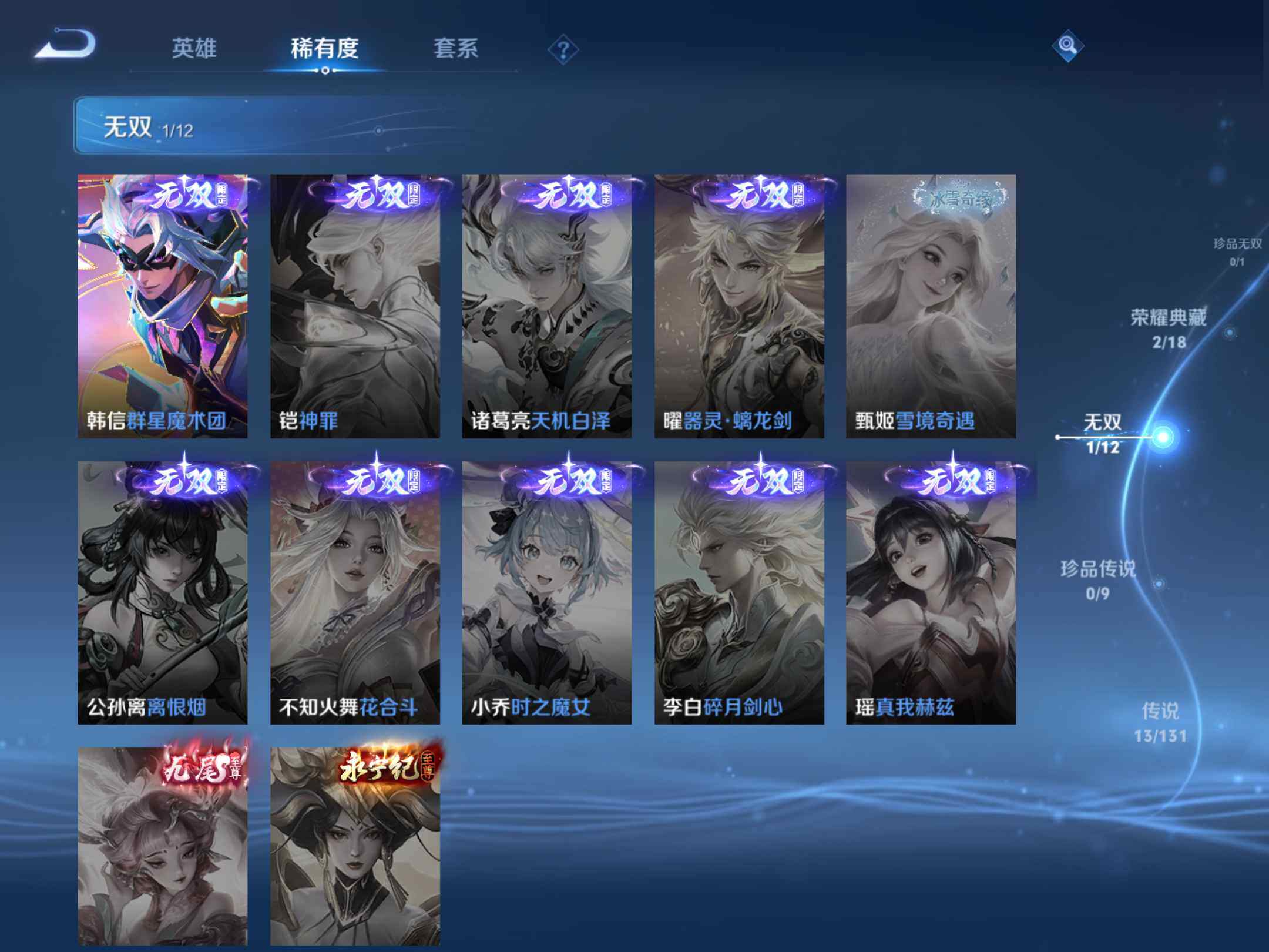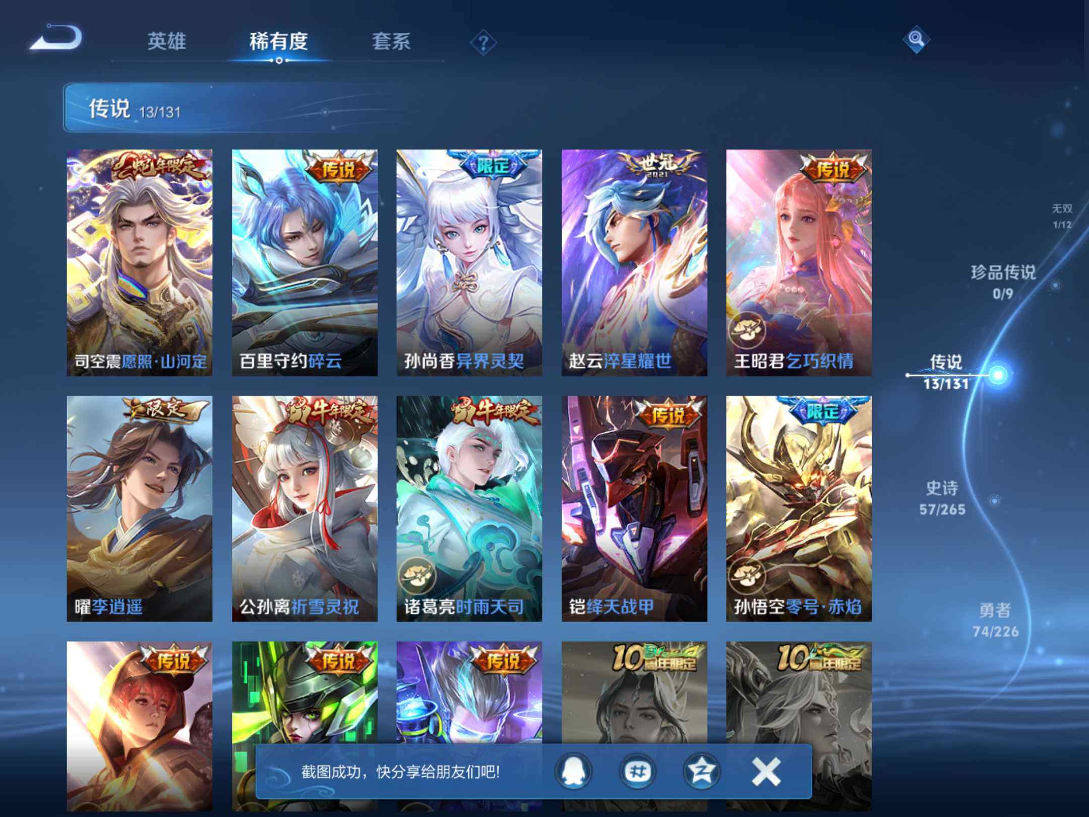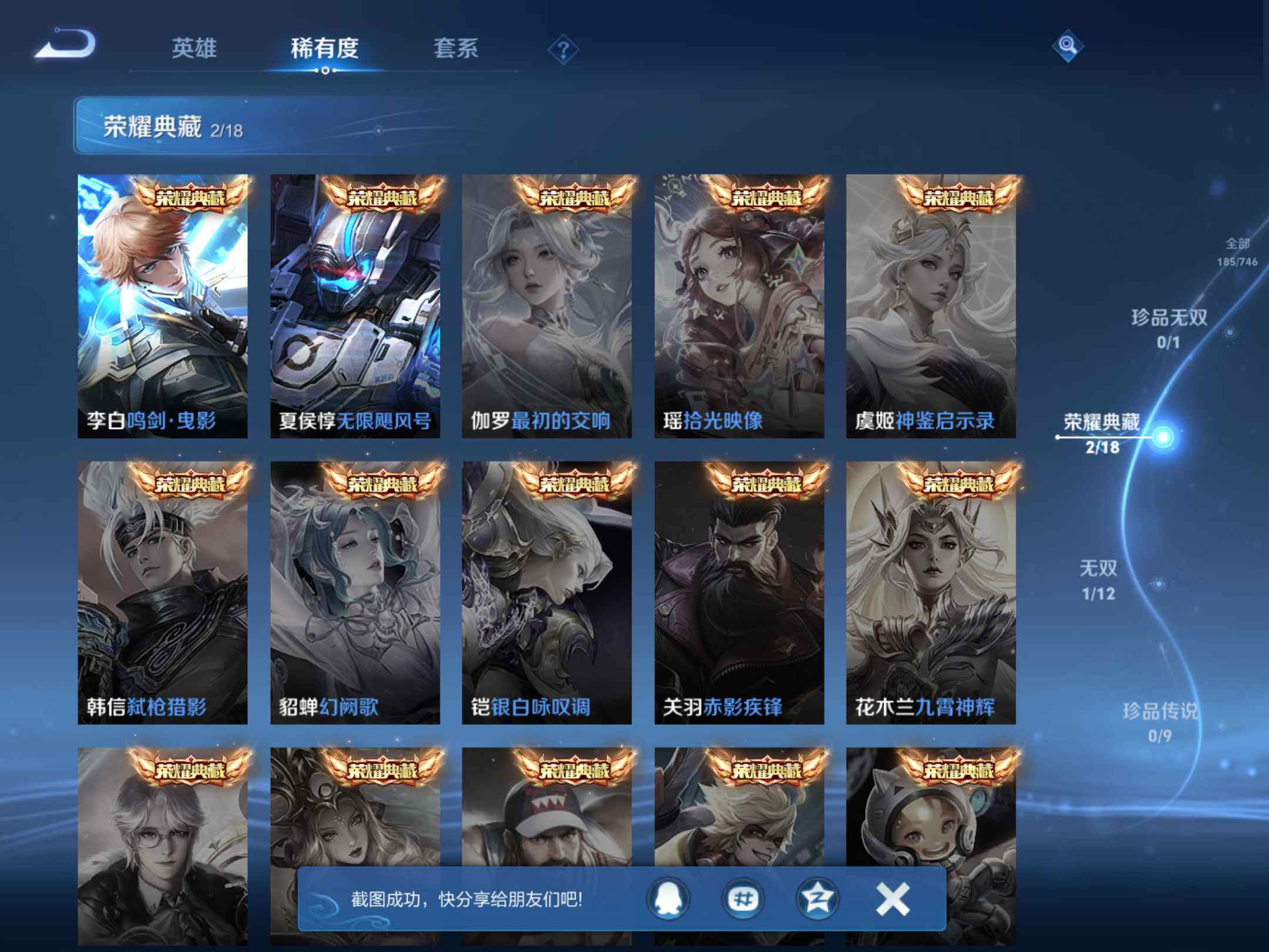 _2295095-q-v7-永恒钻石v段位-124英雄-185皮肤-2典藏-1无双-13传说-57史诗-发育路25段,对抗路20 【荣耀典藏】:夏侯惇无限飓风号,李白鸣剑曳影 【无双皮肤】:韩信群星魔术团 【传说皮肤】:司空震愿照山河定,百里守约碎云,孙尚香异界灵契,赵云淬星耀世,王昭君乞巧织情,曜李,公孙离祈雪灵祝,诸葛亮时雨天司,铠绛天战甲,孙悟空零号赤焰,刘备时之恋人,孙尚香末日机甲,狄仁杰超时空战士 【限定皮肤】:狄仁杰阴阳师,赵云皇家上将,墨子神迹守卫,嬴政优雅恋人,孙尚香异界灵契,鲁班七号乒乒小将,扁鹊奇幻香踪,元歌云间偶戏,元歌无心,甄姬游园惊梦,马可波罗暗影游猎,狄仁杰魔术师,狄仁杰万华元夜,达摩沙漠行僧,项羽海滩派对,老夫子航海奇遇记,程咬金演武夺筹,韩信逐梦之影,韩信傲雪梅呛,王昭君午后时光,花木兰青春决赛季,花木兰默契交锋,亚瑟潮玩骑士王,孙悟空零号赤焰,李元芳云中旅人,钟馗驱傩正仪,杨戬潮玩骑兵,干将莫邪冰霜恋舞曲,雅典娜黎明之约,东皇太一逐梦之光,鬼谷子原初探秘者,鬼谷子五谷丰年,诸葛亮时雨天司,大乔白鹤梁神女,苏烈千军破阵,公孙离蜜橘之夏,公孙离祈雪灵祝,沈梦溪大漠名商,裴擒虎李小龙,裴擒虎擒涛扼浪,狂铁电玩高手,伽罗天狼溯光者,嫦娥拒霜思,嫦娥暖冬兔眠,曜李,鲁班大师探海日志,桑启海盐诗旅,暃星界游侠,艾琳流音漫舞,阿古朵江河有灵,张良古海寻踪,刘邦剑破天穹,程咬金群星魔术团,韩信群星魔术团 【年限皮肤】:公孙离祈雪灵祝,诸葛亮时雨天司,马超神威 【赛季限定】:狄仁杰万华元夜,达摩沙漠行僧,程咬金演武夺筹,张良古海寻踪,李元芳云中旅人,钟馗驱傩正仪,雅典娜黎明之约,鬼谷子原初探秘者,苏烈千军破阵,沈梦溪大漠名商,裴擒虎擒涛扼浪,鲁班大师探海日志,桑启海盐诗旅,刘邦剑破天穹 【战令限定】:墨子神迹守卫,扁鹊奇幻香踪,元歌云间偶戏,马可波罗暗影游猎,老夫子航海奇遇记,王昭君午后时光,艾琳流音漫舞,亚瑟潮玩骑士王,杨戬潮玩骑兵,狂铁电玩高手,嫦娥暖冬兔眠,暃星界游侠 【史诗皮肤】:露娜紫霞仙子,赵云皇家上将,甄姬冰雪圆舞曲,王昭君偶像歌手,狄仁杰魔术师,廉颇地狱岩魂,宫本武藏鬼剑武藏,孙尚香水果甜心,嬴政优雅恋人,妲己魅力维加斯,妲己女仆咖啡,墨子龙骑士,李白千年之狐,张飞乱世虎臣,韩信逐梦之影,小乔缤纷独角兽,兰陵王暗隐猎兽者,甄姬游园惊梦