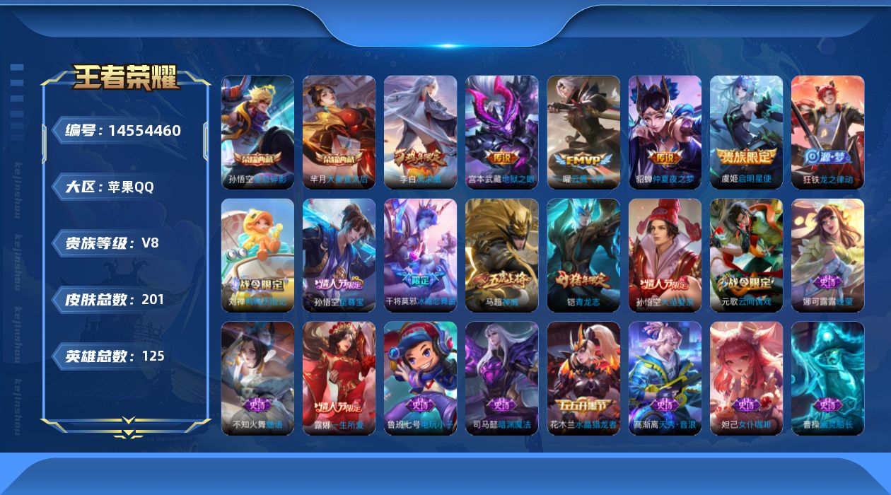 v8 2典藏 5传说 125英雄 201皮肤 可修改实名 【英雄全皮】:影全皮 【稀有英雄】:大司命韩信韩跳跳夏洛特夏师傅艾琳橘右京橘子娜可露露鸟人不知火舞赵云金蝉唐僧戈娅 【荣耀水晶】:全息碎影猴子典藏大秦宣太后 【传说皮】:仲夏夜之梦大飞蛾地狱