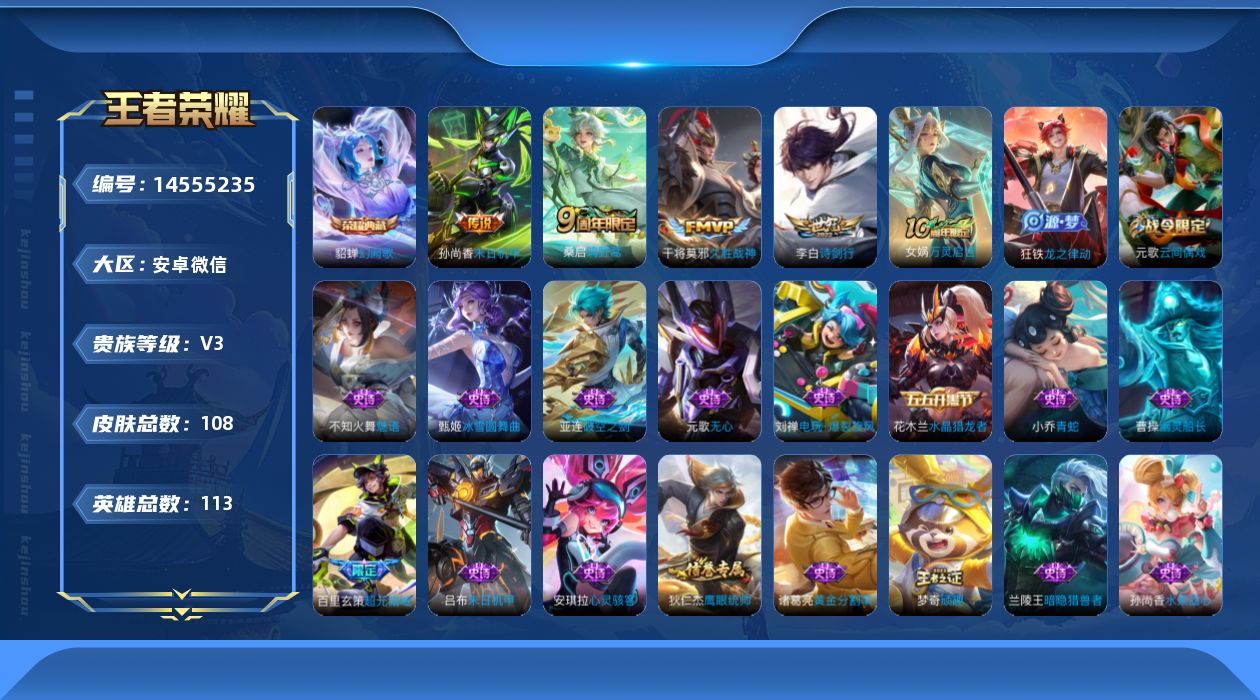 [14555235]v3 1典藏 4传说 113英雄 108皮肤 可修改实名 【稀有英雄】:嬴政始皇帝韩信韩跳跳艾琳娜可露露鸟人不知火舞赵云金蝉唐僧戈娅 【荣耀水晶】:幻阙歌貂蝉典藏 【传说皮】:末日机甲-孙尚香绿蚂蚱久胜战神 【珍宝阁皮】:优雅恋人 【赛季/战令皮】:噬灭天穹s37海盐诗旅s30擒涛扼浪s31探海日志s32顽趣-梦奇剑破天穹s35天穹祈灯s34天穹之誓s36原初探秘者s21万华元夜s22演武夺筹s23驱傩正仪s24千军破阵s25潮玩骑士王云间偶戏火炮绅士沙漠行僧s26幻夜卜梦金庭之子s27大漠名商s28云中旅人s29 【史诗皮】:龙之律动超元猎域星界战将破空之剑万灵启世黄金分割率青蛇偶像歌手魅语电玩·爆裂旋风末日机甲-吕布水果甜心心灵骇客暗隐猎兽者幽灵船长鬼剑武藏地狱岩魂水晶猎龙者箭羽风息金属风暴圣诞恋歌鹰眼统帅黎明之约无心 【限定皮】:鸣野蒿诗剑行 【普通皮】:谧流熔炉雾都夜雨劲辣红锅暗都幽影程咬金群星魔术团经纬探寻者街头霸王鹤鸣心笺荣光之誓虚灵犬护布丁狗之约威尼斯狂欢尼罗河女神鬼谷子天穹祈灯s34时空谍影万事如意龙腾万里归虚梦演-鲁班大师归虚梦演-曜沉稳之力掌控之力坚韧之力炽热元素使缤纷绘卷万象初新黄金武士次元突破西部大镖客牛魔教廷特使阴阳师汉昭烈帝忍·炎影丁香结奇妙博物学爱心护理救世之瞳冰雪圆舞曲玩偶对对碰孤猎修竹墨客灼热之刃幸存者第七人偶圣殿之光战争女神激情绿茵赤焰之缨启蛰魇语军师午夜歌剧院命运角斗场霓裳曲范海辛西部大镖客-孙悟空海军大将火炮千金碧珀绯影