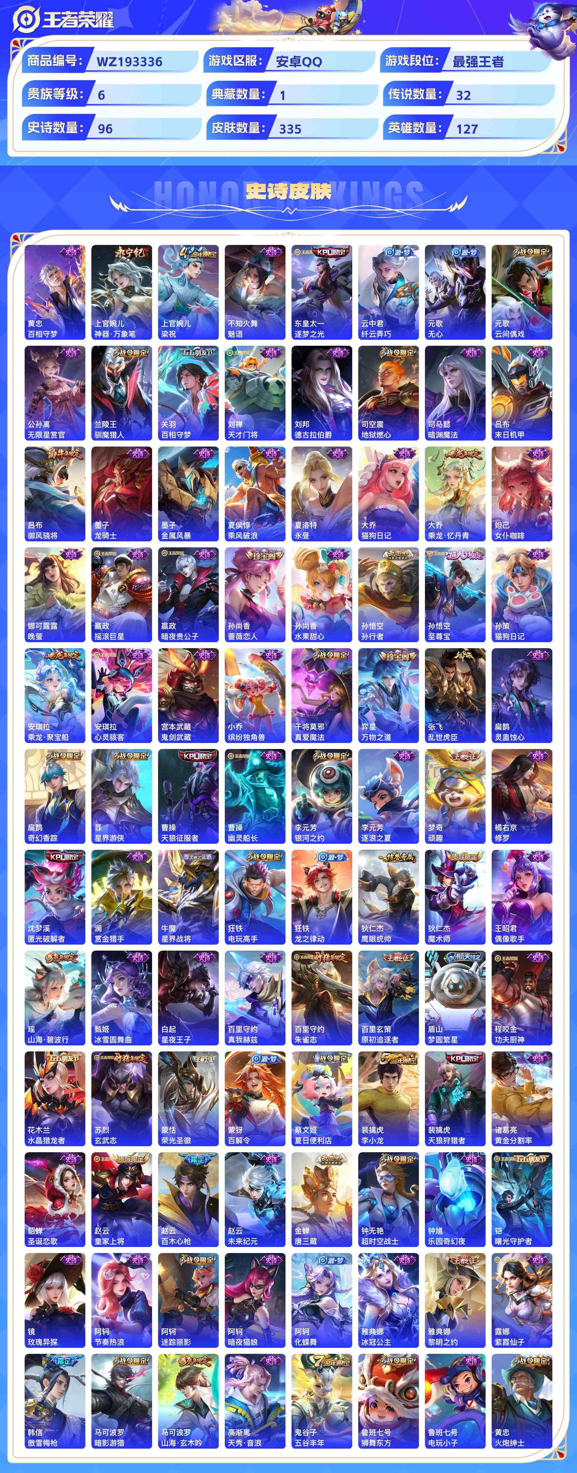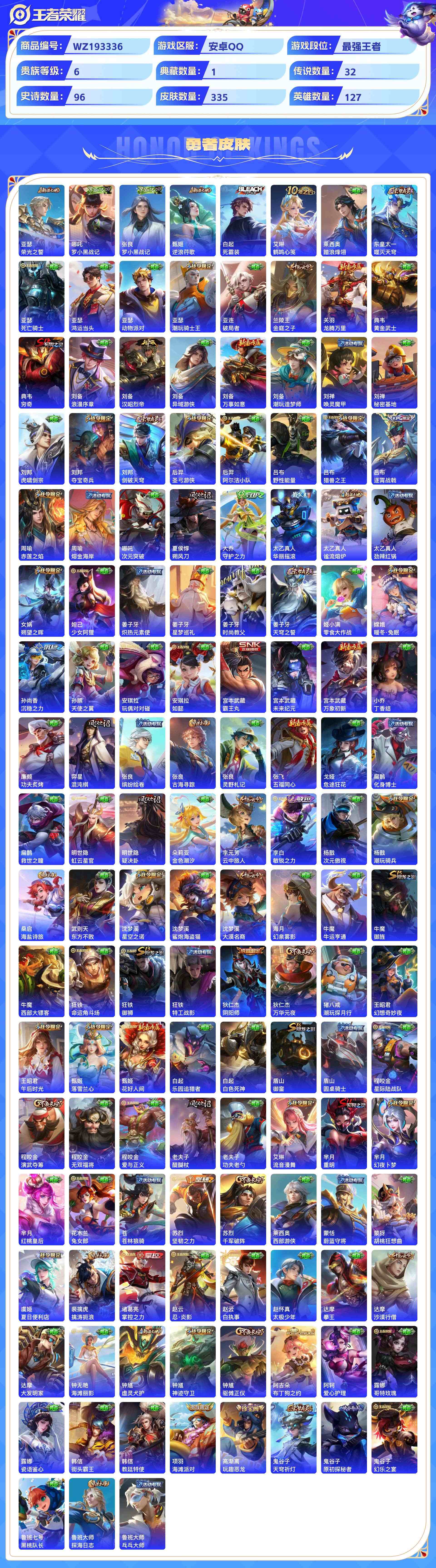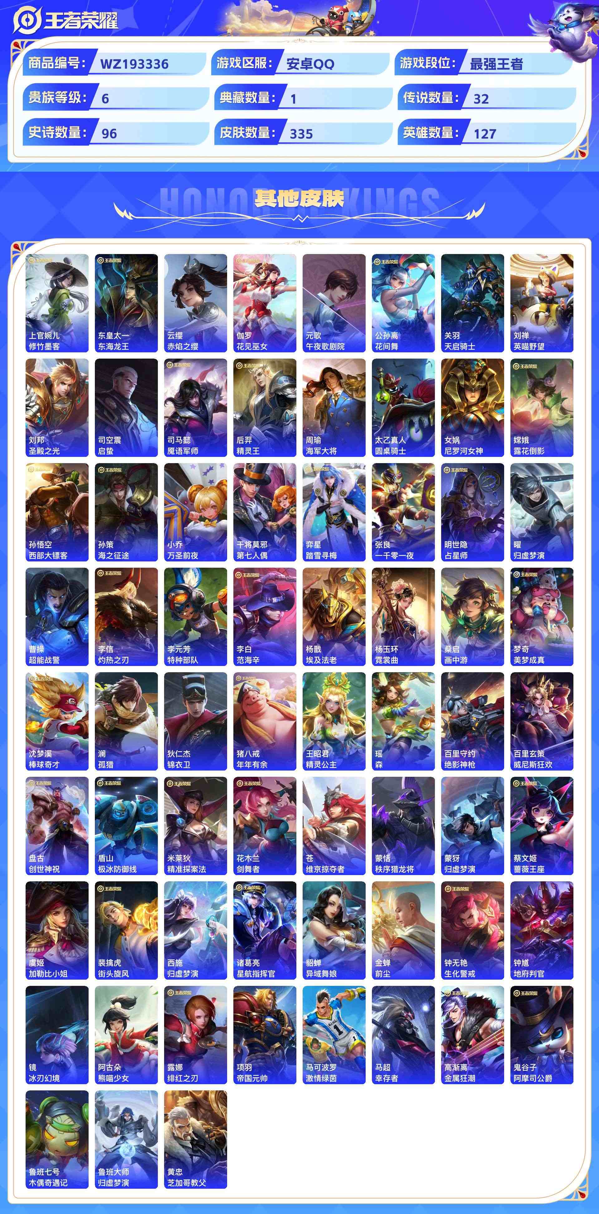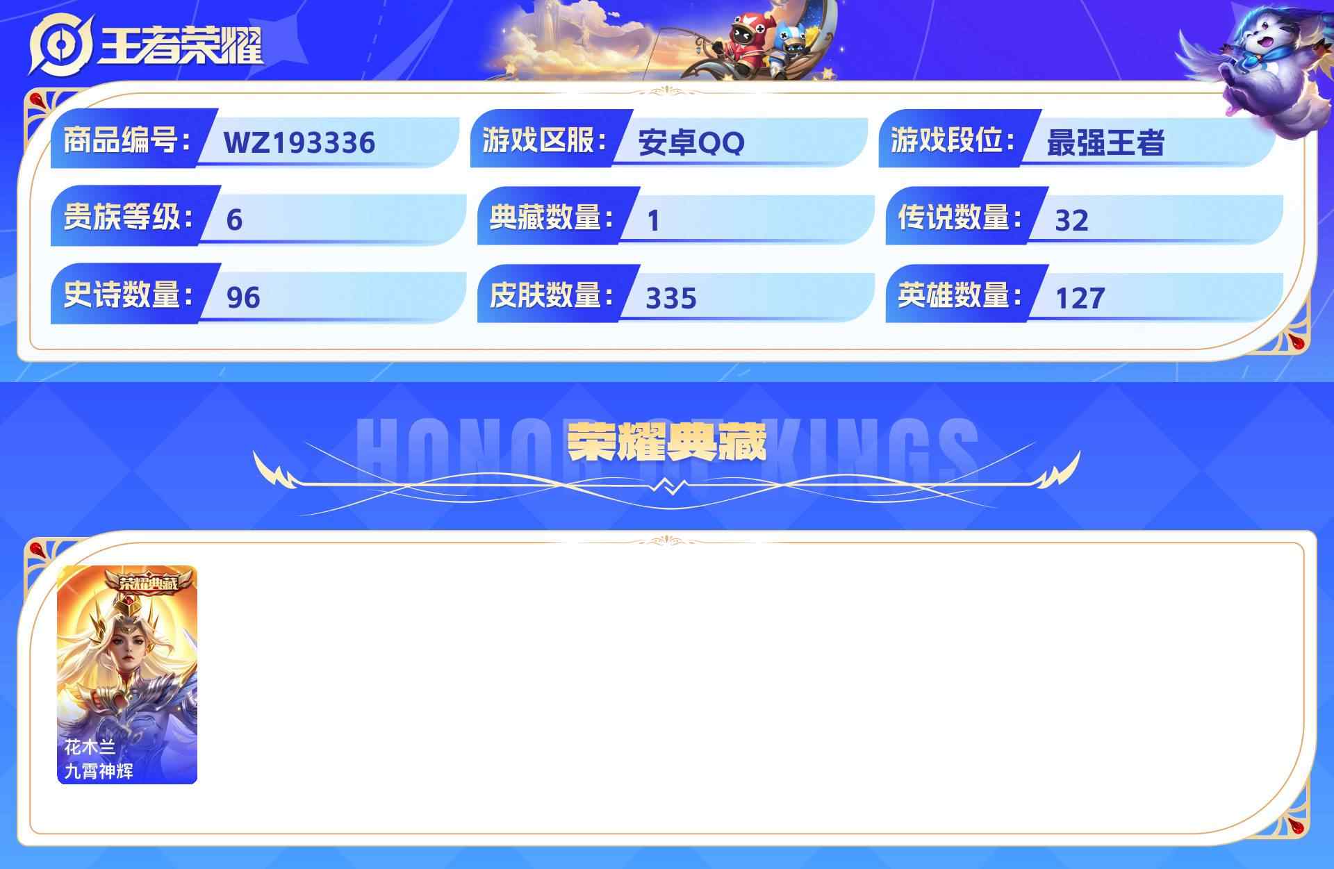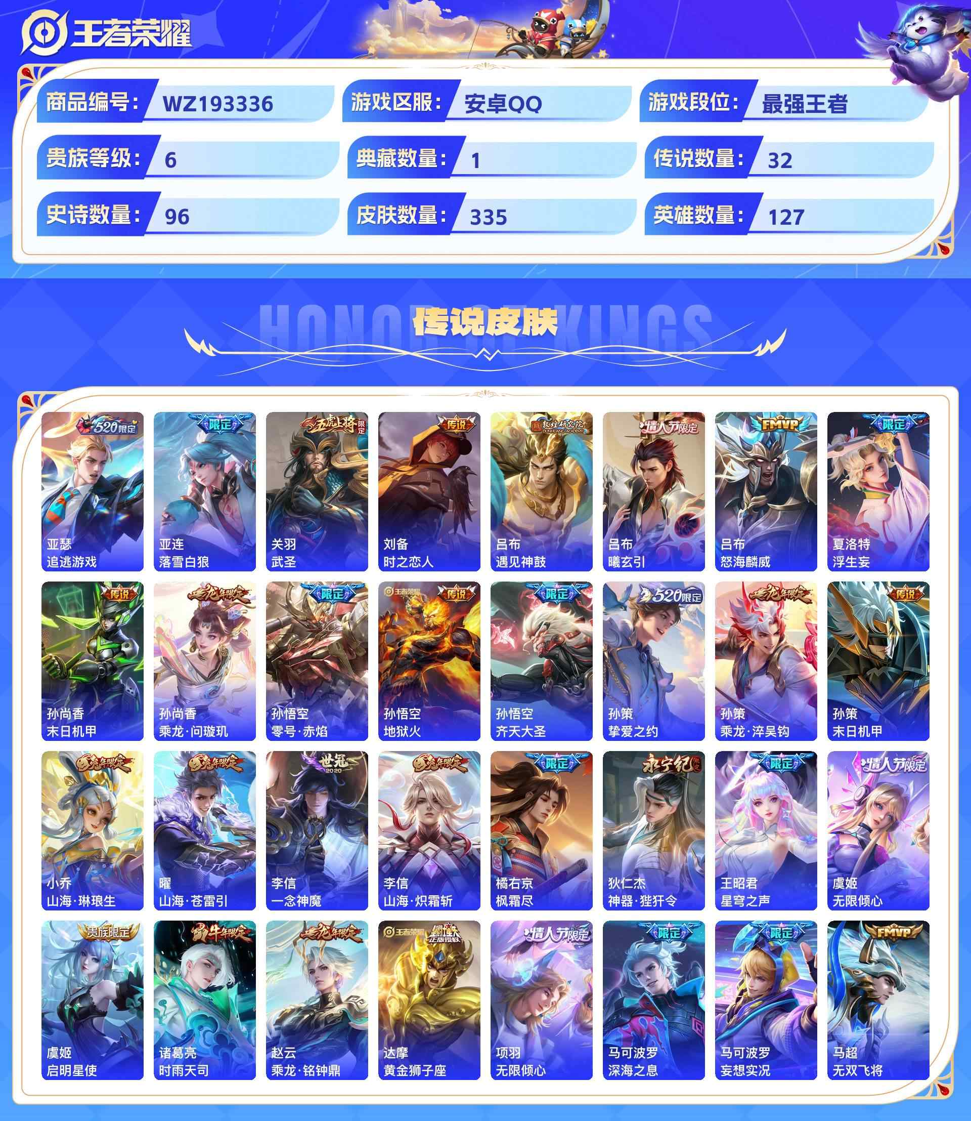 wz193336|精品号安卓qq贵族9级 335皮 1典藏 (九霄神辉)32传说(追逃游戏落雪白狼武圣) 96史诗(百相守梦神器·万象笔)3星传说(时之思念 幽冥火 未来机甲)36个性按键1天幕