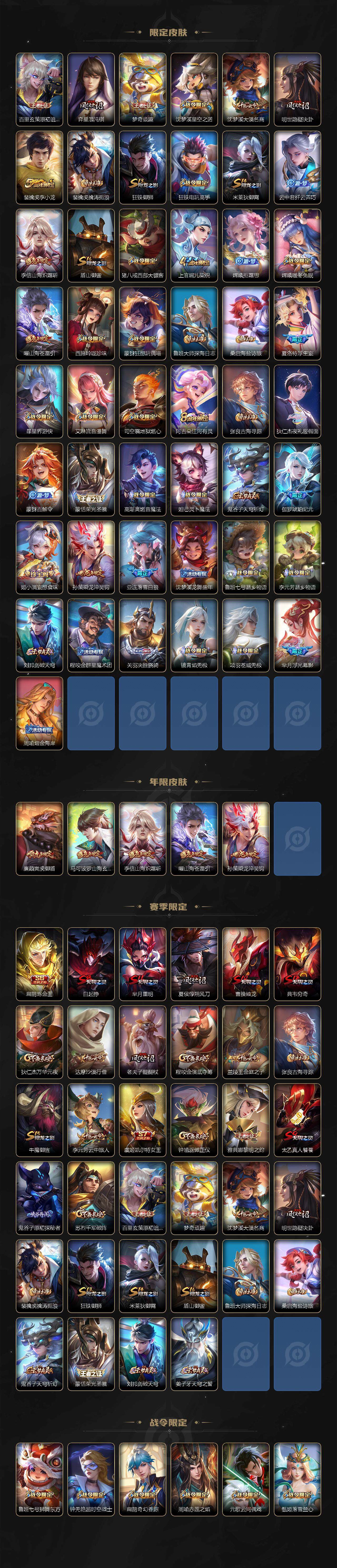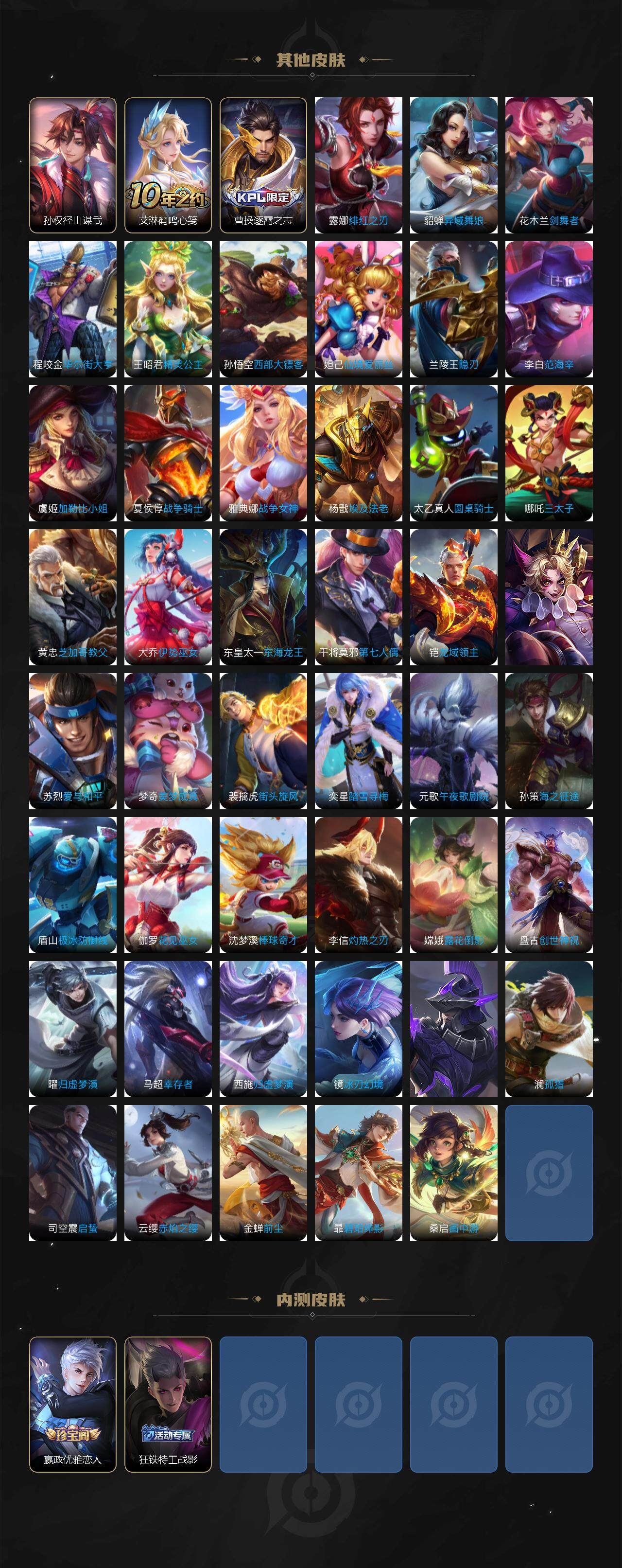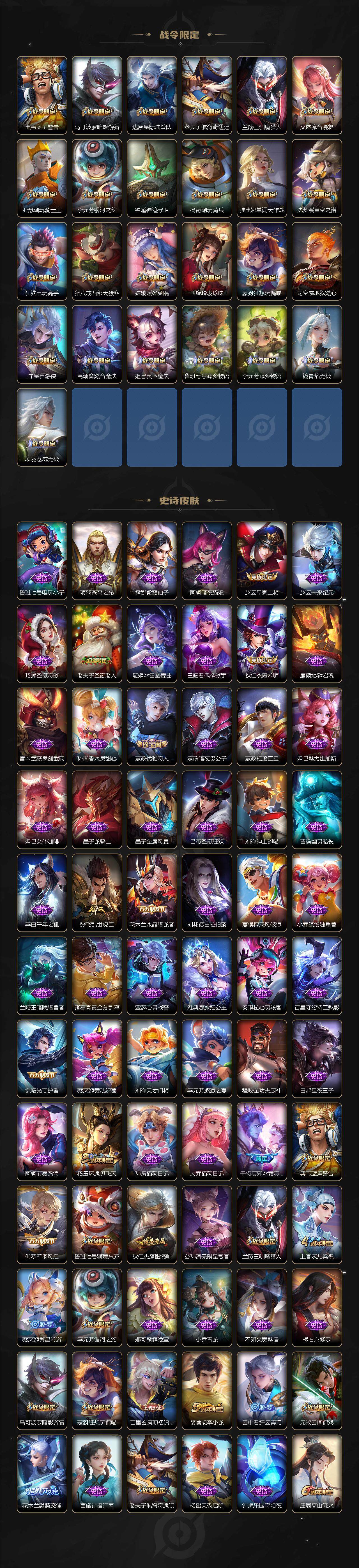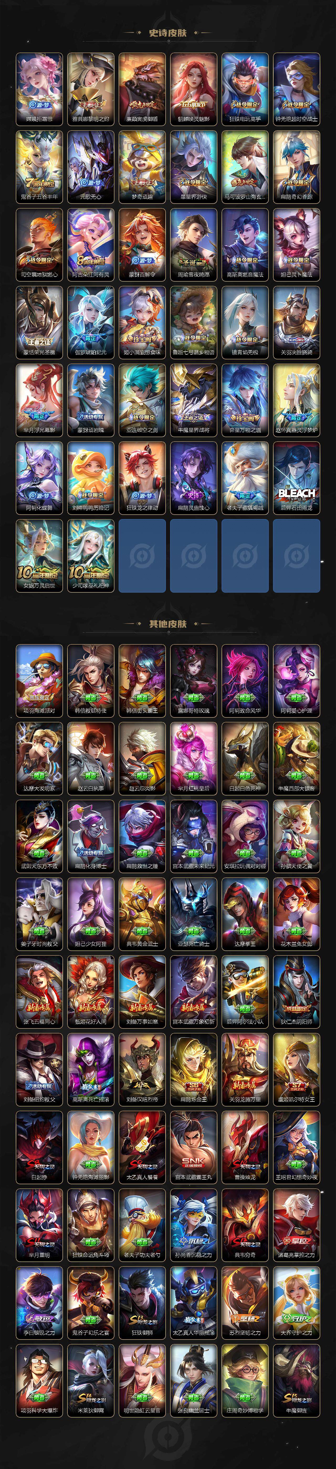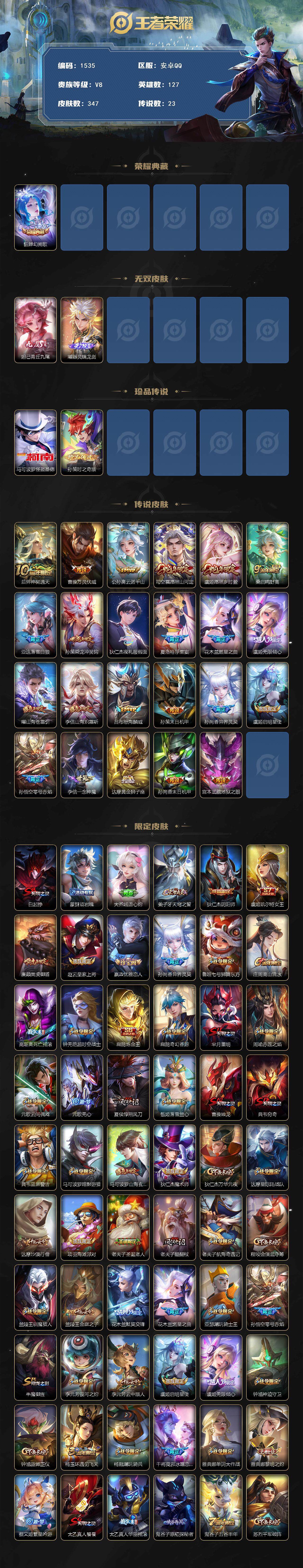 127英雄-347皮肤-贵族8/皮肤347/典藏1/传说23/史诗109/英雄127/达摩全皮/孙权全皮/太乙真人全皮/狂铁全皮/李信全皮/蒙恬全皮/司空震全皮/幻阙歌 貂蝉/青丘·九尾 妲己/器灵·螭龙剑 曜/怪盗基德 马可波罗/时之奇旅 孙策/神树通天 后羿/万灵伏威 曹操/云诺千山 公孙离/愿照·山河定 司空震/愿照·岁时盈 虞姬/鸣野蒿 桑启/落雪白狼 亚连/乘龙·淬吴钩 孙策/夜礼服假面 狄仁杰/浮生妄 夏