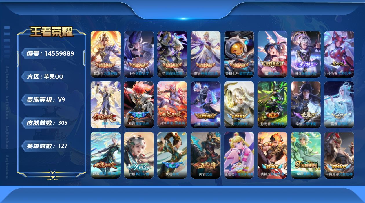 [14559889]苹果q-v9-最强王者段位-127英雄-305皮肤-5典藏皮肤-2无双-29传说-88史诗 【英雄全皮】:蒙恬全皮,影全皮 【荣耀典藏】:小乔天鹅之梦,鲁班七号星空梦想,花木兰九霄神辉,铠银白咏叹调,虞姬神鉴启示录 【无双皮肤】:瑶真我赫兹,韩信群星魔术团 【传说皮肤】:后羿神树通天,司空震愿照山河定,裴擒虎祥瑞亨通,桑启鸣野蒿,庄周牧神诗旅,孙策乘龙淬吴钩,赵云乘龙铭钟鼎,马超琥珀纪元,澜逐花归海,艾琳觅芳踪,露娜霜月吟,王昭君永恒水手月亮,甄姬至美化雀舞,云缨鹤归松栖,马可波罗妄想实况,亚瑟追逃游戏,王昭君星穹之声,女娲补天,鲁班七号寅虎瑞焰,王昭君乞巧织情,镜炽阳神光,虞姬启明星使,孙悟空零号赤焰,关羽武圣,李信一念神魔,干将莫邪久胜战神,后羿黄金射手座,孙尚香末日机甲,孙悟空地狱火 【限定皮肤】:蔡文姬夏日便利店,虞姬夏日便利店,姜子牙天穹之誓,杨戬破阵退雄兵,李白谪仙醉月,狄仁杰阴阳师,赵云皇家上将,鲁班七号寅虎瑞焰,芈月幻夜卜梦,元歌云间偶戏,夏侯惇朔风刀,甄姬女儿国国王,甄姬至美化雀舞,马可波罗暗影游猎,马可波罗妄想实况,狄仁杰魔术师,狄仁杰万华元夜,达摩星际陆战队,达摩沙漠行僧,项羽海滩派对,老夫子醍醐杖,老夫子航海奇遇记,关羽武圣,程咬金演武夺筹,王昭君午后时光,王昭君星穹之声,兰陵王金庭之子,亚瑟潮玩骑士王,亚瑟追逃游戏,孙悟空零号赤焰,后羿圣弓游侠,李元芳云中旅人,虞姬启明星使,钟馗驱傩正仪,杨玉环遇见飞天,女娲补天,干将莫邪真爱魔法,雅典娜单词大作战,雅典娜黎明之约,鬼谷子原初探秘者,黄忠火炮绅士,苏烈千军破阵,百里玄策原初追逐者,弈星混沌棋,公孙离玉兔公主,沈梦溪大漠名商,明世隐疑决卦,裴擒虎李小龙,裴擒虎擒涛扼浪,狂铁电玩高手,米莱狄胡桃异想国,云中君纤云弄巧,猪八戒西部大镖客,西施玲珑珍味,蒙犽狂想玩偶喵,鲁班大师探海日志,镜匿光追影者,桑启海盐诗旅,戈娅驭风魔法,云缨鹤归松栖,张良古海寻踪,王昭君永恒水手月亮,艾琳觅芳踪,蒙恬荣光圣徽,高渐离燃音魔法,妲己灵卜魔法,鬼谷子天穹祈灯,马超琥珀纪元,姬小满妄想食味,大乔乘龙忆丹青,安琪拉乘龙聚宝船,孙策乘龙淬吴钩,赵云乘龙铭钟鼎,沈梦溪龙舞盛年,刘邦剑破天穹,上官婉儿群星魔术团,韩信群星魔术团,周瑜熔金海岸 【年限皮肤】:鲁班七号寅虎瑞焰,关羽武圣,大乔乘龙忆丹青,安琪拉乘龙聚宝船,孙策