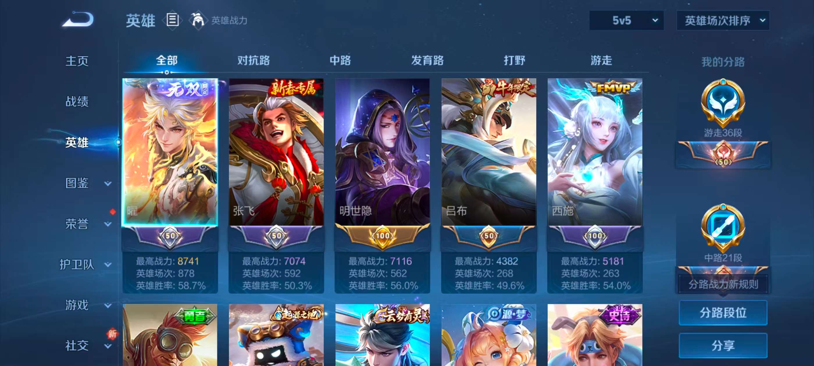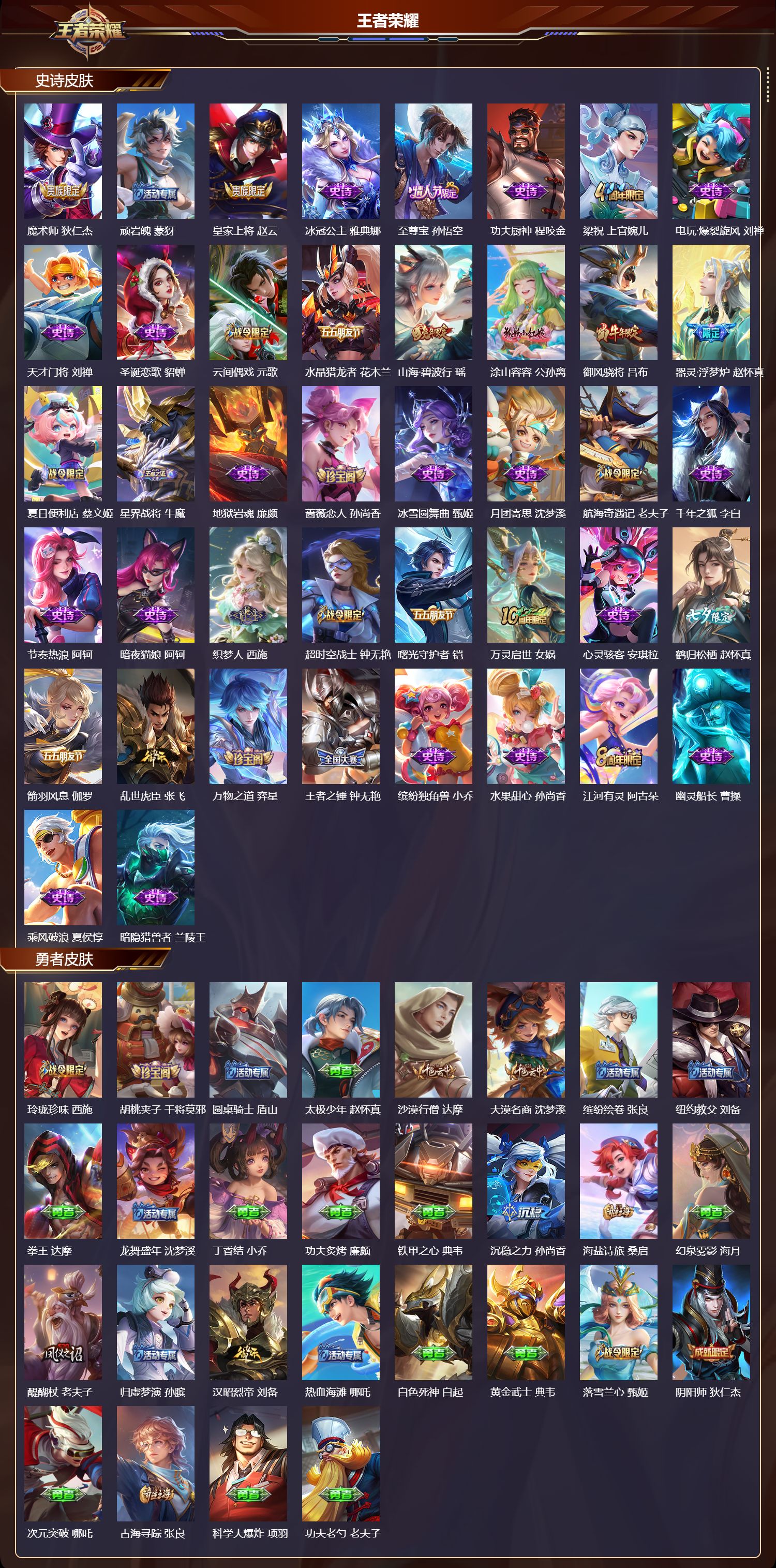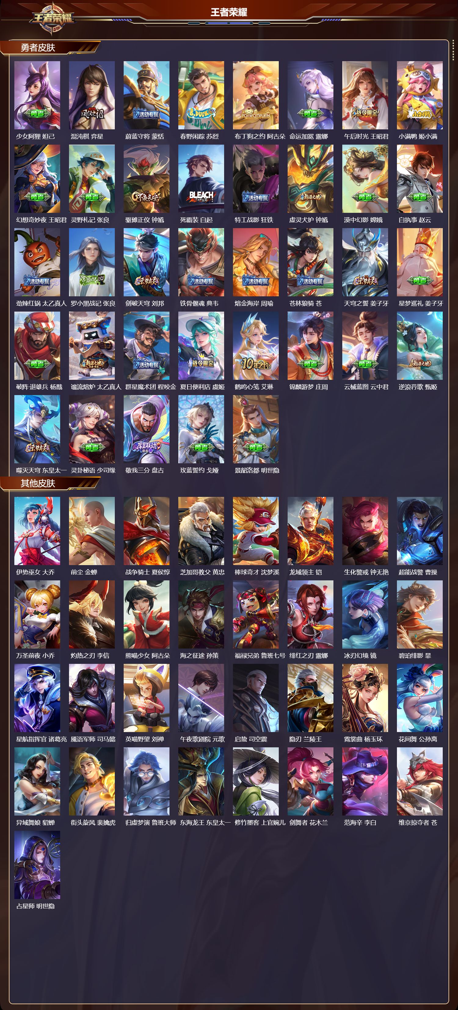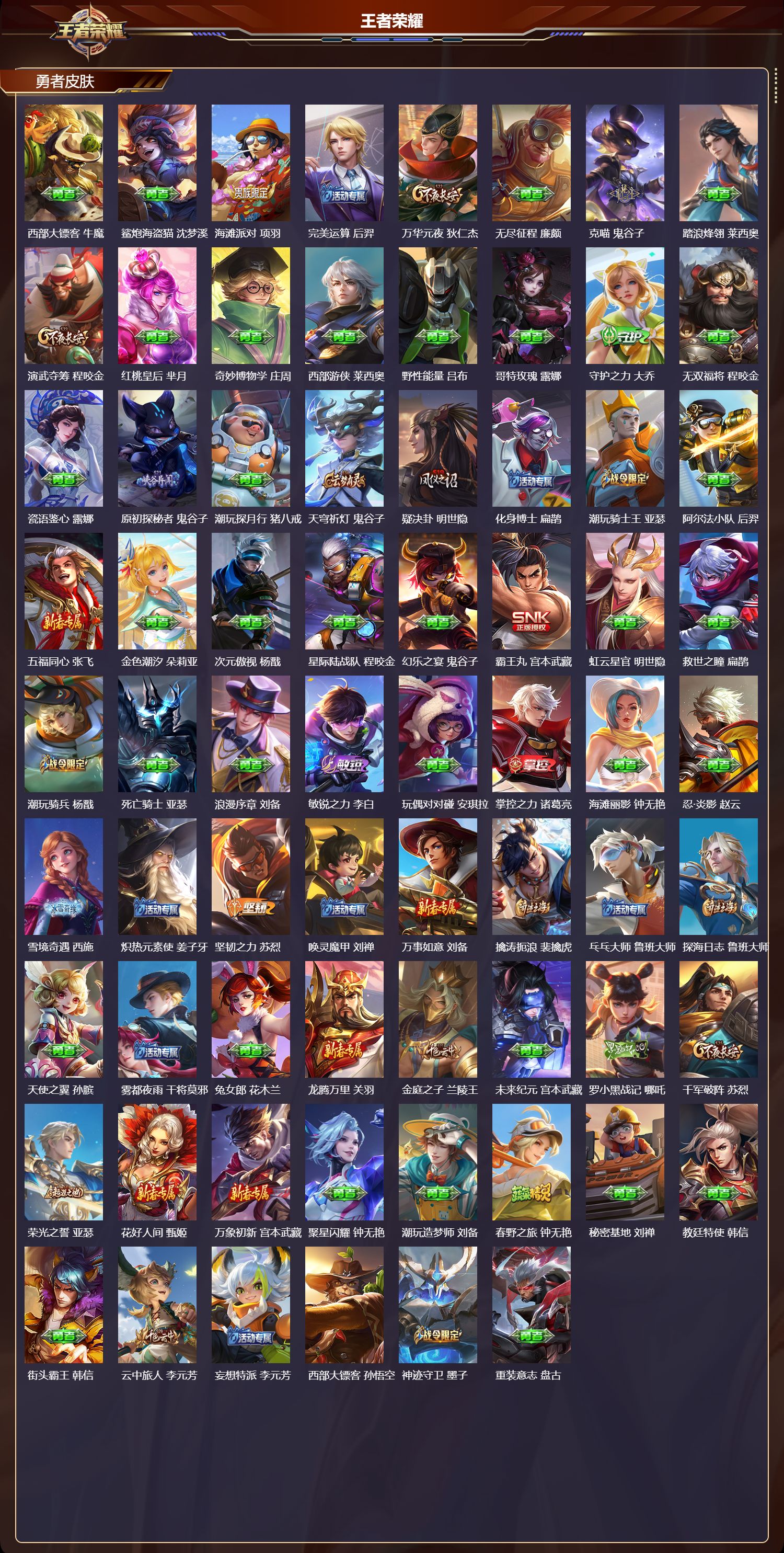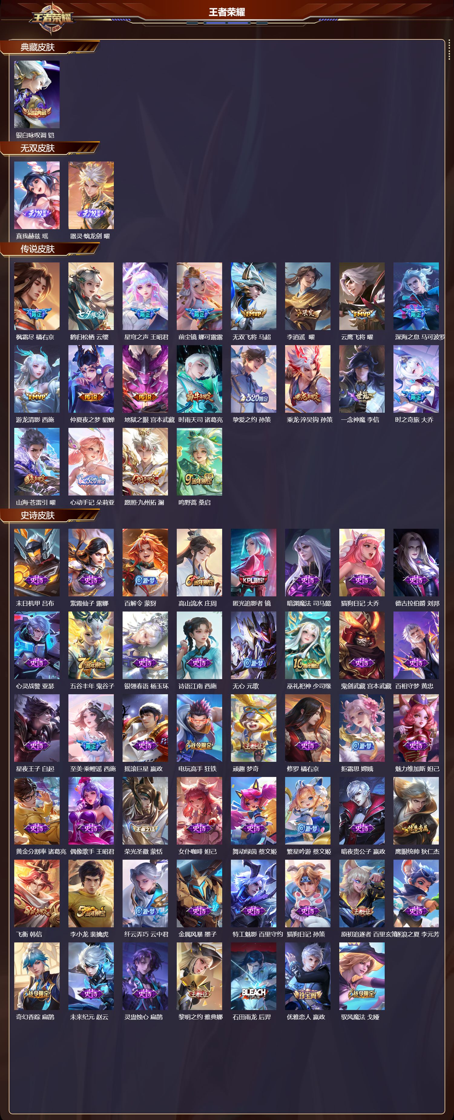 安卓微信/最强王者/301皮肤/127英雄/1典藏/0珍品无双/2无双/0珍品传说/20传说/89史诗/9稀有英雄【1 典藏皮肤】银白咏叹调 铠【2 无双皮肤】真我赫兹 瑶器灵·螭龙剑 曜【20 传说皮肤】枫霜尽 橘右京鹤归松栖 云缨星穹之声 王昭君前尘镜 娜可露露无双飞将 马超李 曜云鹰飞将 曜深海之息 马可波罗游龙清影 西施仲夏夜之梦 貂蝉地