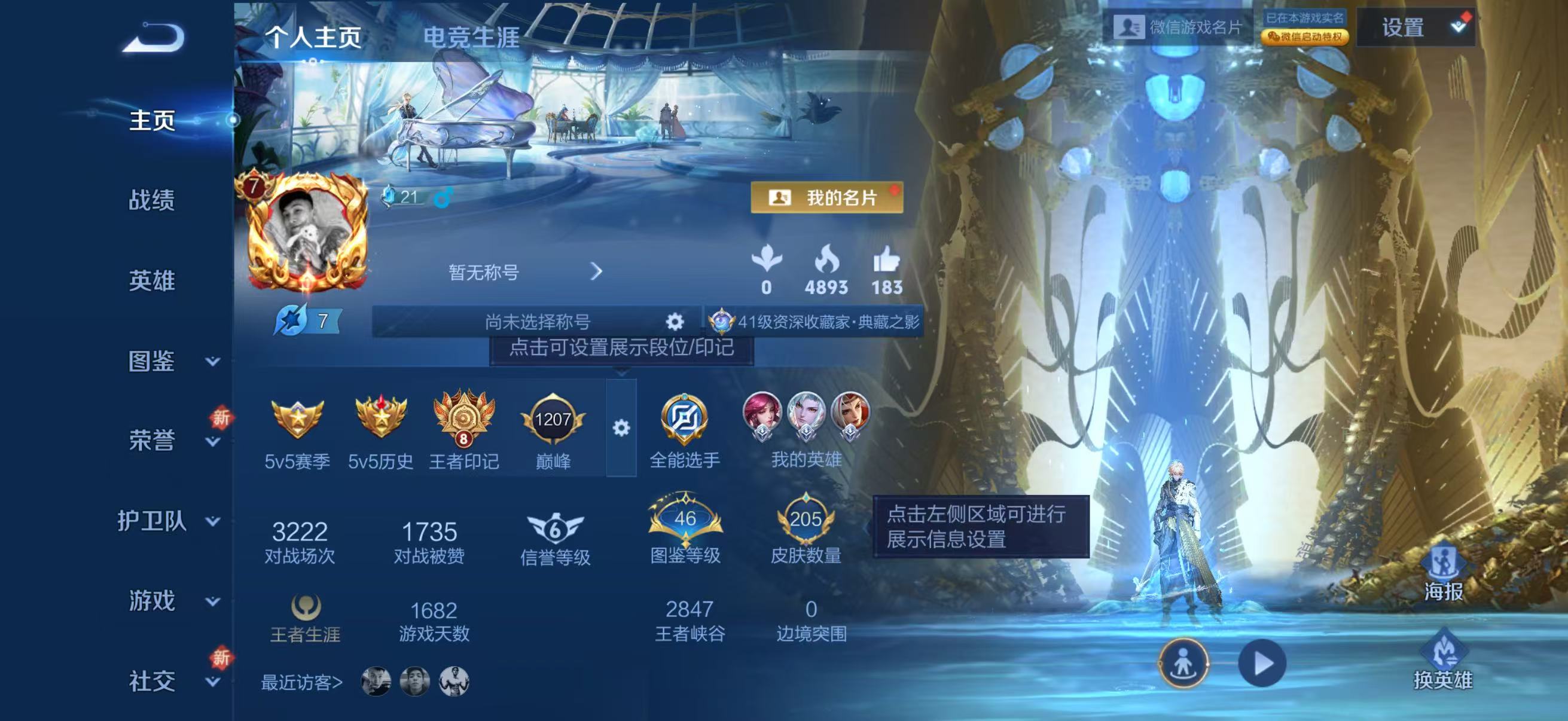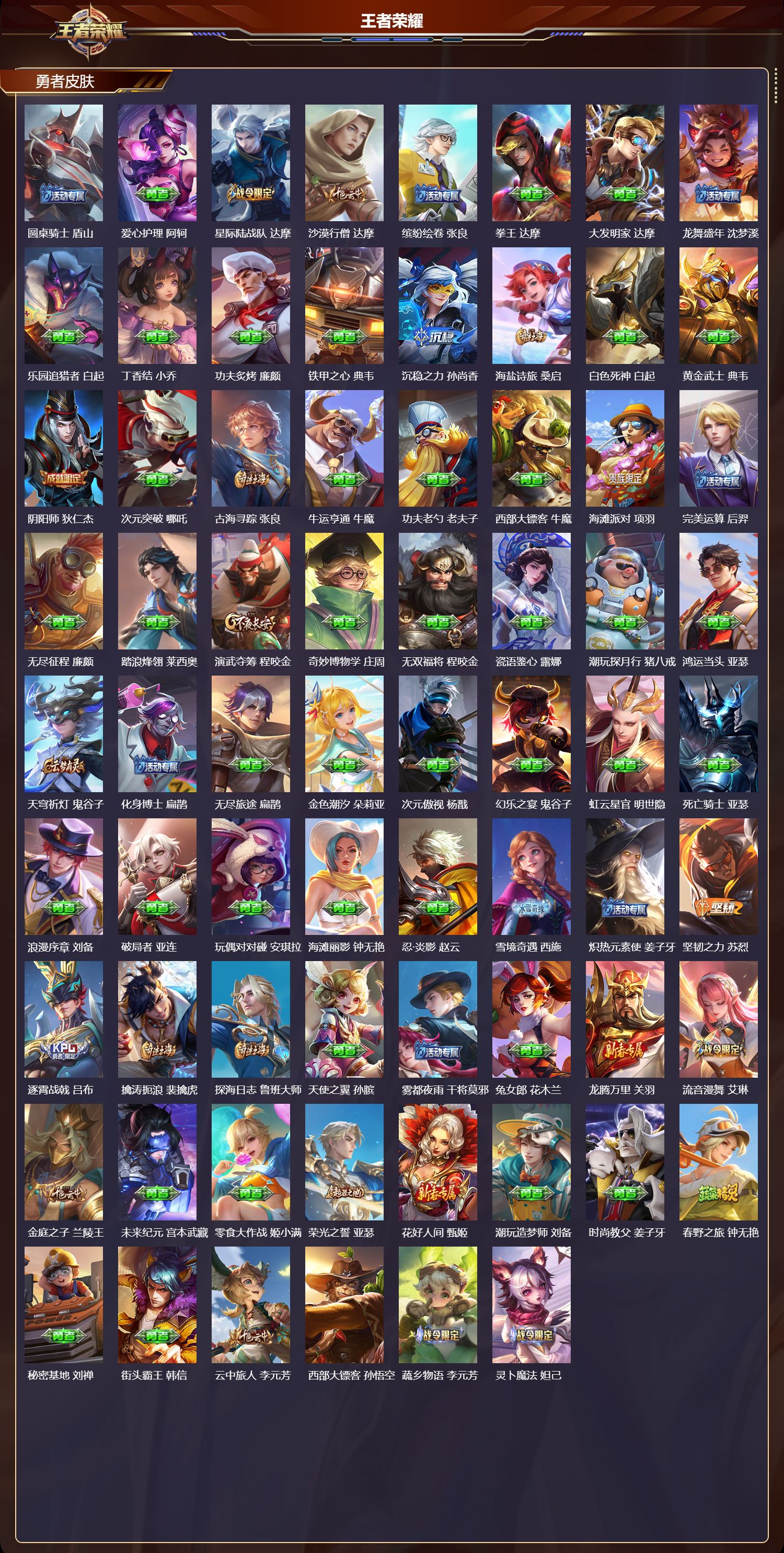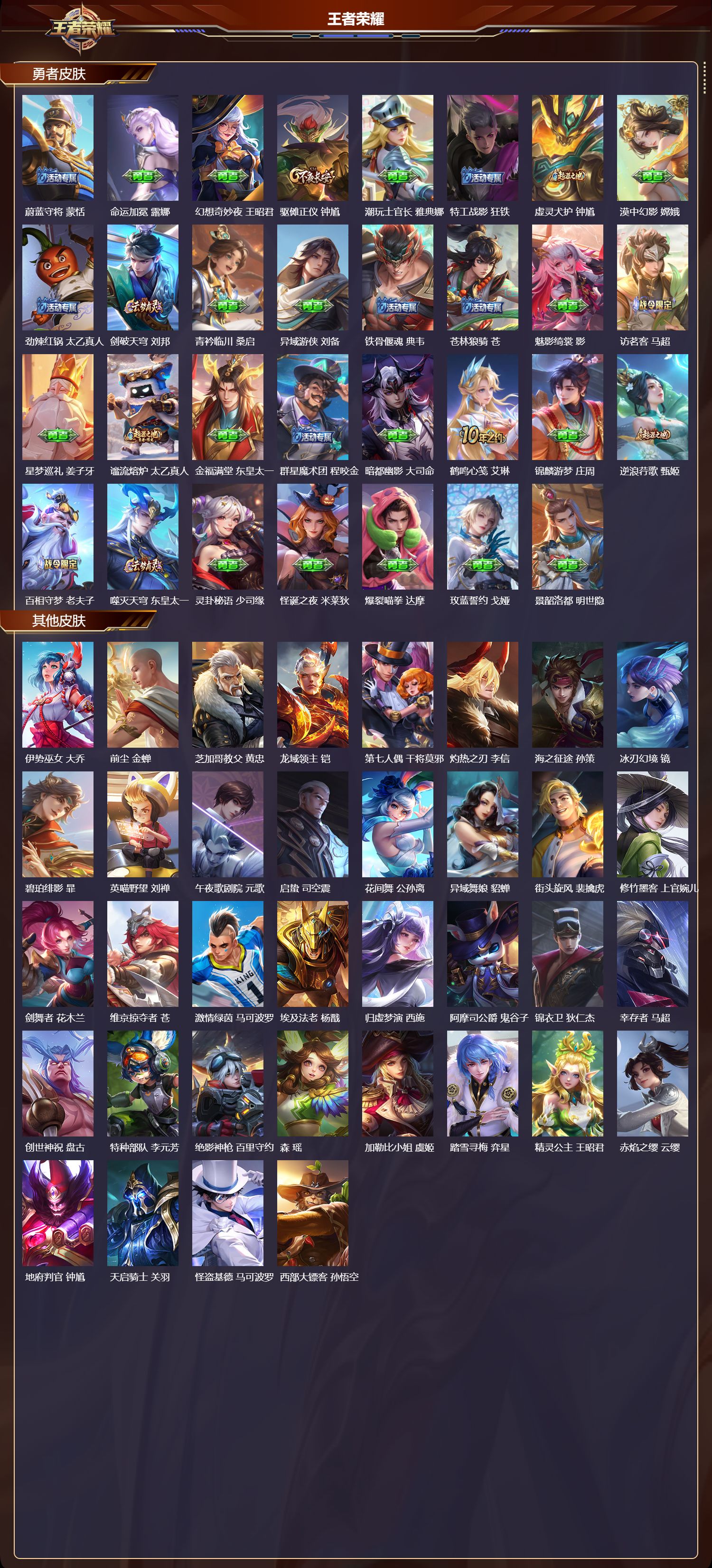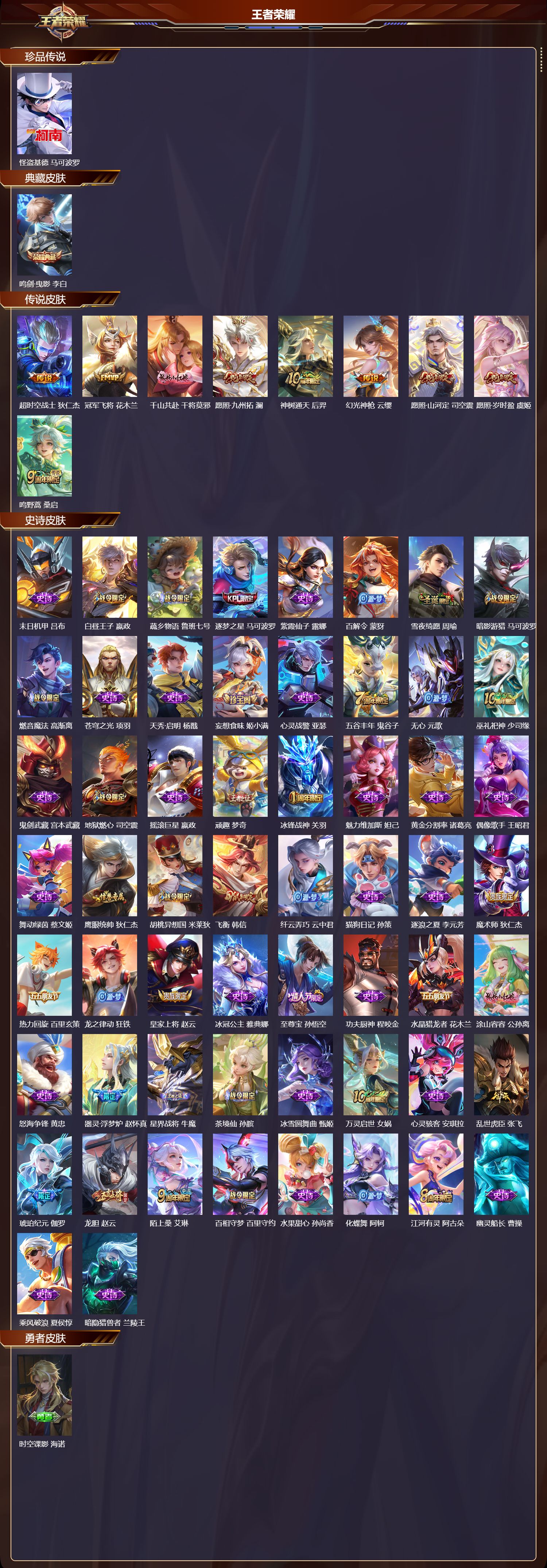 苹果微信/最强王者/205皮肤/127英雄/1典藏/0珍品无双/0无双/1珍品传说/9传说/58史诗/9稀有英雄【1 珍品传说】怪盗基德 马可波罗【1 典藏皮肤】鸣剑·曳影 李白【9 传说皮肤】超时空战士 狄仁杰冠军飞将 花木兰千山共赴 干将莫邪愿照·九州拓 澜神树通天 后羿幻光神呛 云缨愿照·山河定 司空震愿照·岁时盈 虞姬鸣野蒿 桑启【58 史诗皮肤】末日机甲 吕布白昼