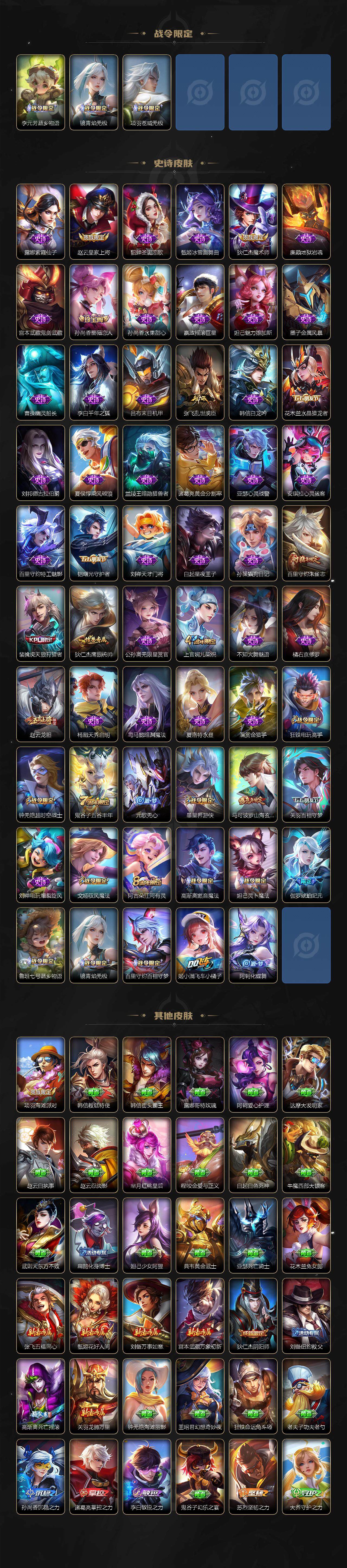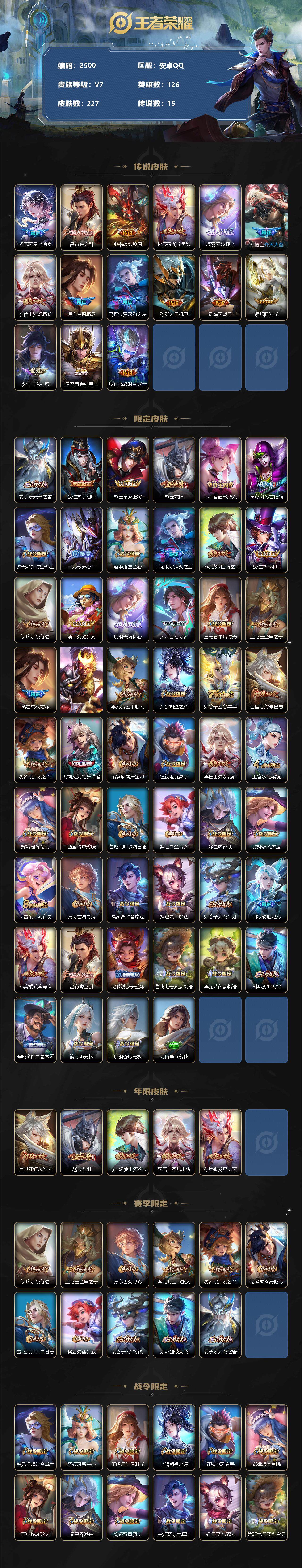 [14566796]安卓q-v1-最强王者段位-126英雄-227皮肤-0典藏-0珍品无双-0无双-0珍品传说-15传说-58史诗 【英雄全皮】:橘右京全皮,李信全皮 【传说皮肤】:杨玉环星之鸣奏,吕布曦玄引,典韦战鼓燎原,孙策乘龙淬吴钩,项羽无限倾心,孙悟空齐天大圣,李信山海炽霜斩,橘右京枫霜尽,马可波罗深海之息,孙策末日机甲,铠绛天战甲,镜炽阳神光,李信一念神魔,后羿黄金射手座,狄仁杰超时空战士 【限定皮肤】:姜子牙天穹之誓,狄仁杰阴阳师,赵云皇家上将,赵云龙胆,孙尚香蔷薇恋人,高渐离死亡摇滚,钟无艳超时空战士,元歌无心,甄姬落雪兰心,马可波罗深海之息,马可波罗山海玄木吟,狄仁杰魔术师,达摩沙漠行僧,项羽海滩派对,项羽无限倾心,关羽百相守梦,王昭君午后时光,兰陵王金庭之子,橘右京枫霜尽,孙悟空齐天大圣,李元芳云中旅人,女娲朔望之晖,鬼谷子五谷丰年,百里守约朱雀志,沈梦溪大漠名商,裴擒虎天狼狩猎者,裴擒虎擒涛扼浪,狂铁电玩高手,李信山海炽霜斩,上官婉儿梁祝,嫦娥暖冬兔眠,西施玲珑珍味,鲁班大师探海日志,桑启海盐诗旅,暃星界游侠,戈娅驭风魔法,阿古朵江河有灵,张良古海寻踪,高渐离燃音魔法,妲己灵卜魔法,鬼谷子天穹祈灯,伽罗琥珀纪元,孙策乘龙淬吴钩,吕布曦玄引,沈梦溪龙舞盛年,鲁班七号蔬乡物语,李元芳蔬乡物语,刘邦剑破天穹,程咬金群星魔术团,镜青焰无极,项羽苍威无极,刘备异域游侠 【年限皮肤】:百里守约朱雀志,赵云龙胆,马可波罗山海玄木吟,李信山海炽霜斩,孙策乘龙淬吴钩 【赛季限定】:达摩沙漠行僧,兰陵王金庭之子,张良古海寻踪,李元芳云中旅人,沈梦溪大漠名商,裴擒虎擒涛扼浪,鲁班大师探海日志,桑启海盐诗旅,鬼谷子天穹祈灯,刘邦剑破天穹,姜子牙天穹之誓 【战令限定】:钟无艳超时空战士,甄姬落雪兰心,王昭君午后时光,女娲朔望之晖,狂铁电玩高手,嫦娥暖冬兔眠,西施玲珑珍味,暃星界游侠,戈娅驭风魔法,高渐离燃音魔法,妲己灵卜魔法,鲁班七号蔬乡物语,李元芳蔬乡物语,镜青焰无极,项羽苍威无极 【史诗皮肤】:露娜紫霞仙子,赵云皇家上将,貂蝉圣诞恋歌,甄姬冰雪圆舞曲,狄仁杰魔术师,廉颇地狱岩魂,宫本武藏鬼剑武藏,孙尚香蔷薇恋人,孙尚香水果甜心,嬴政摇滚巨星,妲己魅力维加斯,墨子金属风暴,曹操幽灵船长,李白千年之狐,吕布末日机甲,张飞乱世虎臣,韩信白龙吟,花木兰水晶猎龙者,刘邦德古拉伯爵,夏侯惇乘风破浪
