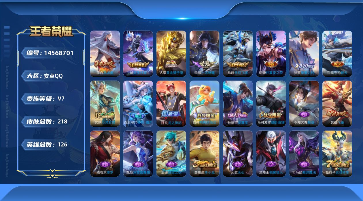 [14568701]安卓q-v1-最强王者段位-126英雄-218皮肤-0典藏-0珍品无双-0无双-0珍品传说-8传说-53史诗 【英雄全皮】:孙权全皮 【传说皮肤】:澜逐花归海,百里守约碎云,马超无双飞将,孙策挚爱之约,李信一念神魔,达摩黄金狮子座,貂蝉仲夏夜之梦,李白凤求凰 【限定皮肤】:白起狰,蔡文姬夏日便利店,虞姬夏日便利店,狄仁杰阴阳师,虞姬凯尔特女王,赵云皇家上将,鲁班七号狮舞东方,庄周蜃楼王,阿轲迷踪丽影,孙膑妖精王,扁鹊炼金王,白起夜都怪侠,芈月重明,芈月幻夜卜梦,周瑜赤莲之焰,元歌无心,夏侯惇朔风刀,曹操烛龙,典韦穷奇,马可波罗暗影游猎,狄仁杰魔术师,狄仁杰万华元夜,达摩星际陆战队,达摩沙漠行僧,项羽海滩派对,老夫子醍醐杖,程咬金演武夺筹,刘邦夺宝奇兵,韩信飞衡,兰陵王驯魔猎人,兰陵王金庭之子,孙悟空至尊宝,牛魔御旌,李元芳银河之约,李元芳云中旅人,钟馗神迹守卫,钟馗驱傩正仪,干将莫邪胡桃夹子,雅典娜单词大作战,雅典娜黎明之约,太乙真人饕餮,鬼谷子原初探秘者,鬼谷子五谷丰年,黄忠火炮绅士,百里玄策原初追逐者,弈星混沌棋,梦奇顽趣,沈梦溪星空之诺,沈梦溪大漠名商,明世隐疑决卦,明世隐吟游魔法,裴擒虎李小龙,裴擒虎擒涛扼浪,狂铁御狮,米莱狄御霄,米莱狄胡桃异想国,云中君纤云弄巧,盾山御銮,孙策挚爱之约,猪八戒西部大镖客,上官婉儿梁祝,蒙犽狂想玩偶喵,鲁班大师探海日志,桑启海盐诗旅,鬼谷子天穹祈灯,沈梦溪龙舞盛年,鲁班七号蔬乡物语,李元芳蔬乡物语,刘邦剑破天穹 【年限皮肤】:李白凤求凰,韩信飞衡 【赛季限定】:庄周蜃楼王,孙膑妖精王,扁鹊炼金王,白起狰,芈月重明,夏侯惇朔风刀,曹操烛龙,典韦穷奇,狄仁杰万华元夜,达摩沙漠行僧,老夫子醍醐杖,程咬金演武夺筹,兰陵王金庭之子,牛魔御旌,李元芳云中旅人,虞姬凯尔特女王,钟馗驱傩正仪,雅典娜黎明之约,太乙真人饕餮,鬼谷子原初探秘者,百里玄策原初追逐者,弈星混沌棋,梦奇顽趣,沈梦溪大漠名商,明世隐疑决卦,裴擒虎擒涛扼浪,狂铁御狮,米莱狄御霄,盾山御銮,鲁班大师探海日志,桑启海盐诗旅,鬼谷子天穹祈灯,刘邦剑破天穹 【战令限定】:蔡文姬夏日便利店,虞姬夏日便利店,鲁班七号狮舞东方,阿轲迷踪丽影,白起夜都怪侠,芈月幻夜卜梦,周瑜赤莲之焰,马可波罗暗影游猎,达摩星际陆战队,刘邦夺宝奇兵,兰陵王驯魔猎人,李元芳银河之约,钟馗神迹守卫,雅典娜单