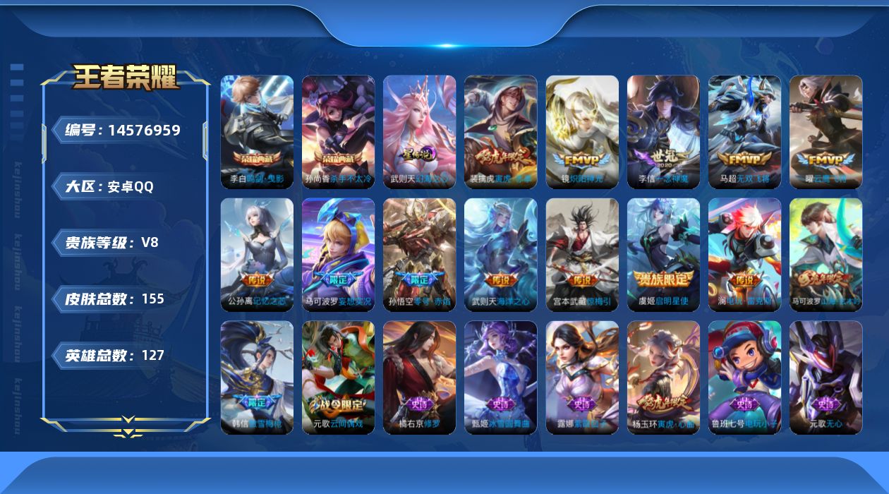 [14576959]v8-127英雄-155皮肤-2典藏皮肤-1典藏英雄-13传说-48史诗,cc8417 【英雄全皮】:蒙恬全皮 【荣耀典藏】:武则天英雄,孙尚香杀手不太冷,李白鸣剑曳影 【传说皮肤】:后羿神树通天,宫本武藏惊梅引,马可波罗妄想实况,澜电玩雷克斯,公孙离记忆之芯,马超无双飞将,裴擒虎寅虎赤拳,镜炽阳神光,虞姬启明星使,孙悟空零号赤焰,曜云鹰飞将,李信一念神魔,武则天海洋之心 【限定皮肤】:狄仁杰阴阳师,赵云皇家上将,赵云百木心呛,芈月幻夜卜梦,元歌云间偶戏,元歌无心,甄姬女儿国国王,甄姬游园惊梦,马可波罗山海玄木吟,马可波罗妄想实况,狄仁杰魔术师,狄仁杰万华元夜,达摩沙漠行僧,项羽海滩派对,韩信傲雪梅呛,兰陵王金庭之子,亚瑟潮玩骑士王,孙悟空零号赤焰,李元芳云中旅人,虞姬启明星使,杨玉环寅虎心曲,鬼谷子原初探秘者,鬼谷子五谷丰年,黄忠火炮绅士,苏烈千军破阵,梦奇顽趣,沈梦溪大漠名商,裴擒虎寅虎赤拳,裴擒虎擒涛扼浪,云中君纤云弄巧,嫦娥拒霜思,鲁班大师探海日志,镜匿光追影者,桑启海盐诗旅,艾琳女武神,阿古朵江河有灵,张良古海寻踪,蒙恬荣光圣徽,鬼谷子天穹祈灯 【年限皮肤】:裴擒虎寅虎赤拳,杨玉环寅虎心曲,马可波罗山海玄木吟 【赛季限定】:狄仁杰万华元夜,达摩沙漠行僧,兰陵王金庭之子,张良古海寻踪,李元芳云中旅人,鬼谷子原初探秘者,苏烈千军破阵,梦奇顽趣,沈梦溪大漠名商,裴擒虎擒涛扼浪,鲁班大师探海日志,桑启海盐诗旅,鬼谷子天穹祈灯,蒙恬荣光圣徽 【战令限定】:芈月幻夜卜梦,元歌云间偶戏,亚瑟潮玩骑士王,黄忠火炮绅士 【史诗皮肤】:鲁班七号电玩小子,露娜紫霞仙子,赵云皇家上将,甄姬冰雪圆舞曲,王昭君偶像歌手,狄仁杰魔术师,廉颇地狱岩魂,宫本武藏鬼剑武藏,孙尚香水果甜心,嬴政摇滚巨星,妲己魅力维加斯,妲己女仆咖啡,墨子龙骑士,墨子金属风暴,吕布圣诞狂欢,刘禅绅士熊喵,曹操幽灵船长,吕布末日机甲,夏侯惇乘风破浪,小乔缤纷独角兽,兰陵王暗隐猎兽者,甄姬游园惊梦,雅典娜冰冠公主,百里守约特工魅影,李元芳逐浪之夏,程咬金功夫厨神,白起星夜王子,狄仁杰鹰眼统帅,橘右京修罗,云中君纤云弄巧,元歌云间偶戏,嫦娥拒霜思,镜匿光追影者,黄忠火炮绅士,甄姬女儿国国王,韩信傲雪梅呛,杨玉环寅虎心曲,夏洛特永昼,赵云百木心呛,澜赏金猎手,貂蝉唤灵魅影,鬼谷子五谷丰年,元歌无心,梦奇顽趣,马可波罗