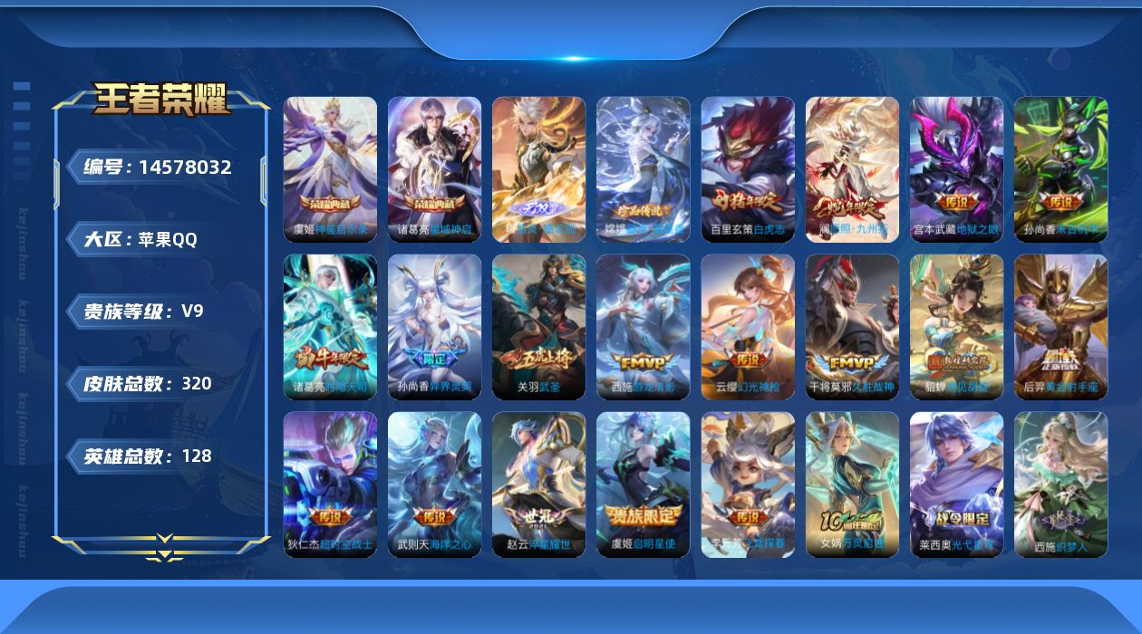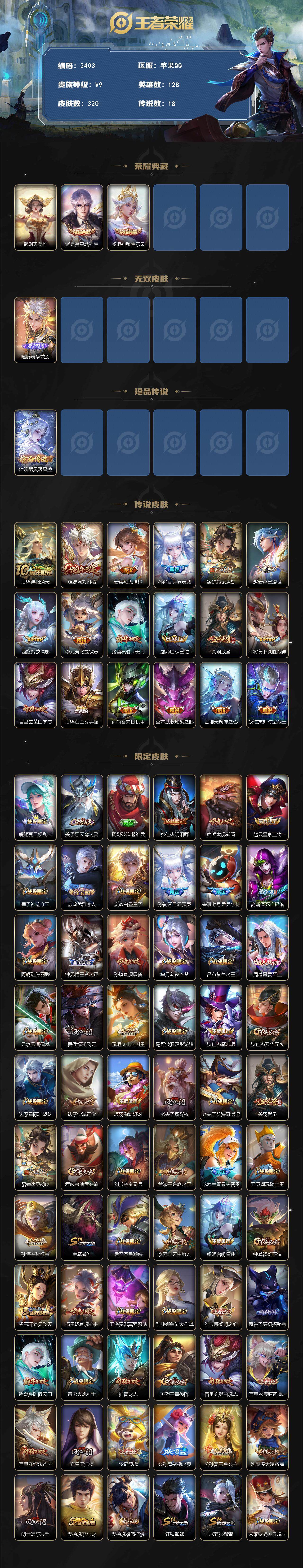 [14578032]苹果q-v9-最强王者段位-128英雄-320皮肤-2典藏皮肤-1典藏英雄-1无双-1珍品传说-18传说-97史诗 【英雄全皮】:孙权全皮,猪八戒全皮,空空儿全皮 【荣耀典藏】:武则天英雄,诸葛亮星域神启,虞姬神鉴启示录 【无双皮肤】:曜器灵螭龙剑 【珍品传说】:嫦娥器灵落星盏 【传说皮肤】:后羿神树通天,澜愿照九州拓,云缨幻光神呛,孙尚香异界灵契,貂蝉遇见胡旋,赵云淬星耀世,西施游龙清影,李元芳飞鸢探春,诸葛亮时雨天司,虞姬启明星使,关羽武圣,干将莫邪久胜战神,百里玄策白虎志,后羿黄金射手座,孙尚香末日机甲,宫本武藏地狱之眼,武则天海洋之心,狄仁杰超时空战士 【限定皮肤】:虞姬夏日便利店,姜子牙天穹之誓,杨戬破阵退雄兵,狄仁杰阴阳师,廉颇寅虎御盾,赵云皇家上将,墨子神迹守卫,嬴政优雅恋人,嬴政白昼王子,孙尚香异界灵契,鲁班七号乒乒小将,高渐离死亡摇滚,阿轲迷踪丽影,钟无艳王者之锤,孙膑寅虎展翼,芈月幻夜卜梦,吕布猎兽之王,周瑜真爱至上,元歌云间偶戏,夏侯惇朔风刀,甄姬女儿国国王,马可波罗暗影游猎,狄仁杰魔术师,狄仁杰万华元夜,达摩星际陆战队,达摩沙漠行僧,项羽海滩派对,老夫子醍醐杖,老夫子航海奇遇记,关羽武圣,貂蝉遇见胡旋,程咬金演武夺筹,刘邦夺宝奇兵,兰陵王金庭之子,花木兰青春决赛季,亚瑟潮玩骑士王,孙悟空孙行者,牛魔御旌,后羿圣弓游侠,李元芳云中旅人,虞姬启明星使,钟馗驱傩正仪,杨玉环遇见飞天,杨玉环寅虎心曲,干将莫邪真爱魔法,雅典娜单词大作战,雅典娜黎明之约,鬼谷子原初探秘者,诸葛亮时雨天司,黄忠火炮绅士,铠青龙志,苏烈千军破阵,百里玄策白虎志,百里玄策原初追逐者,百里守约朱雀志,弈星混沌棋,梦奇顽趣,公孙离蜜橘之夏,公孙离玉兔公主,沈梦溪大漠名商,明世隐疑决卦,裴擒虎李小龙,裴擒虎擒涛扼浪,狂铁御狮,米莱狄御霄,米莱狄胡桃异想国,盾山御銮,猪八戒西部大镖客,猪八戒猪悟能,上官婉儿梁祝,上官婉儿天狼绘梦者,嫦娥如梦令,嫦娥拒霜思,蒙犽狂想玩偶喵,鲁班大师探海日志,镜匿光追影者,桑启海盐诗旅,张良古海寻踪,裴擒虎梅西,鬼谷子天穹祈灯,伽罗琥珀纪元,沈梦溪龙舞盛年,李元芳蔬乡物语,刘邦剑破天穹,项羽苍威无极,周瑜熔金海岸 【年限皮肤】:百里玄策白虎志,百里守约朱雀志,铠青龙志,孙膑寅虎展翼,杨玉环寅虎心曲,廉颇寅虎御盾,诸葛亮时雨天司,关羽武圣 【赛季限定】: