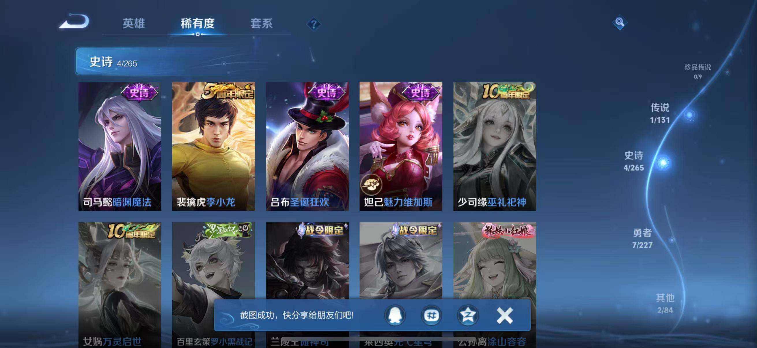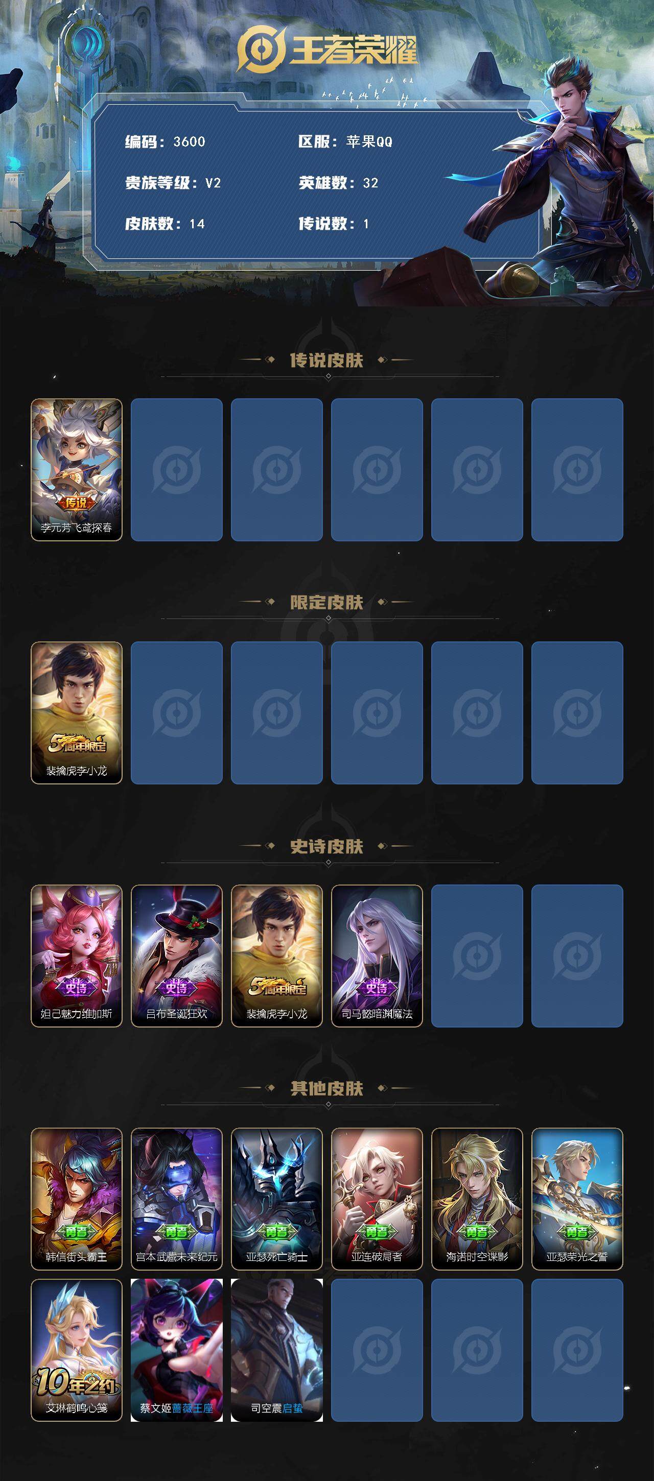 苹果q-v0-最强王者段位-32英雄-14皮肤-1传说-4史诗 【传说皮肤】:李元芳飞鸢探春 【限定皮肤】:裴擒虎李小龙 【史诗皮肤】:妲己魅力维加斯,吕布圣诞狂欢,裴擒虎李小龙,司马懿暗渊魔法 【其他皮肤】:韩信街头霸王,宫本武藏未来纪元,亚瑟死亡骑士,亚连破局者,海诺时空谍影,亚瑟荣光之誓,艾琳鹤鸣心笺,蔡文姬蔷薇王座,司空震启蛰 【营地id】:1594487389