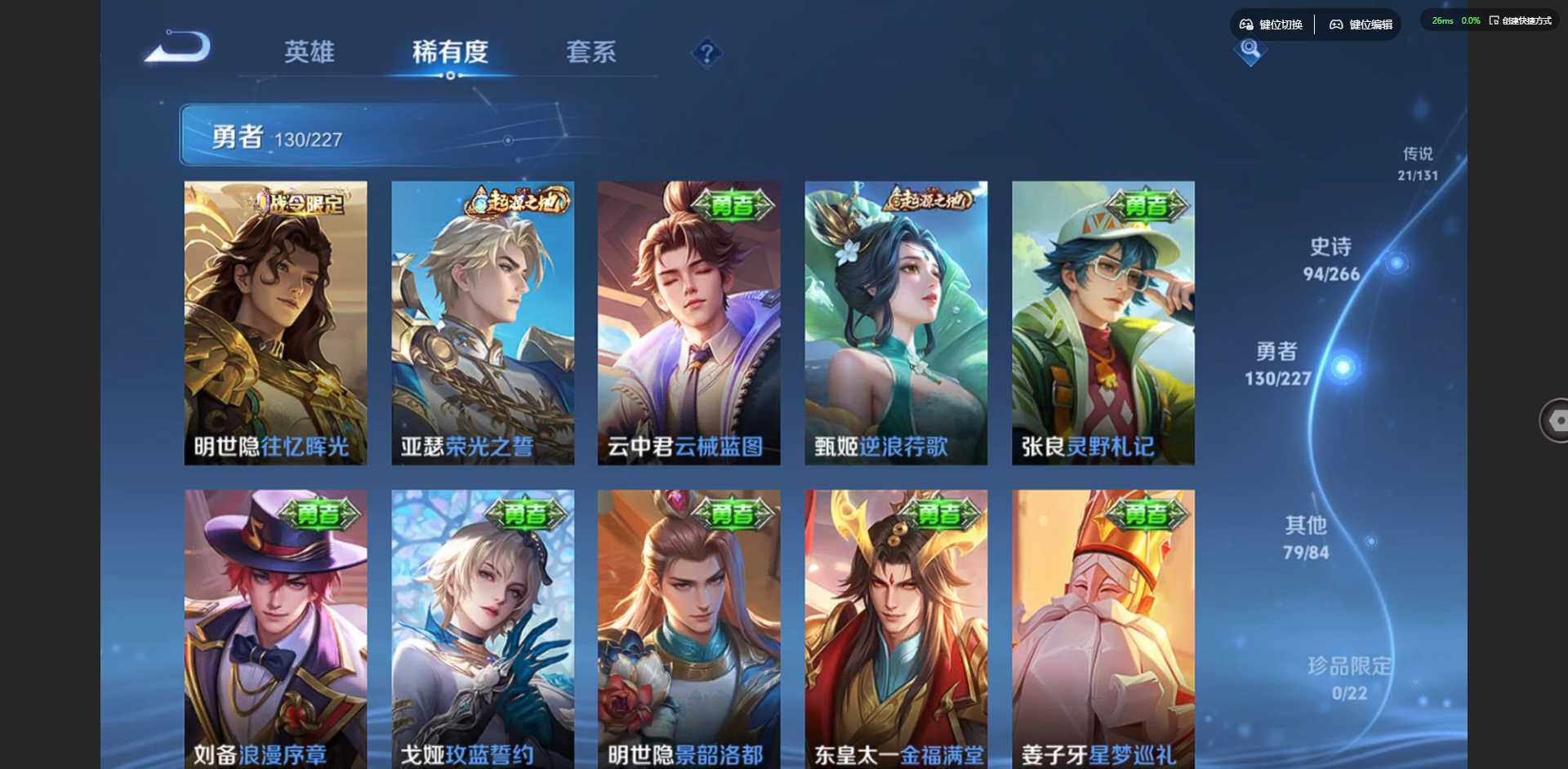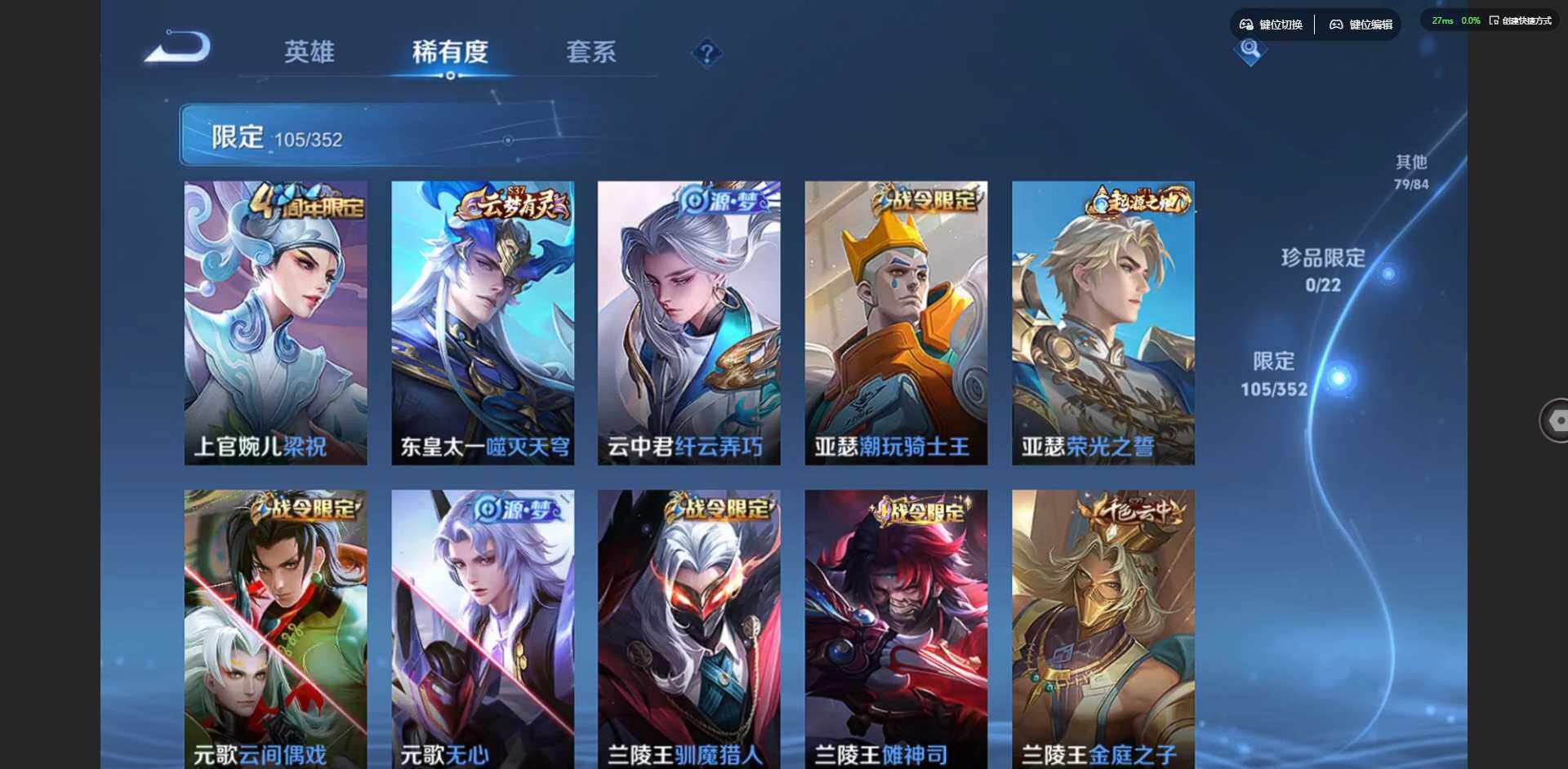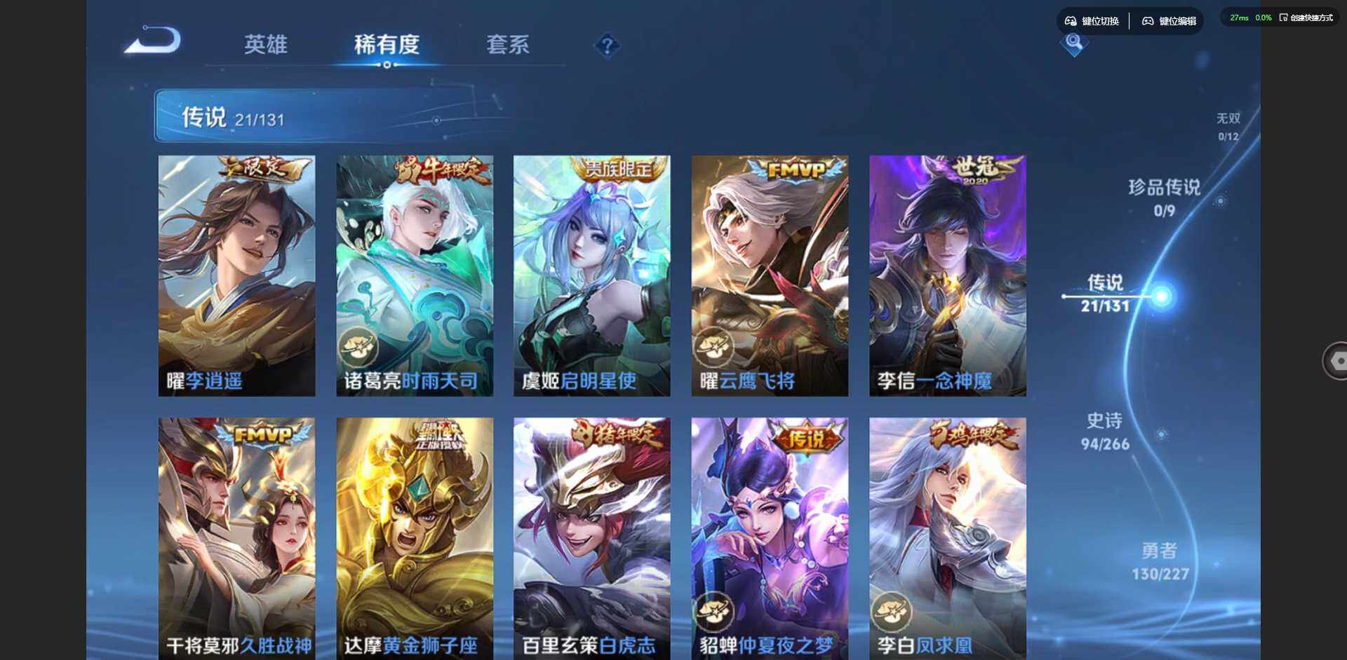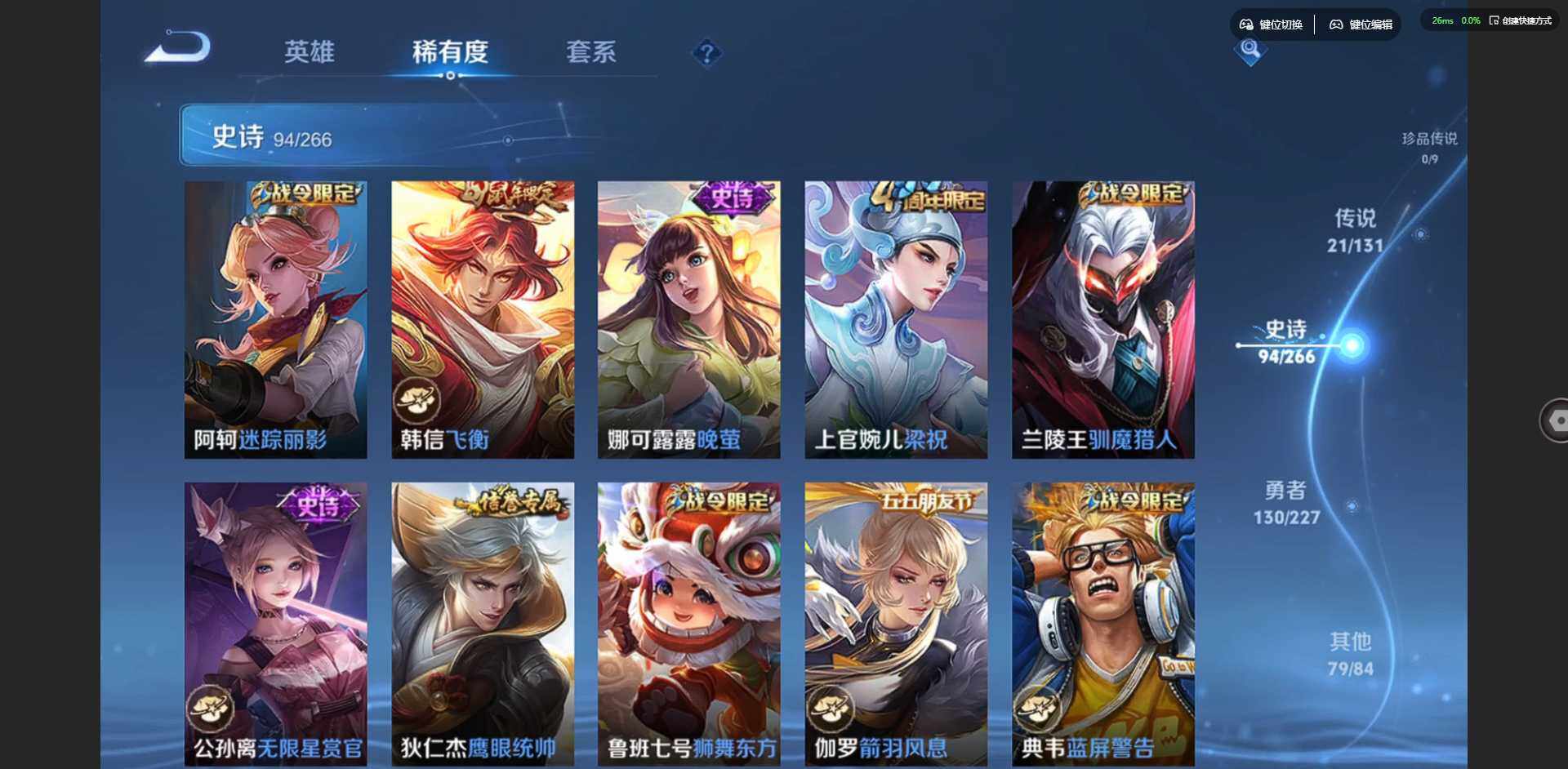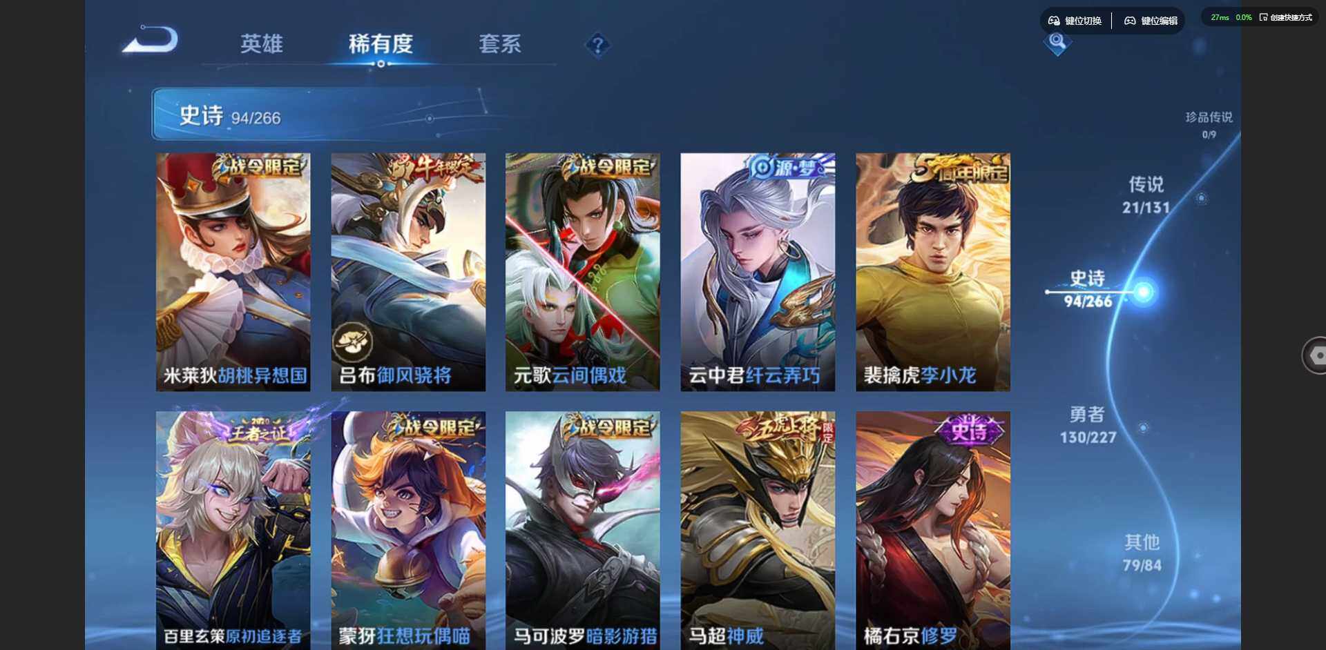 2305734-【金标鲁班七号 金标李元芳】实名: 可修改 贵族等级: v9 英雄数: 127 皮肤数: 326 荣耀水晶: 杀手不太冷弑呛猎影 星传说: 未来机甲金色仲夏夜岁雨灵司 传说皮: 黄金狮子座云鹰飞将久胜战神一念神魔末日机甲-孙尚香仲夏夜之梦李乞巧织情末日机甲-孙策燃星之曲画中仙乘龙·淬吴钩典韦战鼓燎原 限定皮: 冰锋战神李小龙游园惊梦梁祝
