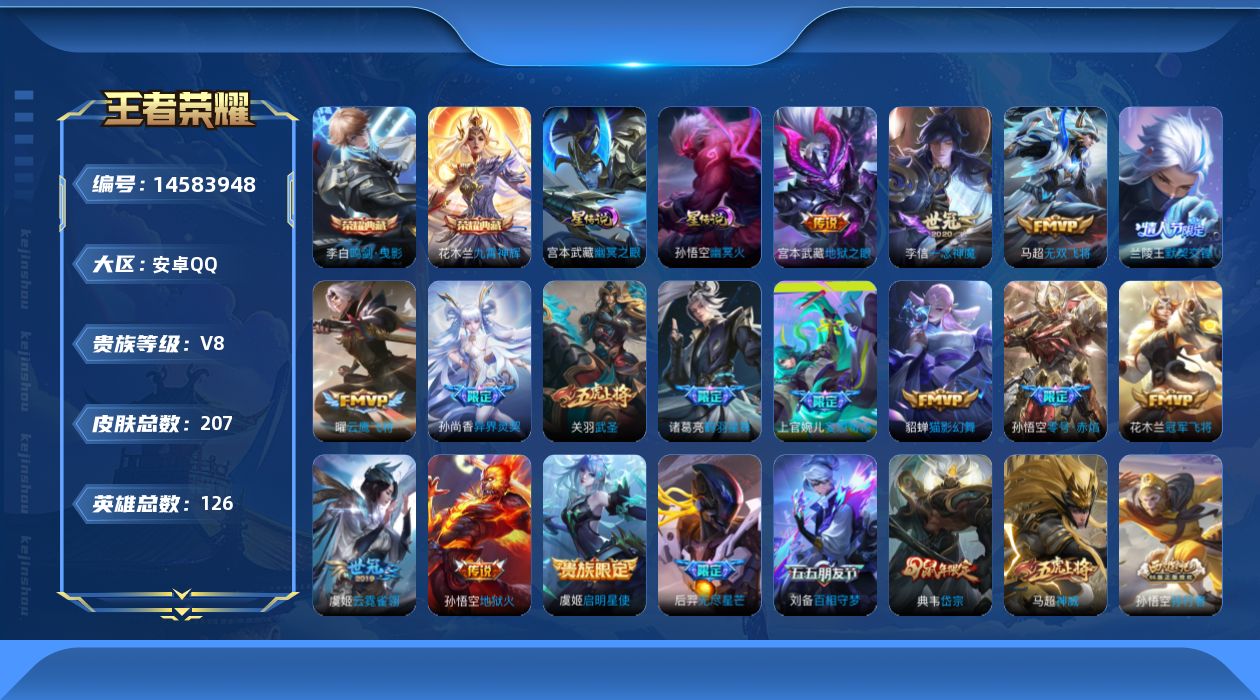[14583948],,高质量皮肤,v8-126英雄-207皮肤-2典藏-17传说-73史诗,cc8368, 【荣耀典藏】:李白鸣剑曳影,花木兰九霄神辉 【传说皮肤】:后羿神树通天,上官婉儿妄想奇谈,诸葛亮鹤羽星尊,后羿无尽星芒,马超无双飞将,孙尚香异界灵契,兰陵王默契交锋,虞姬启明星使,孙悟空零号赤焰,关羽武圣,曜云鹰飞将,李信一念神魔,貂蝉猫影幻舞,虞姬云霓雀翎,花木兰冠军飞将,宫本武藏地狱之眼,孙悟空地狱火 【限定皮肤】:狄仁杰阴阳师,赵云皇家上将,赵云龙胆,墨子神迹守卫,妲己时之彼端,嬴政优雅恋人,孙尚香异界灵契,庄周高山流水,高渐离玩趣恶龙,钟无艳超时空战士,白起夜都怪侠,芈月幻夜卜梦,周瑜赤莲之焰,元歌云间偶戏,元歌无心,夏侯惇匿光决锋者,甄姬落雪兰心,典韦岱宗,马可波罗暗影游猎,狄仁杰魔术师,狄仁杰万华元夜,达摩星际陆战队,达摩沙漠行僧,项羽海滩派对,老夫子航海奇遇记,关羽武圣,程咬金演武夺筹,韩信傲雪梅呛,王昭君午后时光,兰陵王默契交锋,兰陵王驯魔猎人,兰陵王金庭之子,花木兰默契交锋,亚瑟潮玩骑士王,孙悟空大圣娶亲,孙悟空零号赤焰,孙悟空孙行者,后羿辉光之辰,后羿圣弓游侠,后羿无尽星芒,刘备百相守梦,李元芳银河之约,李元芳云中旅人,虞姬启明星使,钟馗驱傩正仪,干将莫邪真爱魔法,雅典娜单词大作战,蔡文姬繁星吟游,鬼谷子原初探秘者,鬼谷子五谷丰年,诸葛亮鹤羽星尊,黄忠火炮绅士,苏烈千军破阵,百里守约朱雀志,弈星混沌棋,沈梦溪星空之诺,沈梦溪大漠名商,明世隐疑决卦,裴擒虎李小龙,裴擒虎擒涛扼浪,米莱狄胡桃异想国,云中君纤云弄巧,云中君时之祈愿,猪八戒西部大镖客,上官婉儿梁祝,上官婉儿妄想奇谈,嫦娥拒霜思,蒙犽狂想玩偶喵,鲁班大师探海日志,镜匿光追影者,桑启海盐诗旅,张良古海寻踪,鬼谷子天穹祈灯,百里玄策超元猎域,刘邦剑破天穹,程咬金群星魔术团 【年限皮肤】:百里守约朱雀志,后羿辉光之辰,典韦岱宗,马超神威,关羽武圣,赵云龙胆 【赛季限定】:狄仁杰万华元夜,达摩沙漠行僧,程咬金演武夺筹,兰陵王金庭之子,张良古海寻踪,李元芳云中旅人,钟馗驱傩正仪,鬼谷子原初探秘者,苏烈千军破阵,弈星混沌棋,沈梦溪大漠名商,明世隐疑决卦,裴擒虎擒涛扼浪,鲁班大师探海日志,桑启海盐诗旅,鬼谷子天穹祈灯,刘邦剑破天穹 【战令限定】:墨子神迹守卫,钟无艳超时空战士,白起夜都怪侠,芈月幻夜卜梦,周瑜赤莲