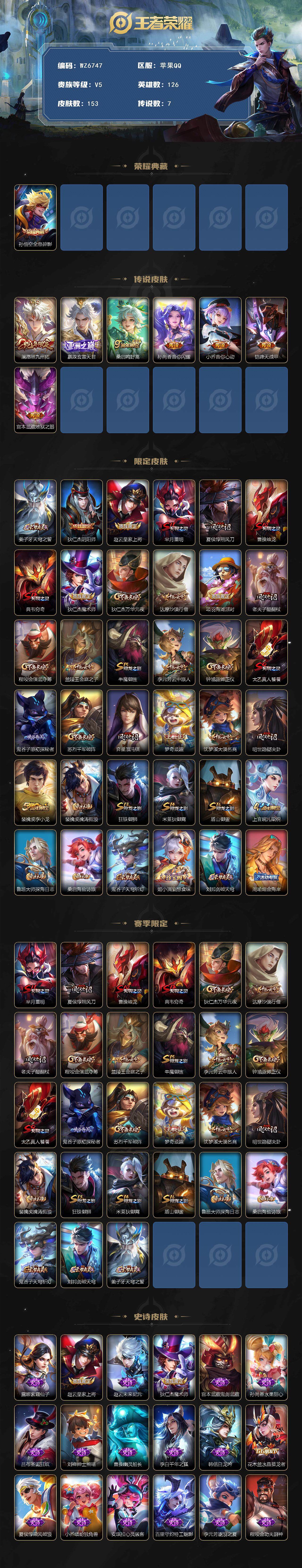 苹果q-v5-最强王者段位-126英雄-153皮肤-1典藏皮肤-7传说-30史诗 【荣耀典藏】:孙悟空全息碎影 【传说皮肤】:澜愿照九州拓,嬴政玄雷天君,桑启鸣野蒿,孙尚香音你闪耀,小乔音你心动,铠绛天战甲,宫本武藏地狱之眼 【限定皮肤】:姜子牙天穹之誓,狄仁杰阴阳师,赵云皇家上将,芈月重明,夏侯惇朔风刀,曹操烛龙,典韦穷奇,狄仁杰魔术师,狄仁杰万华元夜,达摩沙漠行僧,项羽海滩派对,老夫子醍醐杖,程咬金演武夺筹,兰陵王金庭之子,牛魔御旌,李元芳云中旅人,钟馗驱傩正仪,太乙真人饕餮,鬼谷子原初探秘者,苏烈千军破阵,弈星混沌棋,梦奇顽趣,沈梦溪大漠名商,明世隐疑决卦,裴擒虎李小龙,裴擒虎擒涛扼浪,狂铁御狮,米莱狄御霄,盾山御銮,上官婉儿梁祝,鲁班大师探海日志,桑启海盐诗旅,鬼谷子天穹祈灯,姬小满妄想食味,刘邦剑破天穹,周瑜熔金海岸 【赛季限定】:芈月重明,夏侯惇朔风刀,曹操烛龙,典韦穷奇,狄仁杰万华元夜,达摩沙漠行僧,老夫子醍醐杖,程咬金演武夺筹,兰陵王金庭之子,牛魔御旌,李元芳云中旅人,钟馗驱傩正仪,太乙真人饕餮,鬼谷子原初探秘者,苏烈千军破阵,弈星混沌棋,梦奇顽趣,沈梦溪大漠名商,明世隐疑决卦,裴擒虎擒涛扼浪,狂铁御狮,米莱狄御霄,盾山御銮,鲁班大师探海日志,桑启海盐诗旅,鬼谷子天穹祈灯,刘邦剑破天穹,姜子牙天穹之誓 【史诗皮肤】:露娜紫霞仙子,赵云皇家上将,赵云未来纪元,狄仁杰魔术师,宫本武藏鬼剑武藏,孙尚香水果甜心,吕布圣诞狂欢,刘禅绅士熊喵,曹操幽灵船长,李白千年之狐,韩信白龙吟,花木兰水晶猎龙者,夏侯惇乘风破浪,小乔缤纷独角兽,安琪拉心灵骇客,百里守约特工魅影,李元芳逐浪之夏,程咬金功夫厨神,狄仁杰鹰眼统帅,上官婉儿梁祝,娜可露露晚萤,小乔青蛇,不知火舞魅语,橘右京修罗,裴擒虎李小龙,梦奇顽趣,姬小满妄想食味,黄忠百相守梦,公孙离涂山容容,女娲万灵启世 【其他皮肤】:项羽海滩派对,韩信教廷特使,韩信街头霸王,露娜哥特玫瑰,赵云白执事,芈月红桃皇后,武则天东方不败,扁鹊化身博士,宫本武藏未来纪元,安琪拉玩偶对对碰,孙膑天使之翼,妲己少女阿狸,典韦黄金武士,甄姬花好人间,刘备万事如意,宫本武藏万象初新,狄仁杰阴阳师,关羽龙腾万里,钟无艳海滩丽影,太乙真人饕餮,曹操烛龙,芈月重明,老夫子功夫老勺,孙尚香沉稳之力,典韦穷奇,诸葛亮掌控之力,狂铁御狮,大乔守护之力,米莱狄御霄,牛魔御旌,小乔丁香结,盾山御銮,孙膑归虚梦演,沈梦溪鲨炮海盗猫,夏侯惇朔风刀,弈星混沌棋,哪吒次元突破,明世隐疑决卦,老夫子醍醐杖,鬼谷子原初探秘者,狄仁杰万华元夜,刘禅秘密基地,程咬金演武夺筹,张良缤纷绘卷,钟馗驱傩正仪,鲁班大师乓乓大师,苏烈千军破阵,达摩沙漠行僧,程咬金无双福将,兰陵王金庭之子,沈梦溪大漠名商,李元芳云中旅人,桑启海盐诗旅,猪八戒潮玩探月行,裴擒虎擒涛扼浪,鲁班大师探海日志,鬼谷子天穹祈灯,廉颇功夫炙烤,刘邦剑破天穹,姜子牙天穹之誓,周瑜熔金海岸,东皇太一噬灭天穹,干将莫邪雾都夜雨,苍苍林狼骑,太乙真人谧流熔炉,典韦铁骨偃魂,东皇太一金福满堂,少司缘灵卦秘语,钟馗虚灵犬护,张良灵野札记,阿古朵布丁狗之约,露娜命运加冕,姬小满小满鸭,甄姬逆浪荇歌,莱西奥踏浪烽翎,鬼谷子克喵,亚瑟荣光之誓,艾琳鹤鸣心笺,高渐离金属狂潮,露娜绯红之刃,王昭君精灵公主,张良一千零一夜,小乔万圣前夜,孙悟空西部大镖客,后羿精灵王,刘禅英喵野望,兰陵王隐刃,李元芳特种部队,蔡文姬蔷薇王座,夏侯惇战争骑士,马可波罗激情绿茵,苍维京掠夺者,杨戬埃及法老,哪吒三太子,诸葛亮星航指挥官,大乔伊势巫女,东皇太一东海龙王,百里守约绝影神呛,百里玄策威尼斯狂欢,梦奇美梦成真,女娲尼罗河女神,明世隐占星师,米莱狄精准探案法,元歌午夜歌剧院,孙策海之征途,伽罗花见巫女,盘古创世神祝,瑶森,云中君荷鲁斯之眼,曜归虚梦演,马超幸存者,蒙犽归虚梦演,镜冰刃幻境,澜孤猎,云缨赤焰之缨 【营地id】:53860058
