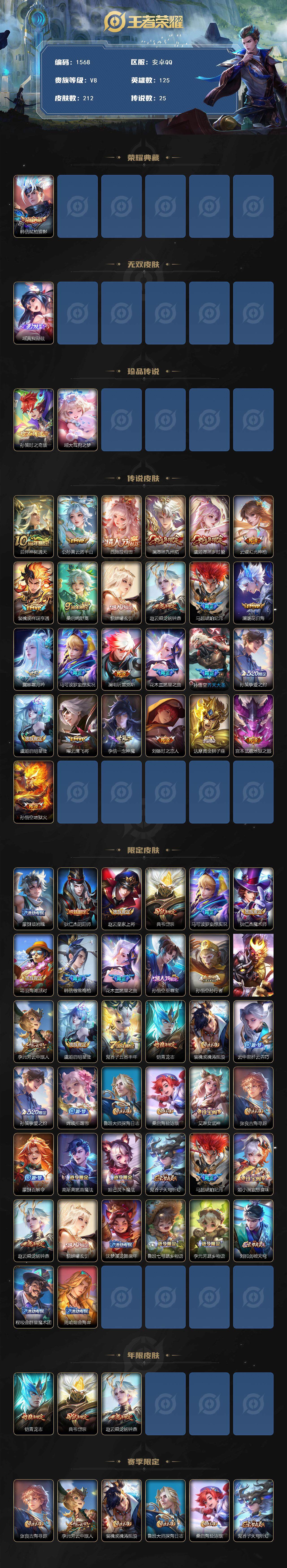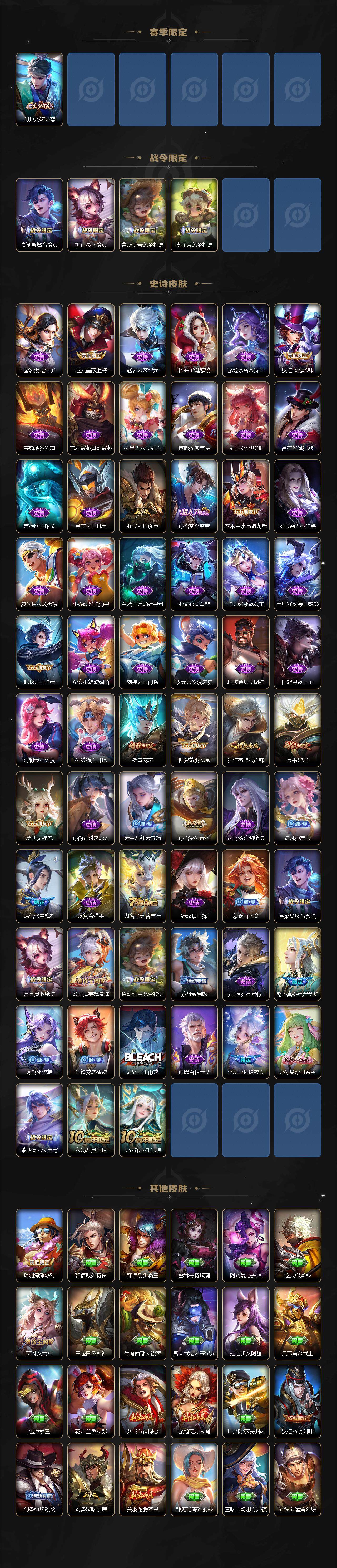 125英雄-212皮肤-贵族8/皮肤212/典藏1/传说25/史诗62/英雄125/孙权全皮/澜全皮/影全皮/弑呛猎影 韩信/真我赫兹 瑶/时之奇旅 孙策/大耳狗之梦 瑶/神树通天 后羿/云诺千山 公孙离/续相思 西施/愿照·九州拓 澜/愿照·岁时盈 虞姬/幻光神呛 云缨/祥瑞亨通 裴擒虎/鸣野蒿 桑启/曦玄引 貂蝉/乘龙·铭钟鼎 赵云/琥珀纪元 马超/逐花归海 澜/霜月吟 露娜/妄想实况 马可波罗/电玩·雷克斯 澜