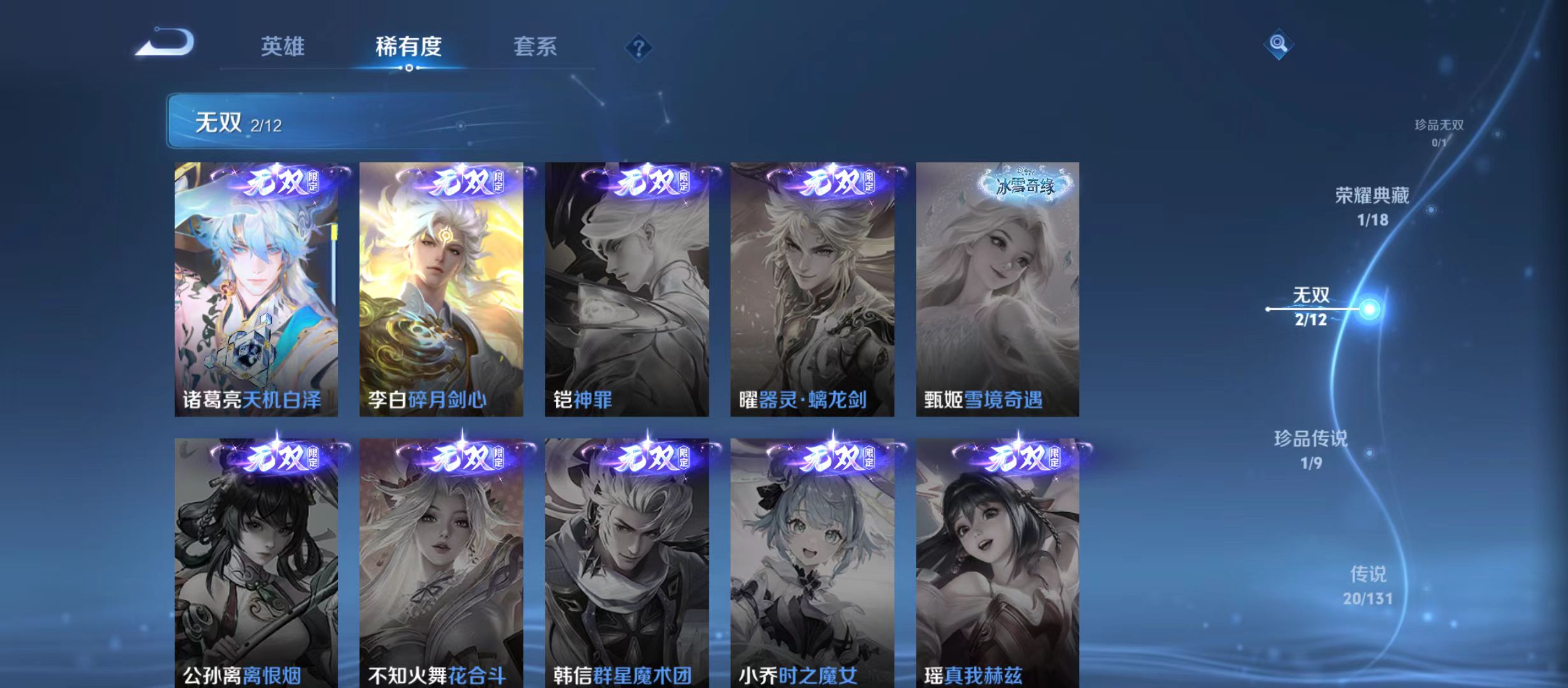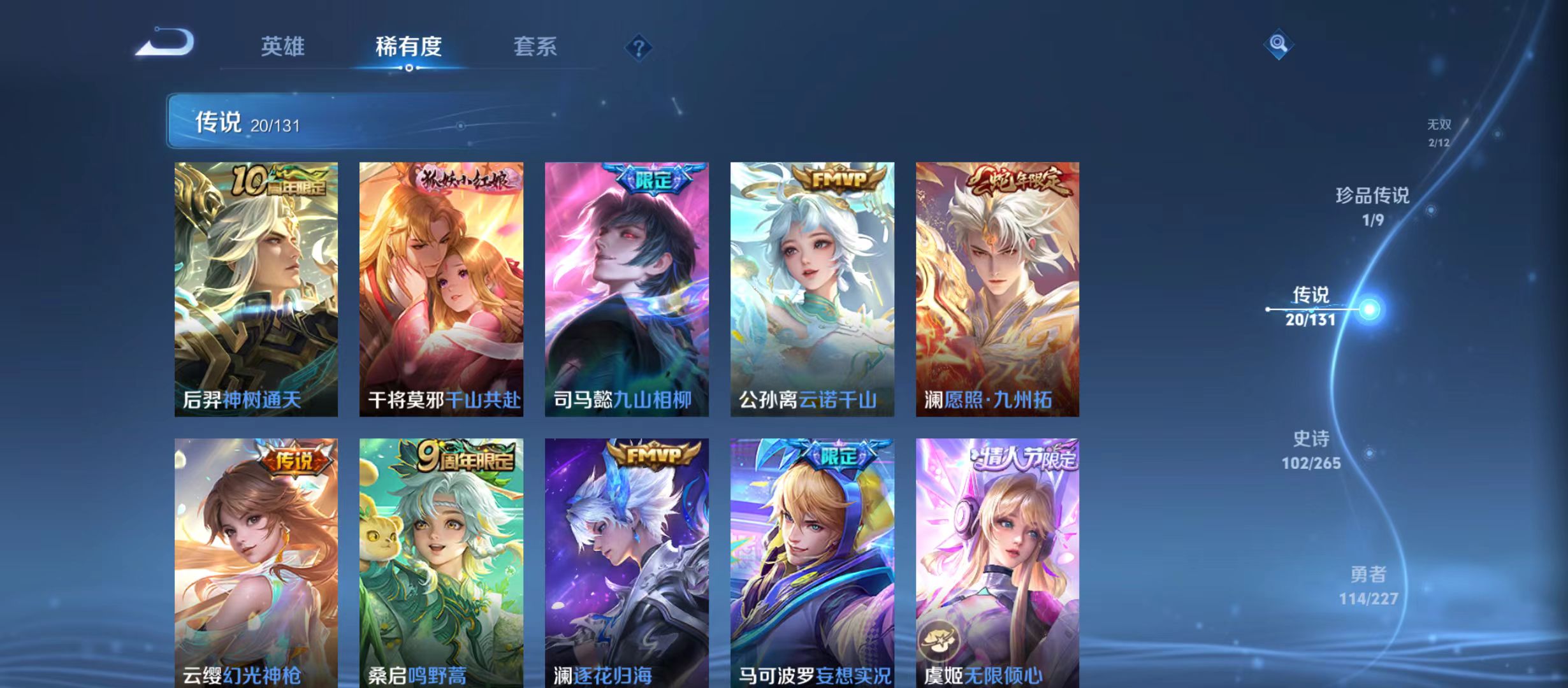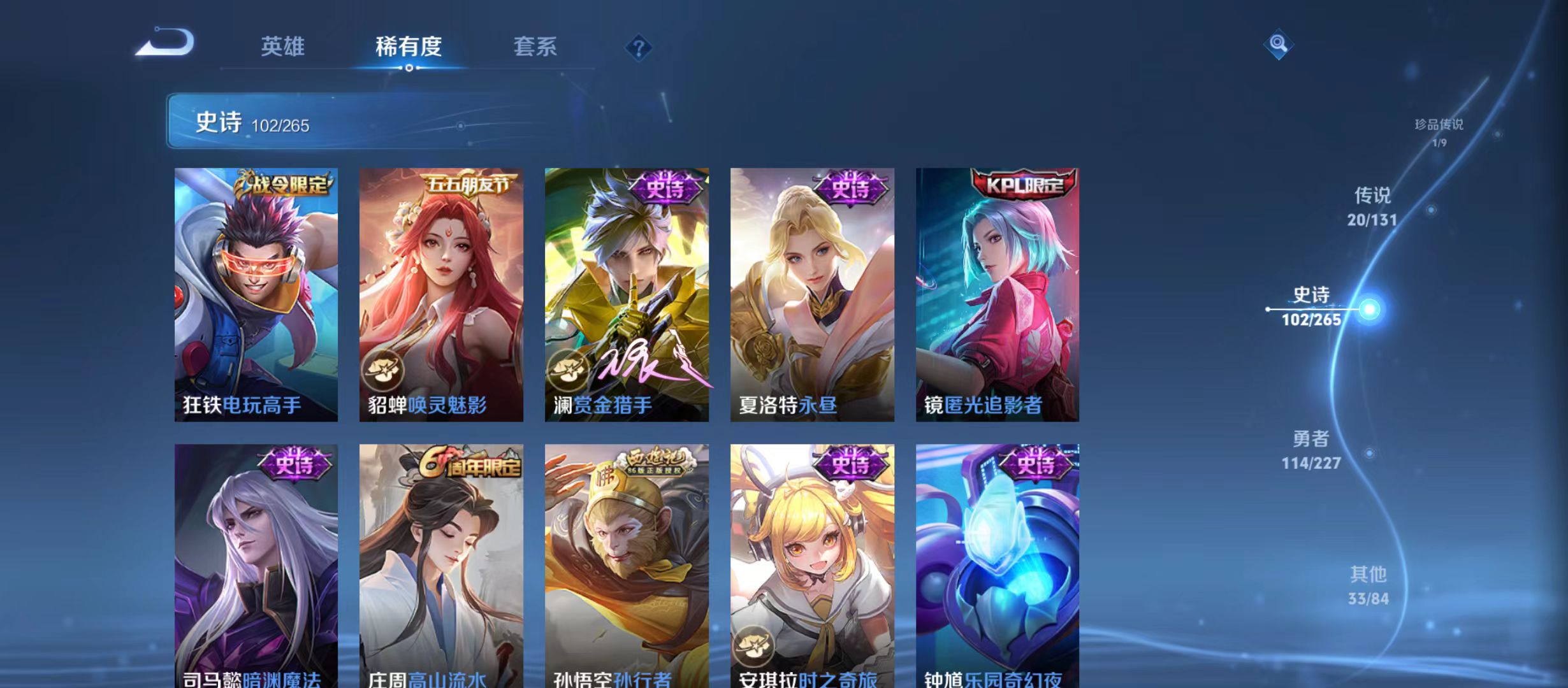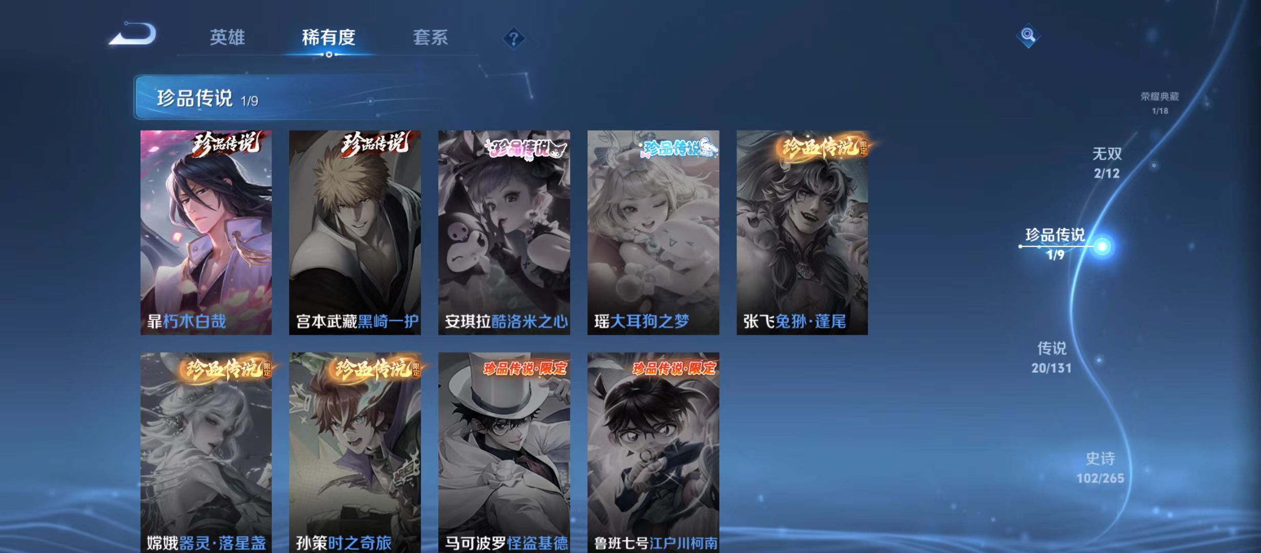 txwz23994-v8-273皮肤 1典藏最初的交响 2无双碎月剑心,天机白泽 1珍品朽木白哉 20传说时之恋人,久胜战神,神树通天,黄金白羊座,千山共赴,逐花归海,九山相柳,妄想实况,启明星使,末日机甲,无限倾心,地狱之眼,怒海麟威,云诺千山,无限倾心,愿照·九州拓,山海·苍雷引,鸣野蒿,幻光神呛,乞巧织情 102史诗