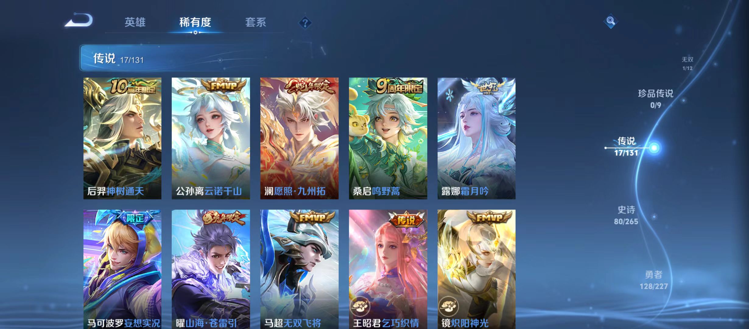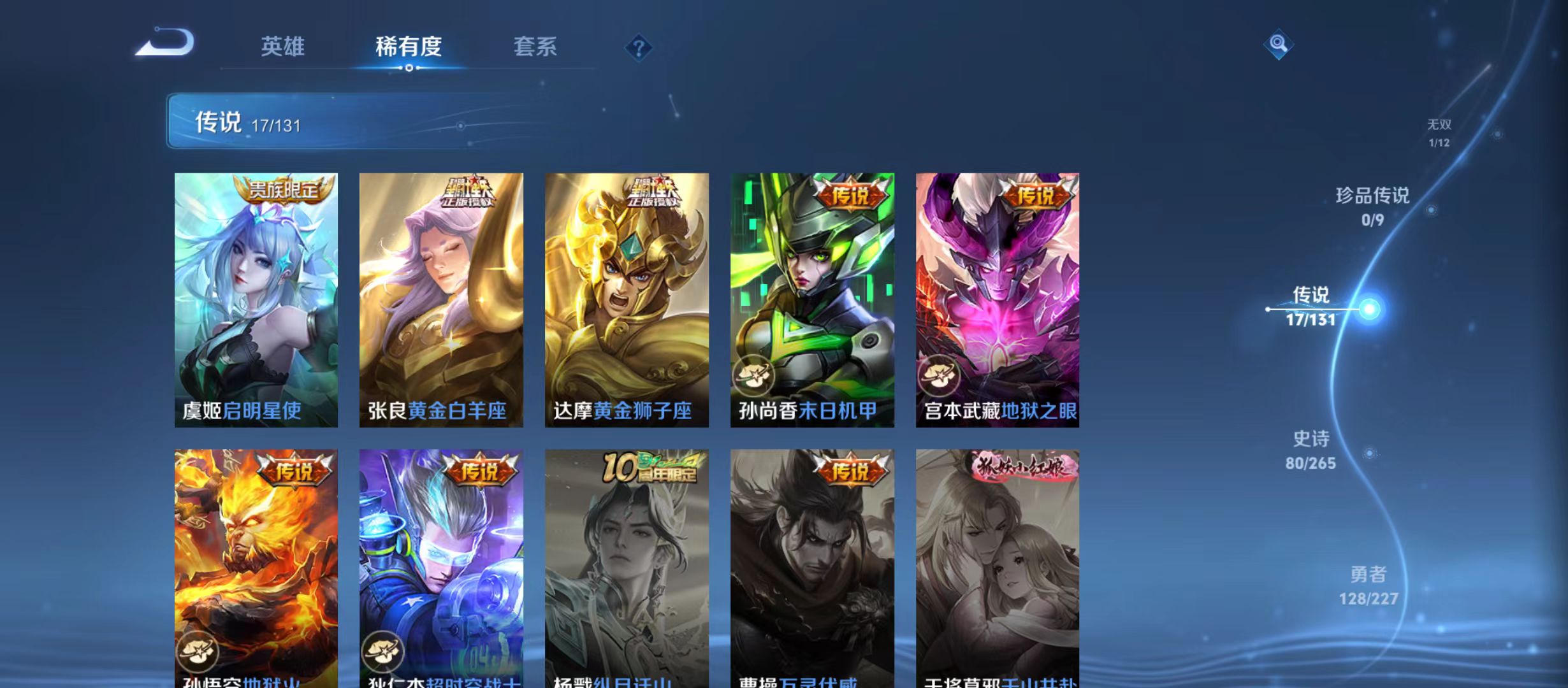 txwz24033-v8-278皮肤 1典藏弑呛猎影 1无双器灵·螭龙剑 17传说黄金白羊座,神树通天,启明星使,末日机甲,妄想实况,霜月吟,超时空战士,云诺千山,黄金狮子座,乞巧织情,愿照·九州拓,鸣野蒿,地狱之眼,炽阳神光,山海·苍雷引,无双飞将,地狱火 80史诗