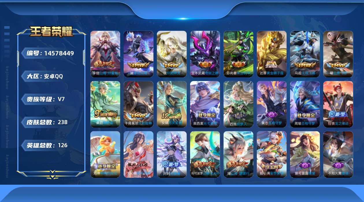 v7 10传说 126英雄 238皮肤 可修改实名 【英雄全皮】:蒙恬全皮敖隐全皮孙权全皮影全皮 【稀有英雄】:敖隐小龙人大司命韩信韩跳跳夏洛特夏师傅艾琳橘右京橘子娜可露露鸟人不知火舞赵云金蝉唐僧戈娅 【传说皮】:山海·炽霜斩李信年限黄金狮子