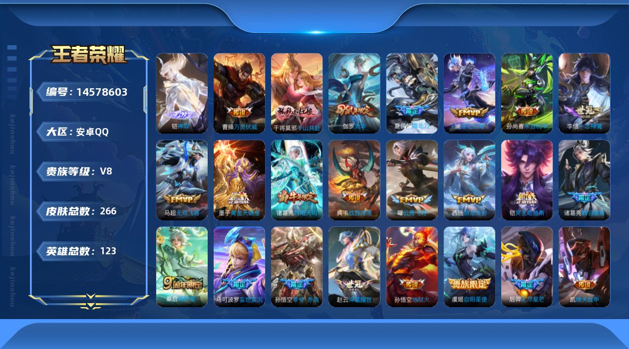v8 1无双 24传说 123英雄 266皮肤 可修改实名 【英雄全皮】:少司缘全皮孙权全皮影全皮 【稀有英雄】:大司命韩信韩跳跳艾琳橘右京橘子娜可露露鸟人不知火舞赵云戈娅 【无双皮】:神罪 【传说皮】:典韦战鼓燎原黄金天蝎座铠冥王哈迪斯神树通天万灵伏威千山