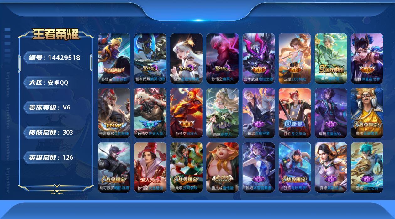 [14429518]【店主推荐捡漏号!可直接换绑】安卓q-v6-至尊星耀ii段位-126英雄-303皮肤-1典藏皮肤-3星传说-7传说-69史诗 【英雄全皮】:鬼谷子全皮,狂铁全皮,猪八戒全皮 【荣耀典藏】:孙悟空全息碎影 【传说皮肤】:云缨幻光神呛,桑启鸣野蒿,孙悟空齐天大圣,干将莫邪久胜战神,貂蝉仲夏夜之梦,宫本武藏地狱之眼,孙悟空地狱火 【限定皮肤】:白起狰,姜子牙天穹之誓,狄仁杰阴阳师,虞姬凯尔特女王,赵云皇家上将,嬴政优雅恋人,嬴政白昼王子,孙尚香蔷薇恋人,鲁班七号狮舞东方,庄周高山流水,钟无艳超时空战士,白起夜都怪侠,芈月重明,芈月幻夜卜梦,吕布猎兽之王,周瑜赤莲之焰,元歌云间偶戏,夏侯惇朔风刀,甄姬落雪兰心,曹操烛龙,典韦穷奇,典韦蓝屏警告,马可波罗暗影游猎,狄仁杰魔术师,狄仁杰万华元夜,达摩沙漠行僧,项羽海滩派对,老夫子醍醐杖,程咬金演武夺筹,王昭君午后时光,兰陵王驯魔猎人,兰陵王金庭之子,亚瑟潮玩骑士王,孙悟空大圣娶亲,孙悟空齐天大圣,牛魔御旌,后羿圣弓游侠,李元芳银河之约,李元芳云中旅人,钟馗神迹守卫,钟馗驱傩正仪,杨玉环遇见飞天,女娲朔望之晖,干将莫邪真爱魔法,太乙真人饕餮,鬼谷子原初探秘者,鬼谷子五谷丰年,黄忠火炮绅士,苏烈千军破阵,弈星混沌棋,沈梦溪大漠名商,明世隐疑决卦,明世隐吟游魔法,裴擒虎李小龙,裴擒虎擒涛扼浪,狂铁御狮,狂铁电玩高手,米莱狄御霄,云中君纤云弄巧,盾山御銮,猪八戒西部大镖客,猪八戒猪悟能,上官婉儿梁祝,嫦娥暖冬兔眠,鲁班大师探海日志,桑启海盐诗旅,暃星界游侠,艾琳女武神,阿古朵江河有灵,张良古海寻踪,蒙犽百解令,鬼谷子天穹祈灯,沈梦溪龙舞盛年,刘邦剑破天穹,周瑜熔金海岸 【赛季限定】:白起狰,芈月重明,夏侯惇朔风刀,曹操烛龙,典韦穷奇,狄仁杰万华元夜,达摩沙漠行僧,老夫子醍醐杖,程咬金演武夺筹,兰陵王金庭之子,张良古海寻踪,牛魔御旌,李元芳云中旅人,虞姬凯尔特女王,钟馗驱傩正仪,太乙真人饕餮,鬼谷子原初探秘者,苏烈千军破阵,弈星混沌棋,沈梦溪大漠名商,明世隐疑决卦,裴擒虎擒涛扼浪,狂铁御狮,米莱狄御霄,盾山御銮,鲁班大师探海日志,桑启海盐诗旅,鬼谷子天穹祈灯,刘邦剑破天穹,姜子牙天穹之誓 【战令限定】:嬴政白昼王子,鲁班七号狮舞东方,钟无艳超时空战士,白起夜都怪侠,芈月幻夜卜梦,吕布猎兽之王,周瑜赤莲之焰,元歌云间偶戏,甄姬落雪兰心,典