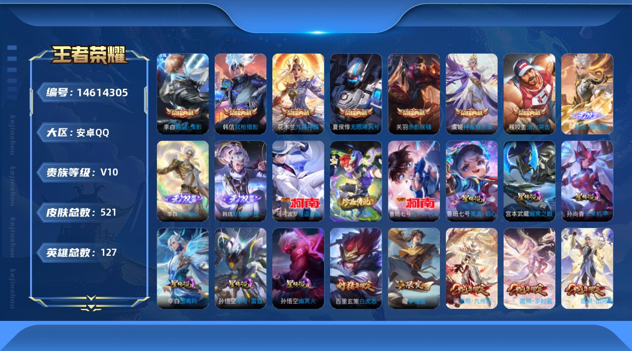das7910 禁止排行榜明年3月解封可二次 安卓q-v10(流光积分27755)-521皮肤7典藏3无双3珍品传说6星传说64传说166史诗 零号雷霆 玉鸾吟 寅虎焰心 幽冥火 幽冥之眼 未来机甲 【全皮英雄】 韩信全皮 司空震全皮 曜全皮 澜全皮 李白全皮 李信全皮 海诺全皮 鬼谷子全